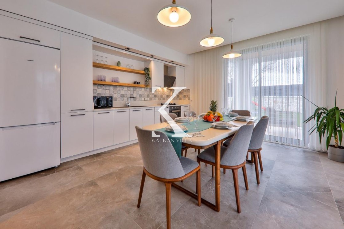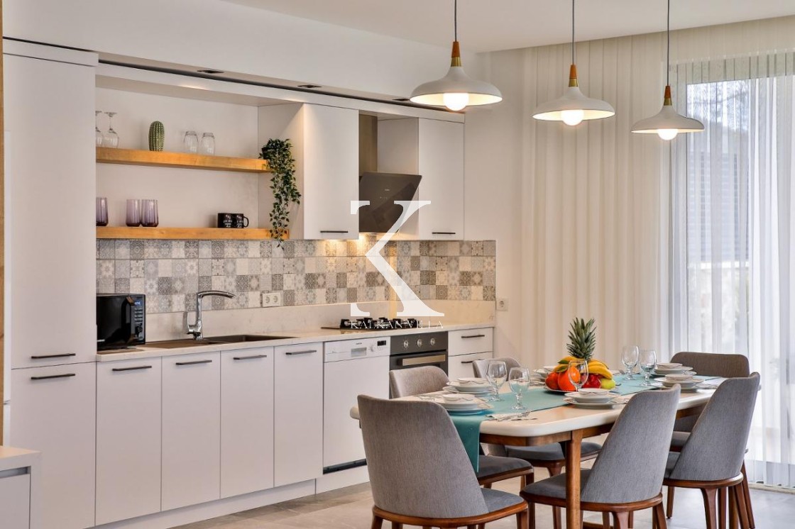 Modern yapıya sahip Amerikan tip mutfakta, konforlu bir tatil için ihtiyaç duyacağınız tüm ekipmanlar yer almaktadır: