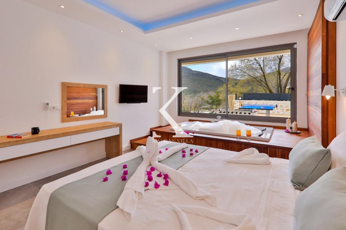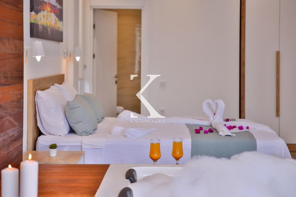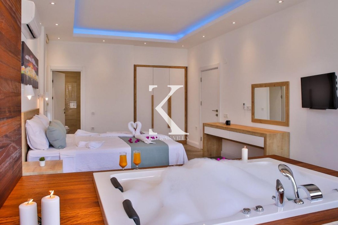 Çift kişilik yatak, klima, komodin, elbise dolabı, makyaj masası, jakuzi, banyo & WC.