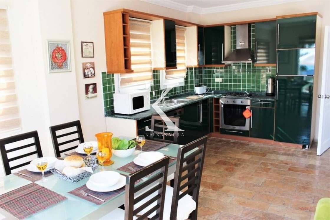 Modern mutfak: buzdolabı, çamaşır makinesi, bulaşık makinesi, elektrikli su ısıtıcısı, mikrodalga fırın, ankastre fırın, 4’lü ocak; havuz başına çıkış.