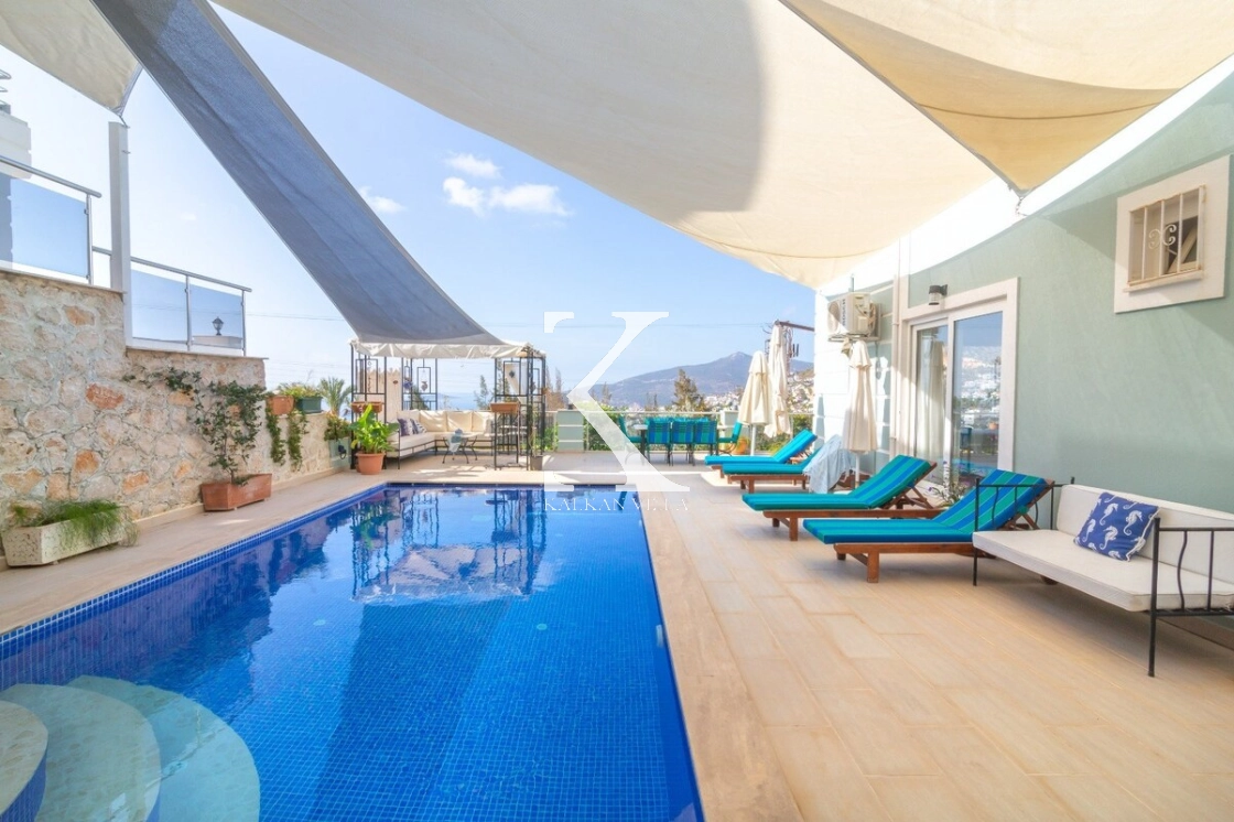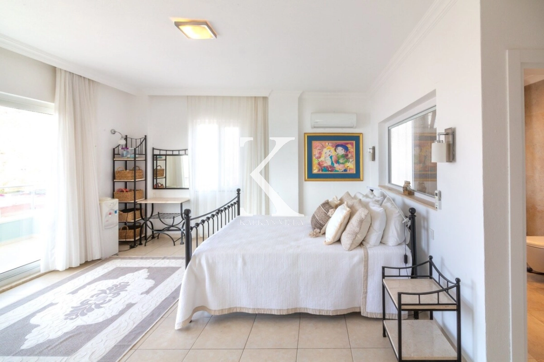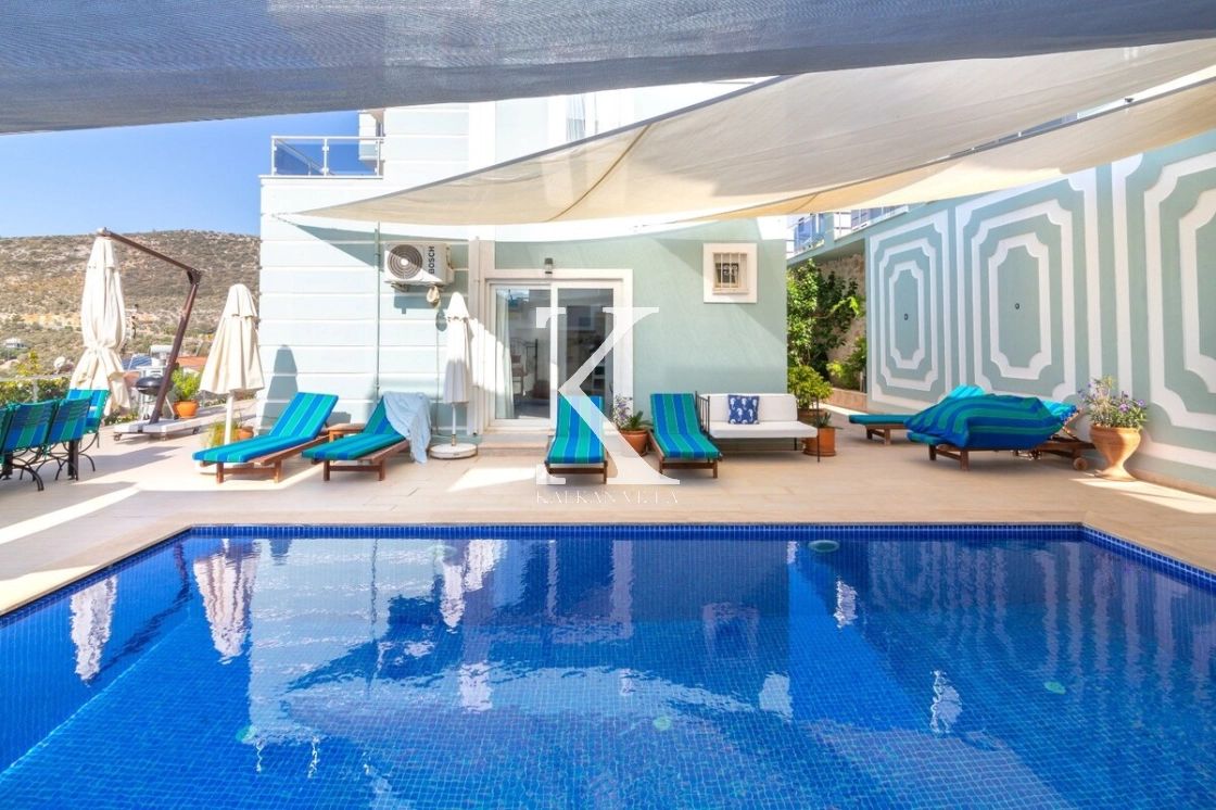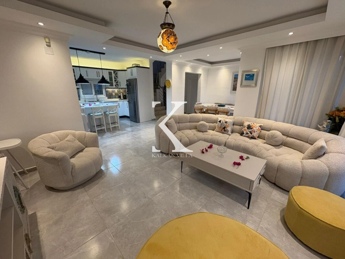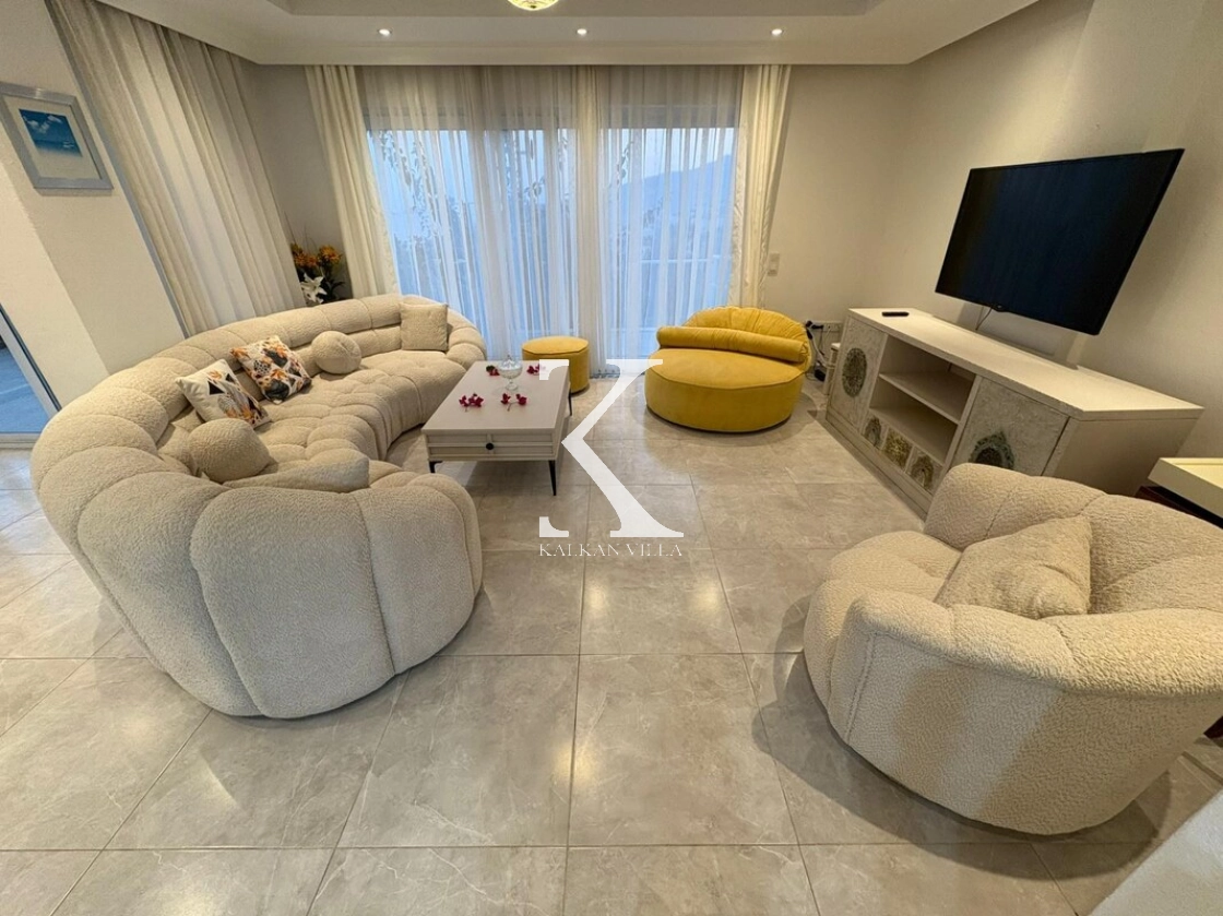 Kalkan merkeze ve plaja olan yakınlığı sayesinde tatil boyunca ulaşım kolaylığı sağlar. Modern mimarisi ve ferah tasarımıyla dikkat çeken villanın salonu, deniz manzarasına açılan geniş cam kapıları sayesinde gün boyu doğal ışık alır.