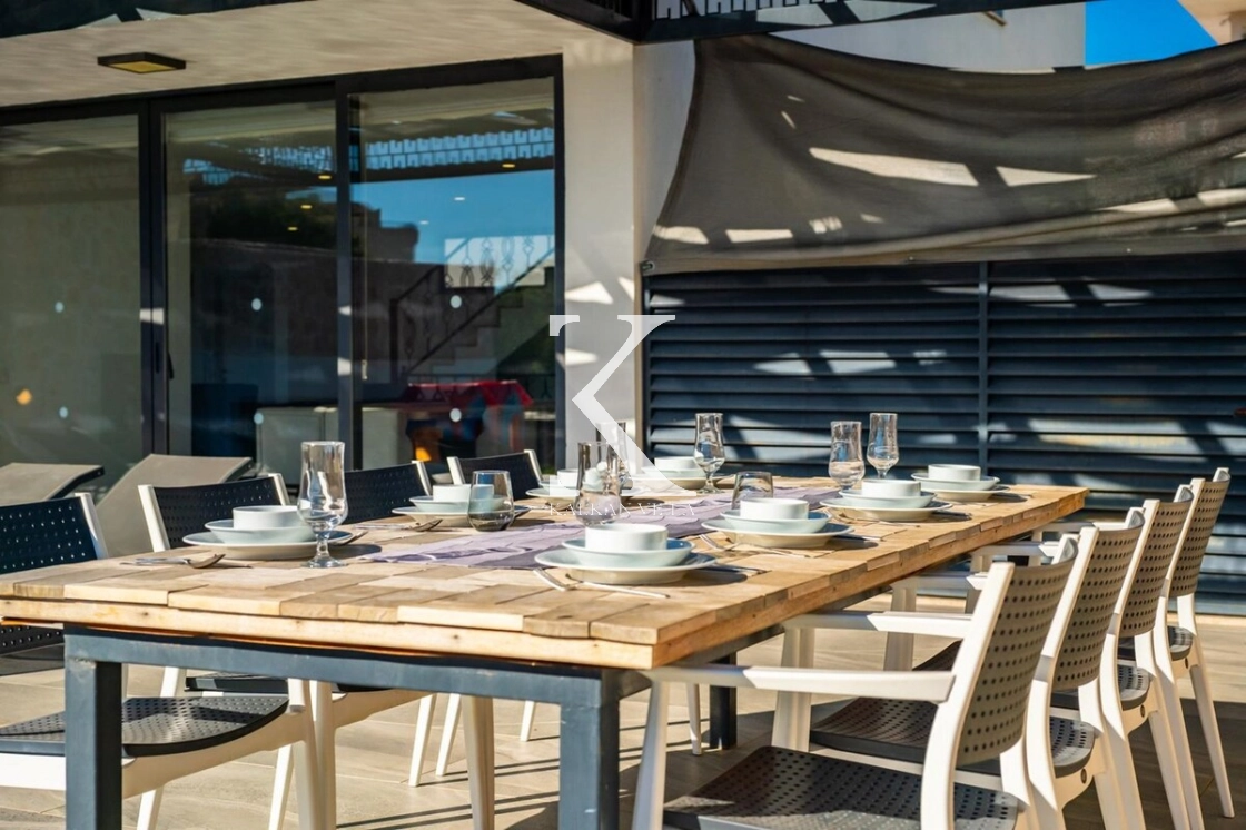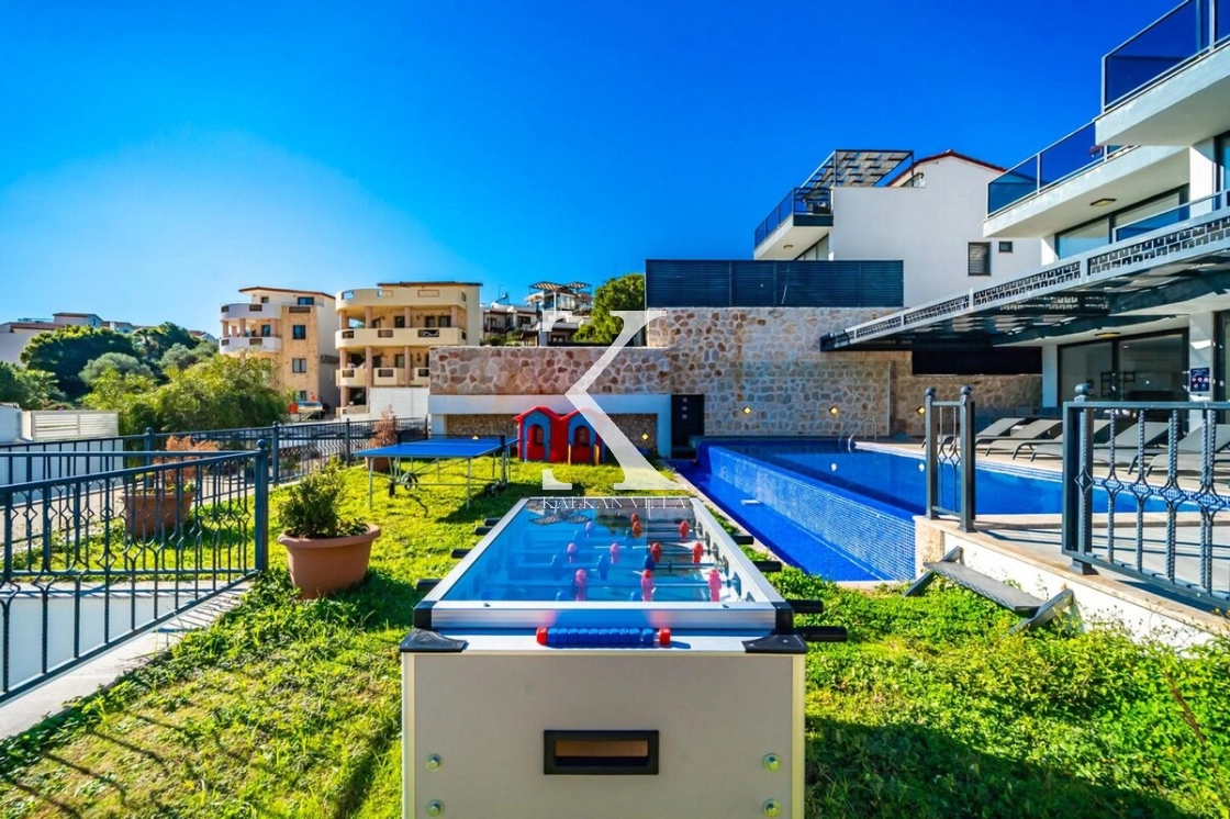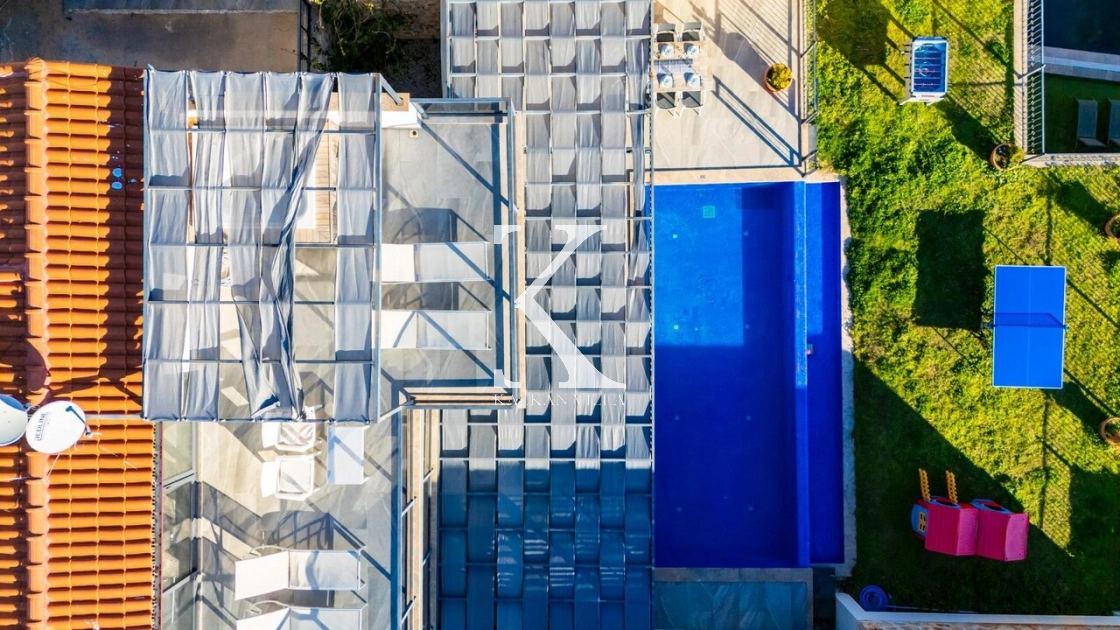 Villanın bahçesi; özel yüzme havuzu, şezlonglar, güneş şemsiyeleri, rahat oturma köşesi, yemek masası ve barbekü alanı ile donatılmıştır. Açık havada keyifli vakit geçirmek isteyen misafirler için tüm detaylar düşünülmüştür.