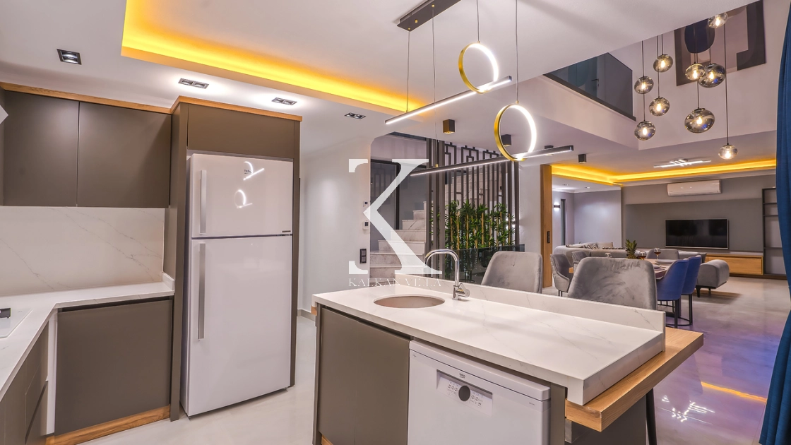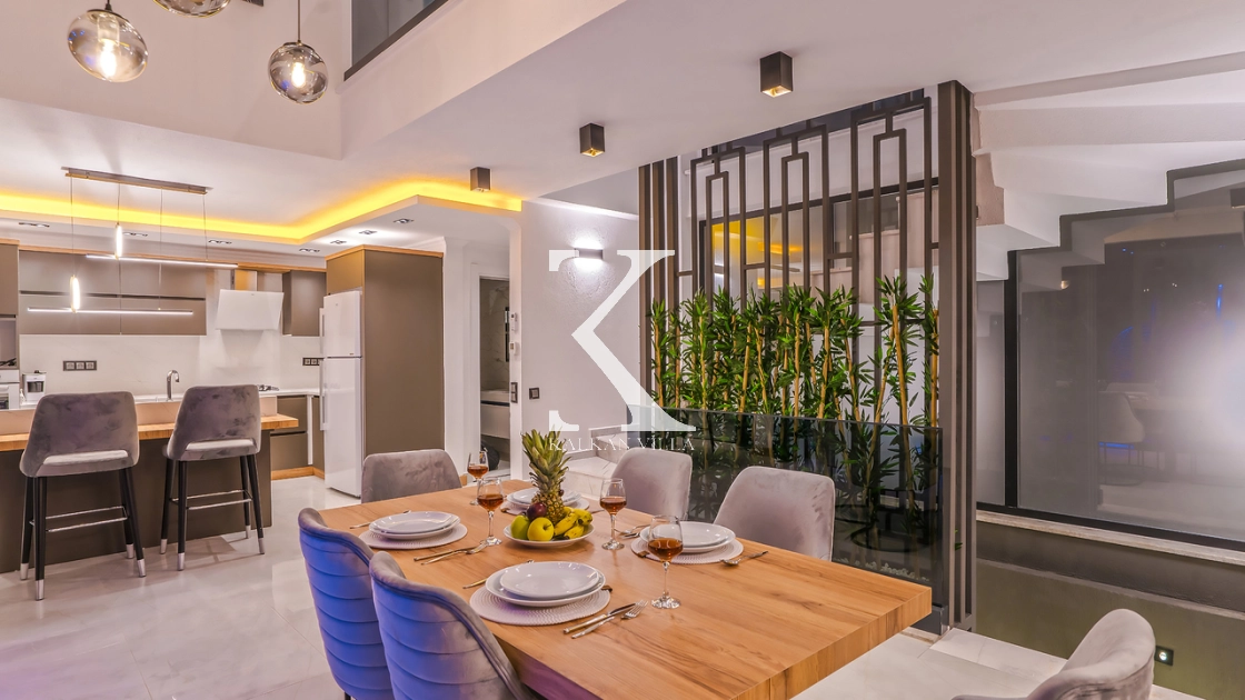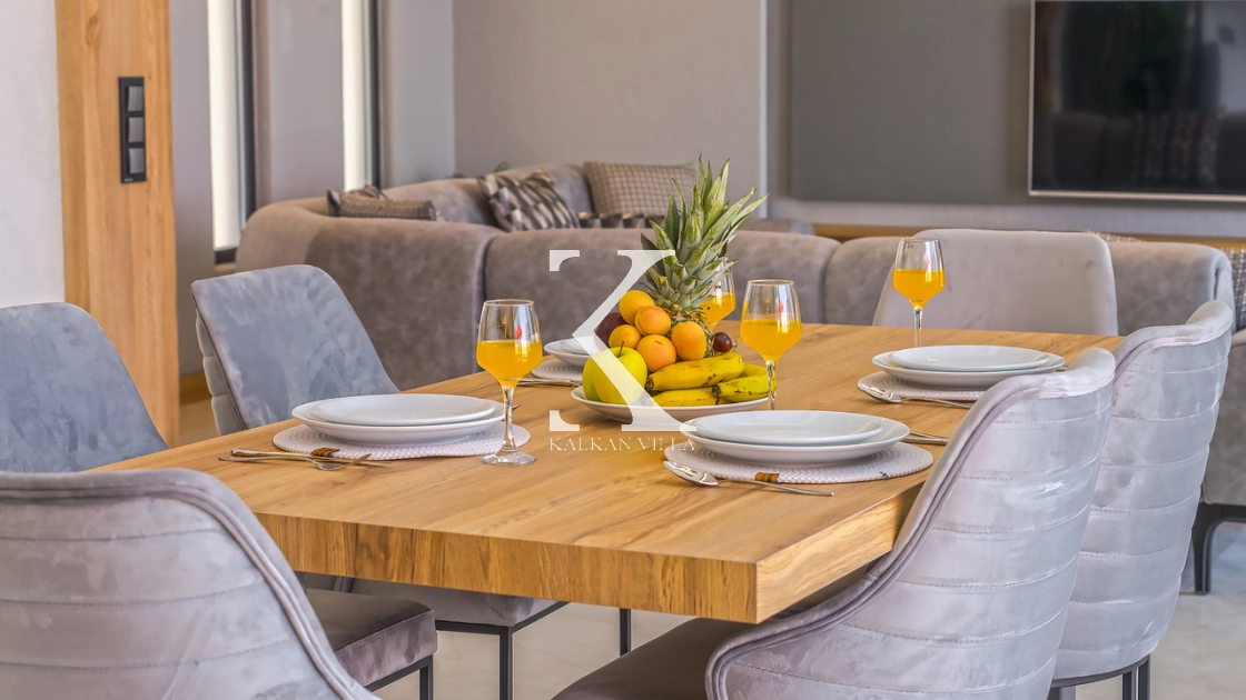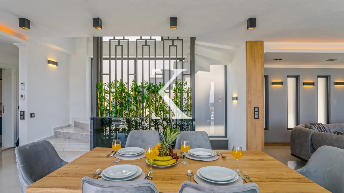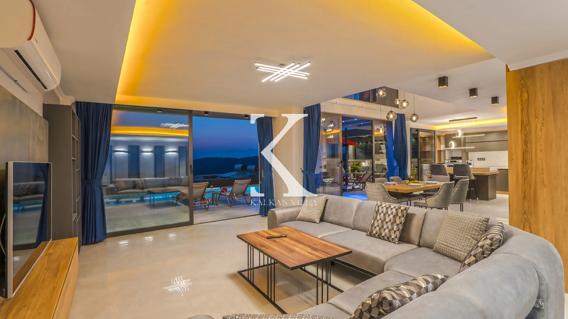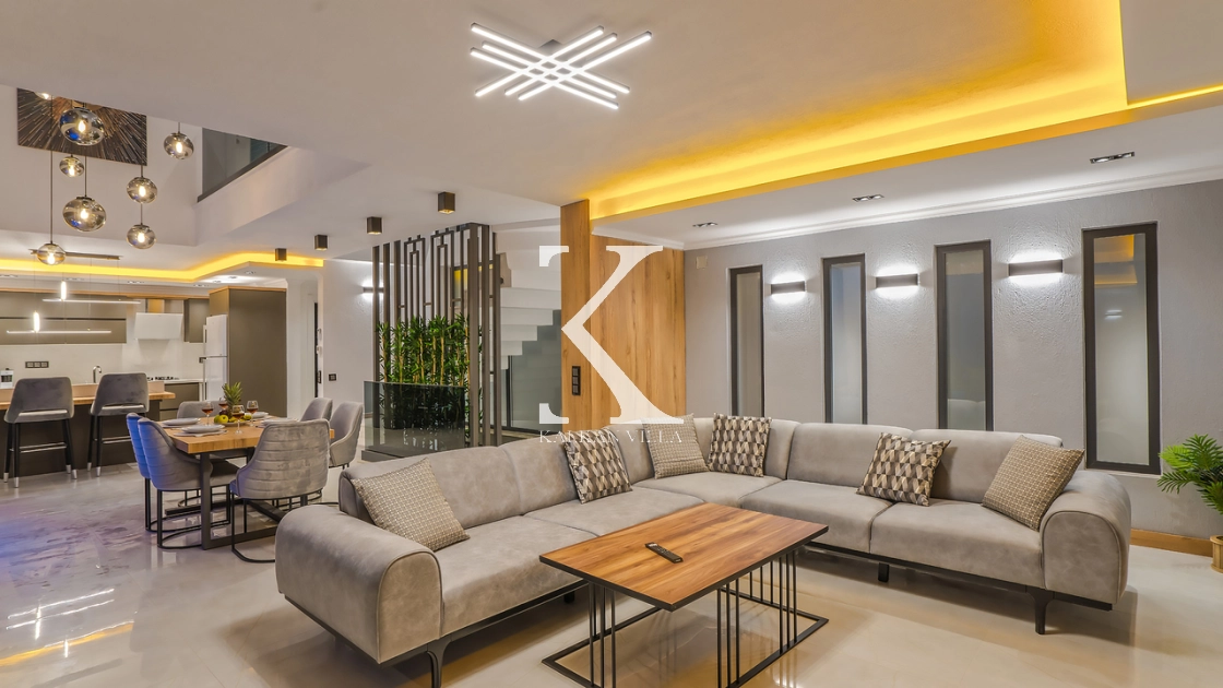 Modern ve şık şekilde dekore edilmiş salon içerisinde konforlu oturma grubu, TV ve klima bulunmaktadır. Salondan havuz terasına doğrudan çıkış mevcuttur.