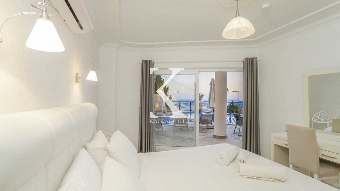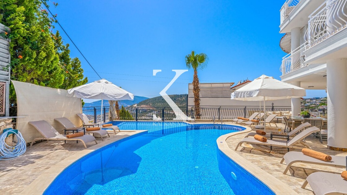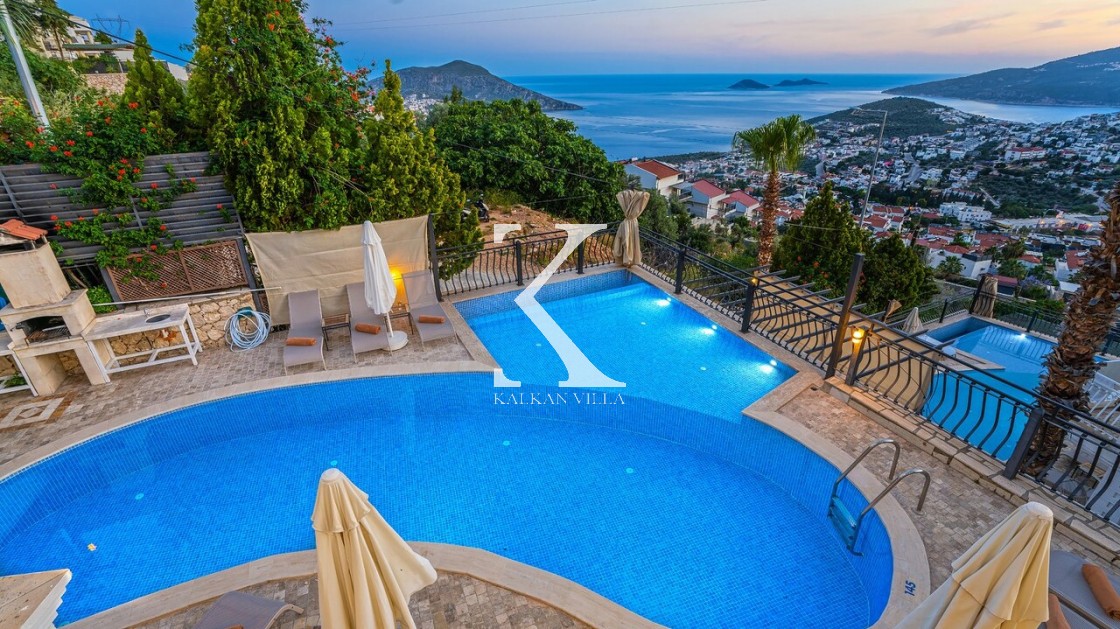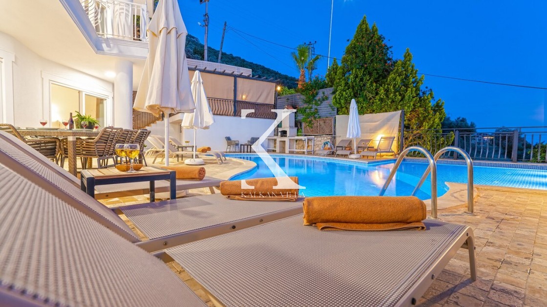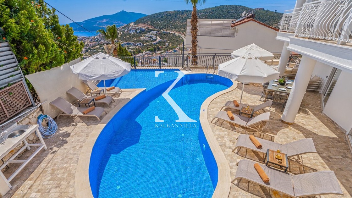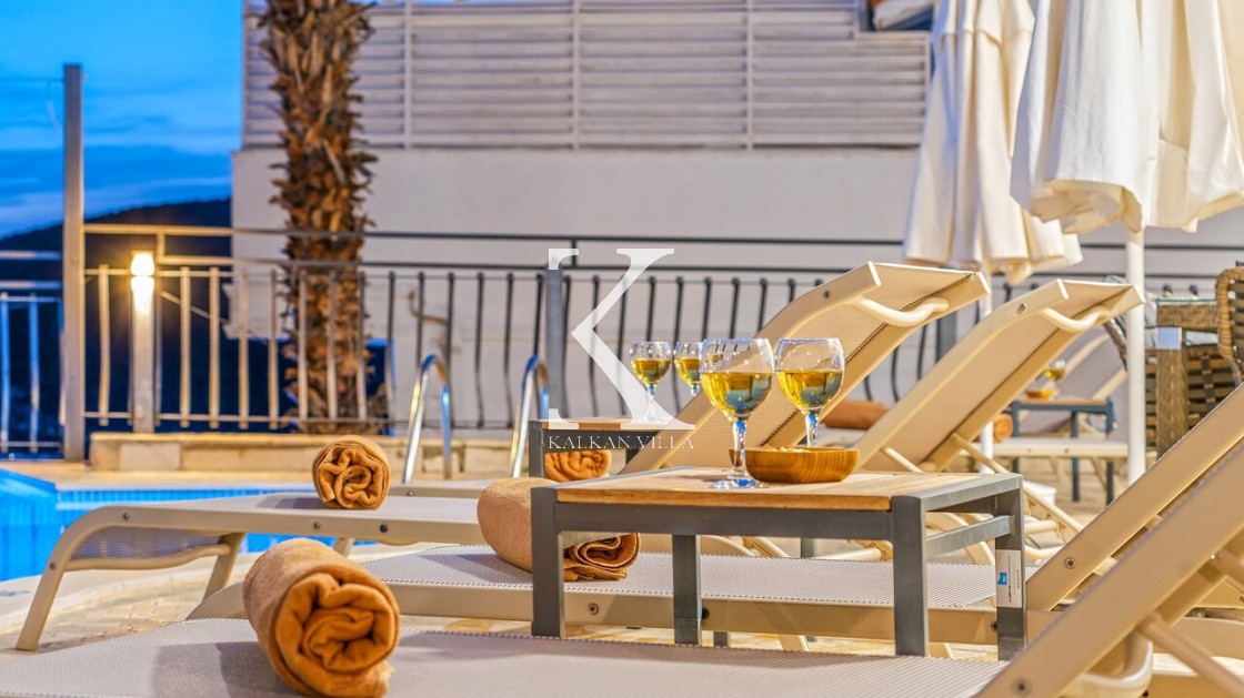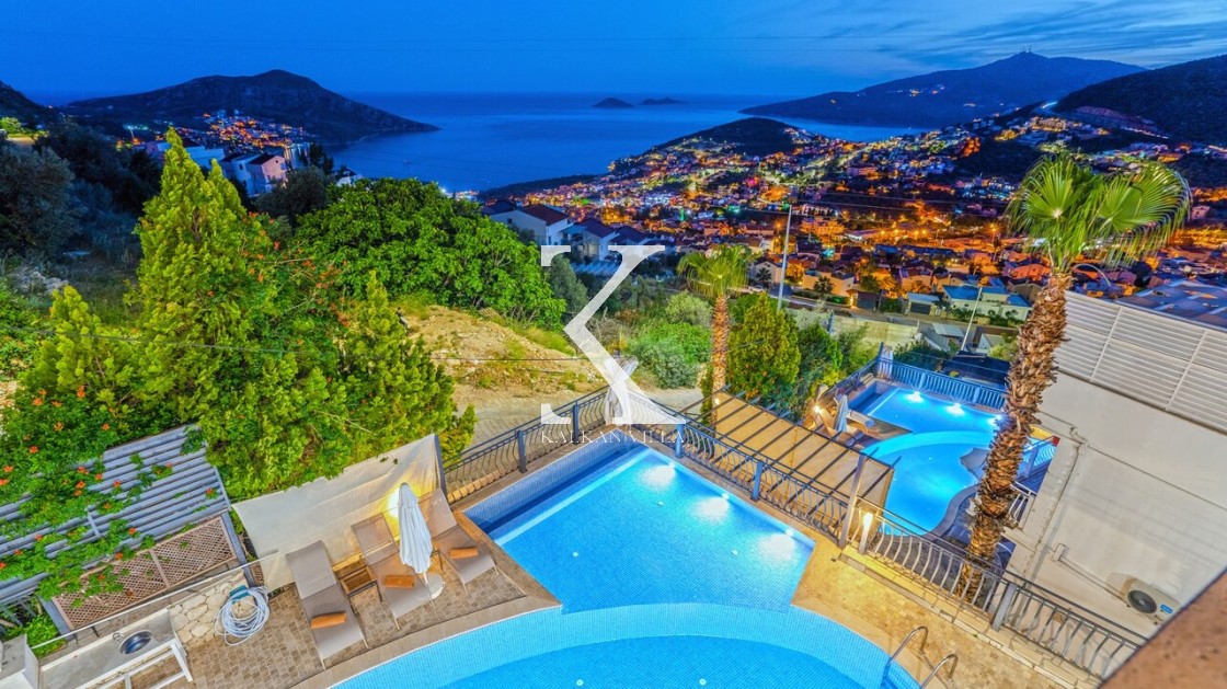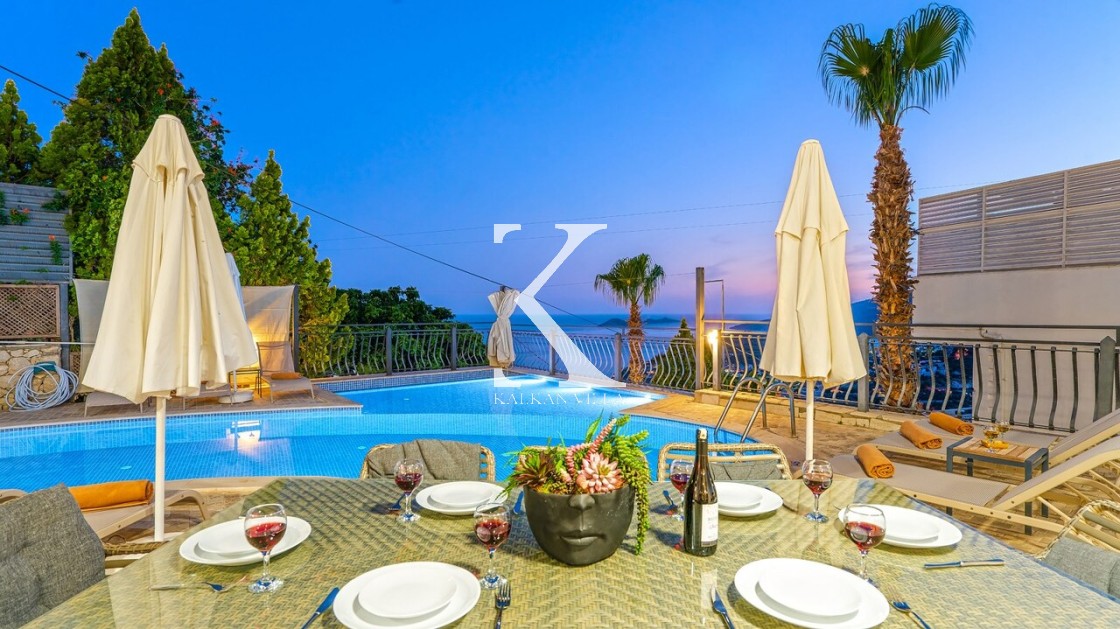 5 süit oda – 10 kişi, tripleks mimari, korunaklı bahçe ve ısıtmalı kapalı havuz. Kalkan Koyu’na hâkim panoramik manzara.