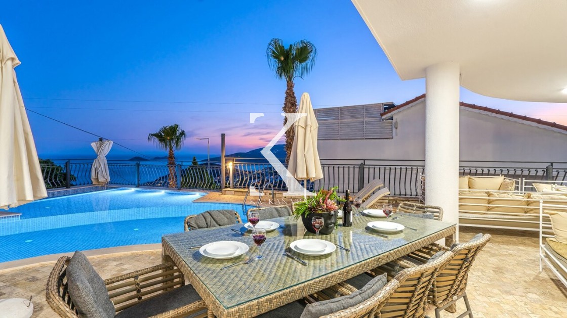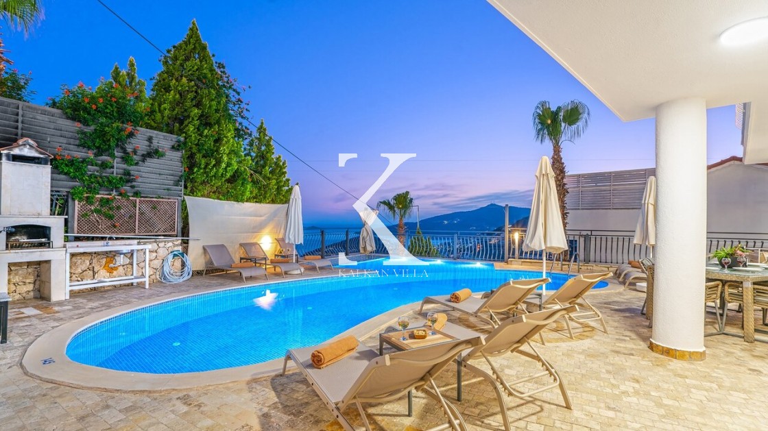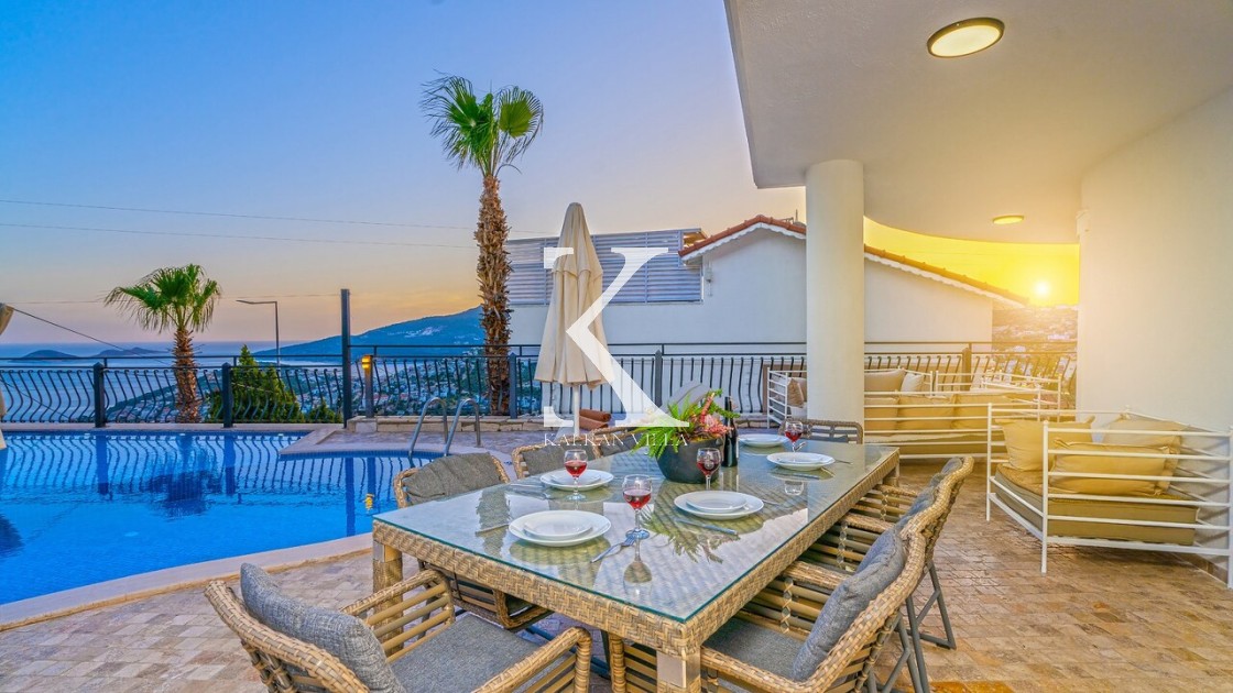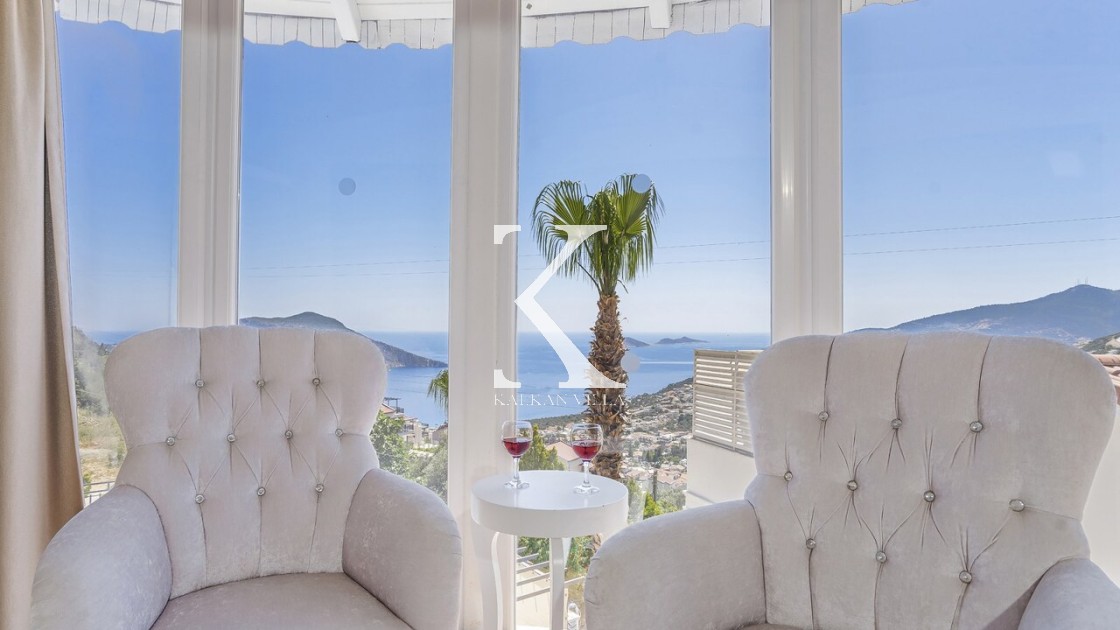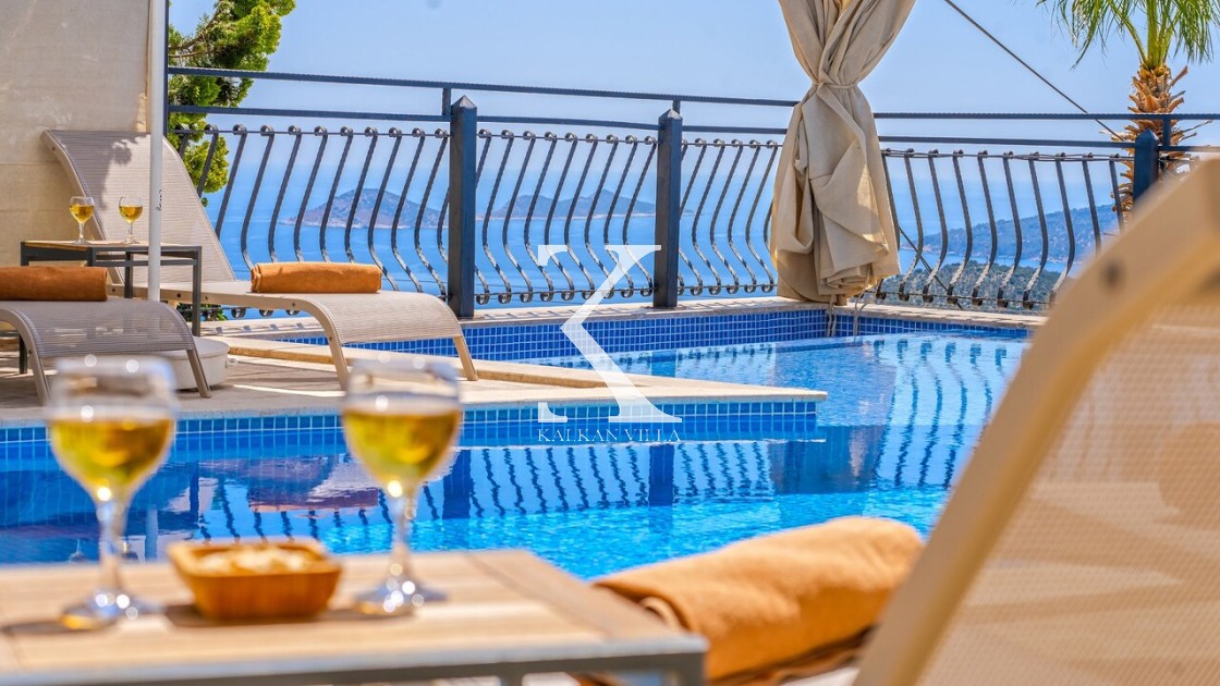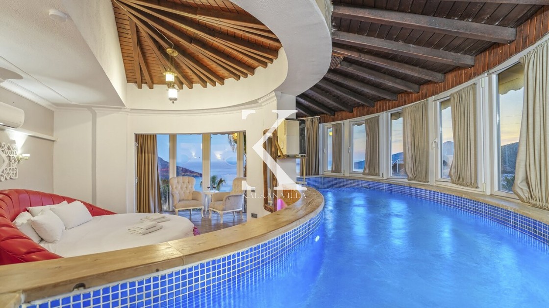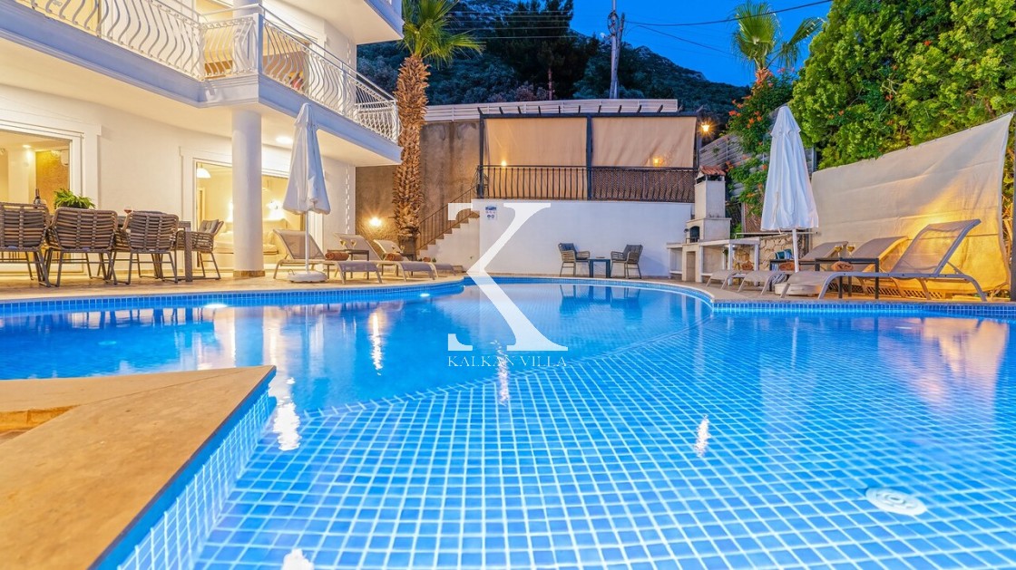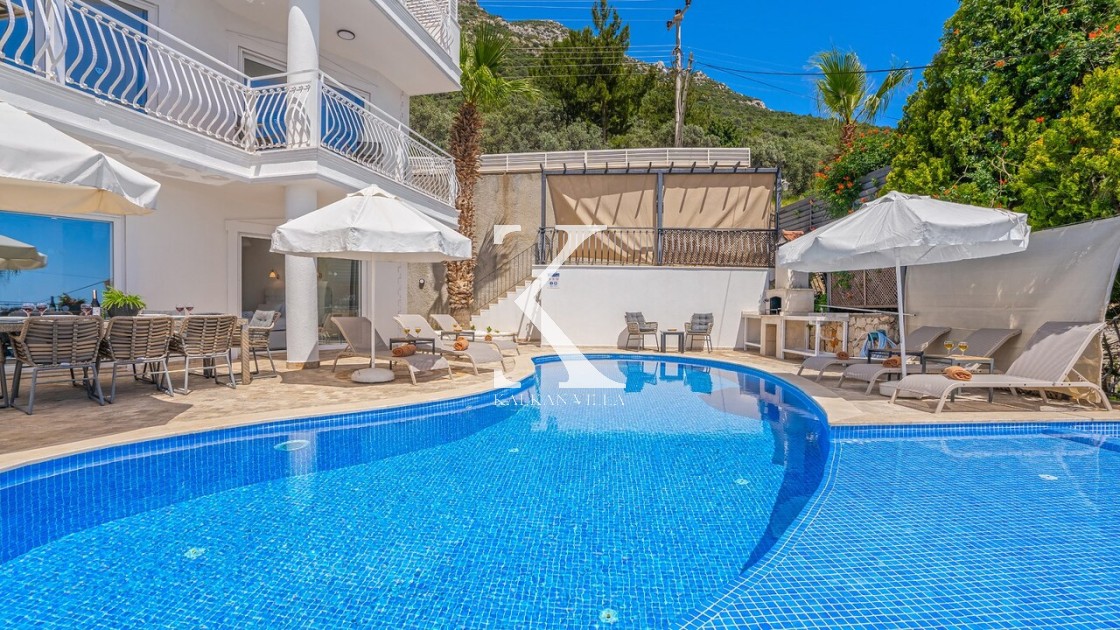 5 süit oda – 10 kişi, tripleks mimari, korunaklı bahçe ve ısıtmalı kapalı havuz. Kalkan Koyu’na hâkim panoramik manzara.