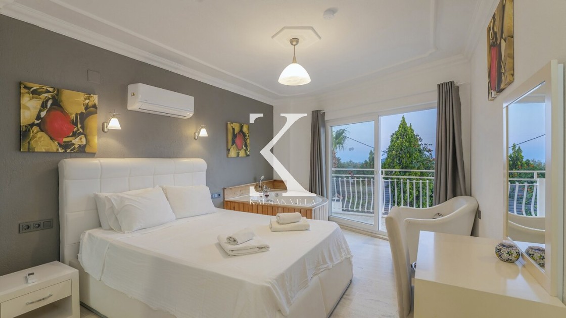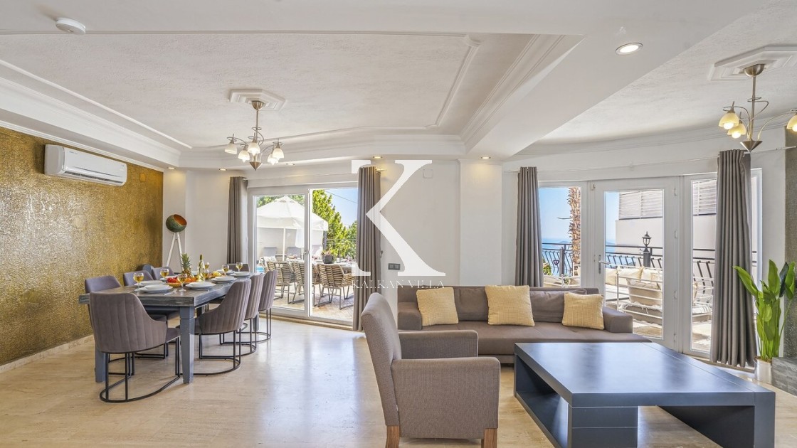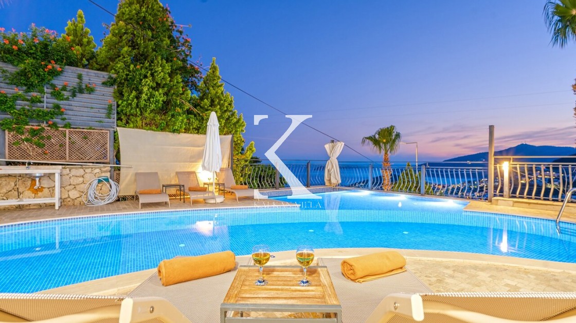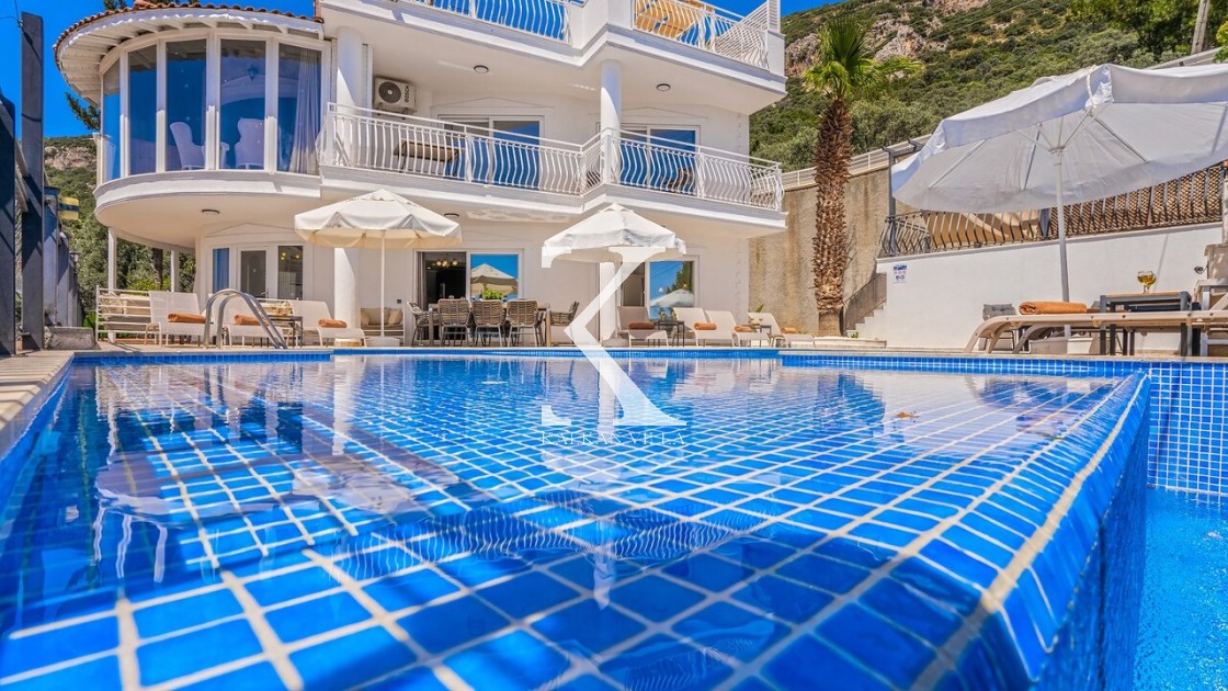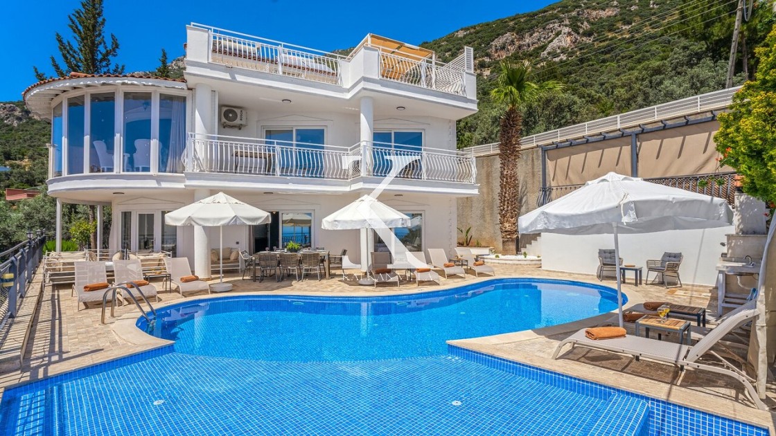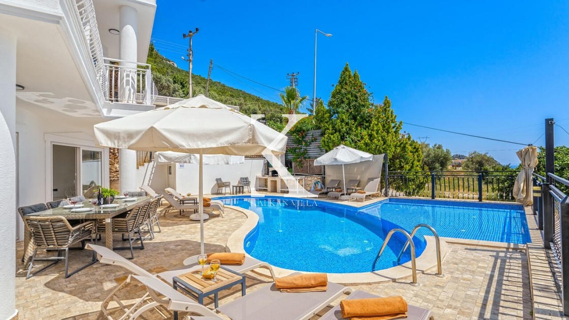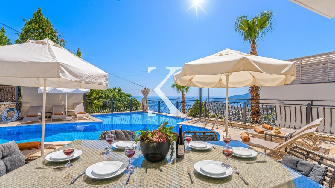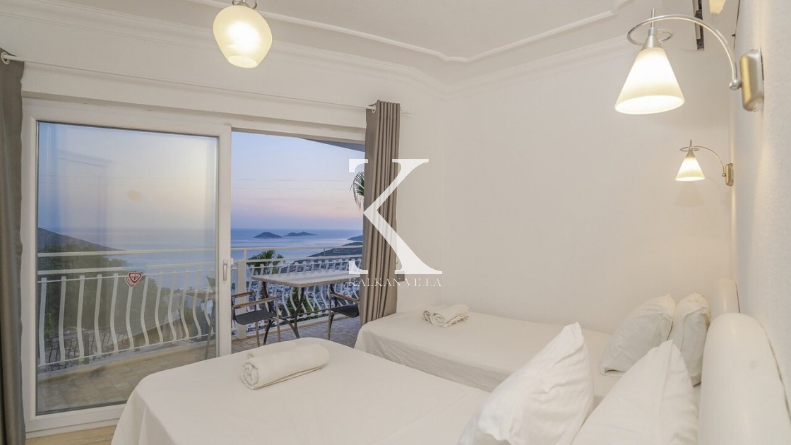 5 süit oda – 10 kişi, tripleks mimari, korunaklı bahçe ve ısıtmalı kapalı havuz. Kalkan Koyu’na hâkim panoramik manzara.