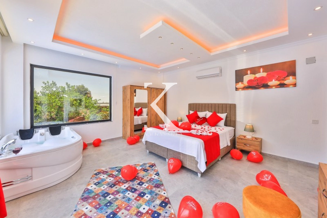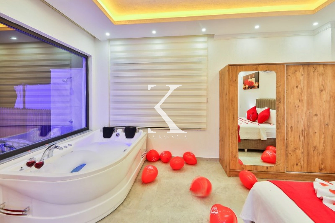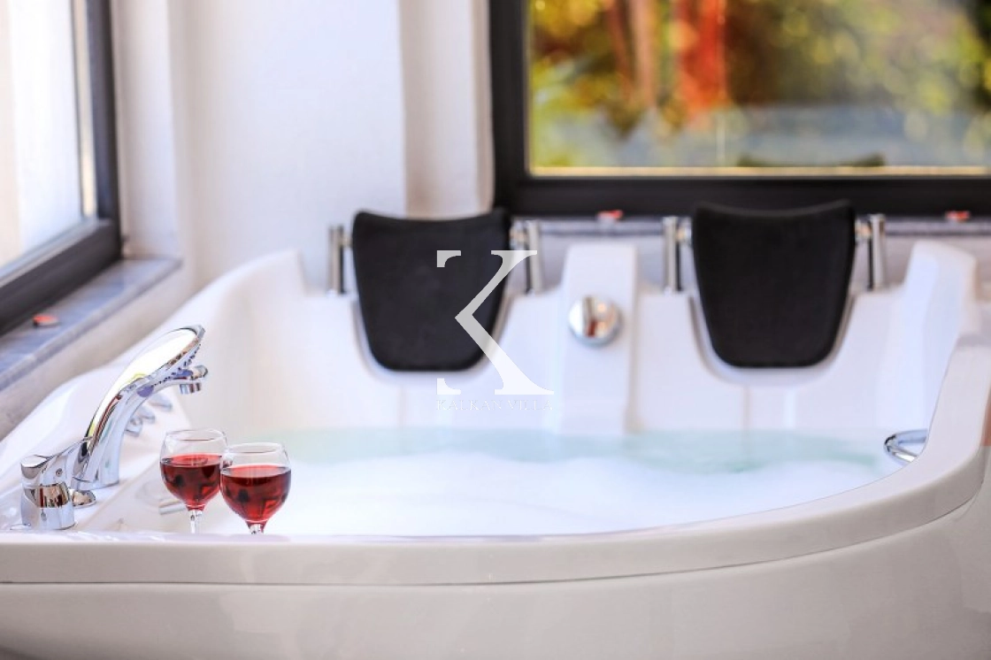 Yatak odalarından birinde yer alan özel jakuzi, misafirlere doğanın kalbinde rahatlatıcı bir atmosfer sunar.