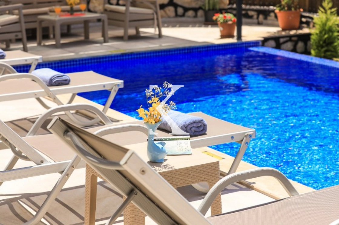 Villanın geniş bahçesinde; özel yüzme havuzu, güneşlenme alanı, şezlonglar, salıncak, oturma grubu ve yemek masası yer almaktadır.