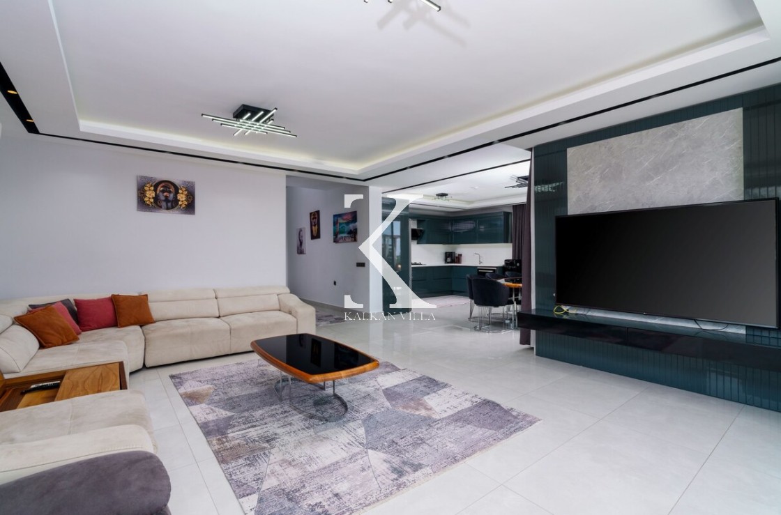 Krem renkli oturma grubu ile modern bir atmosfere sahip salonda geniş ekran TV, DVD oynatıcı, uydu alıcısı, klima ve internet bulunmaktadır. Salondan havuz terasına direkt geçiş vardır.