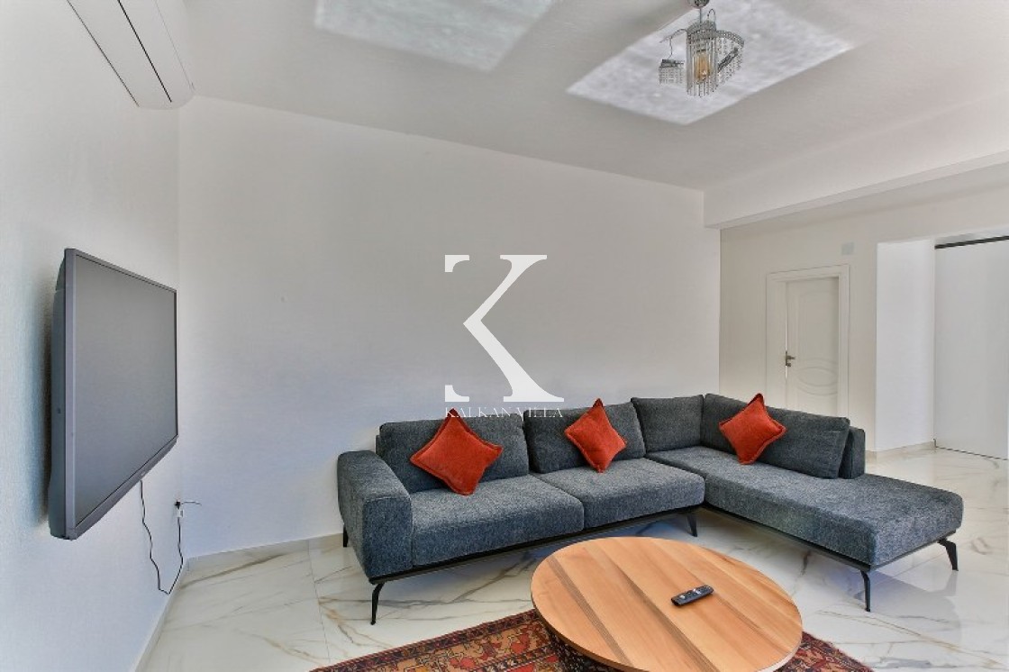 Salon: Aydınlık ve ferah; konforlu oturma grubu, TV, DVD oynatıcı, klima; havuz terasına çıkış.