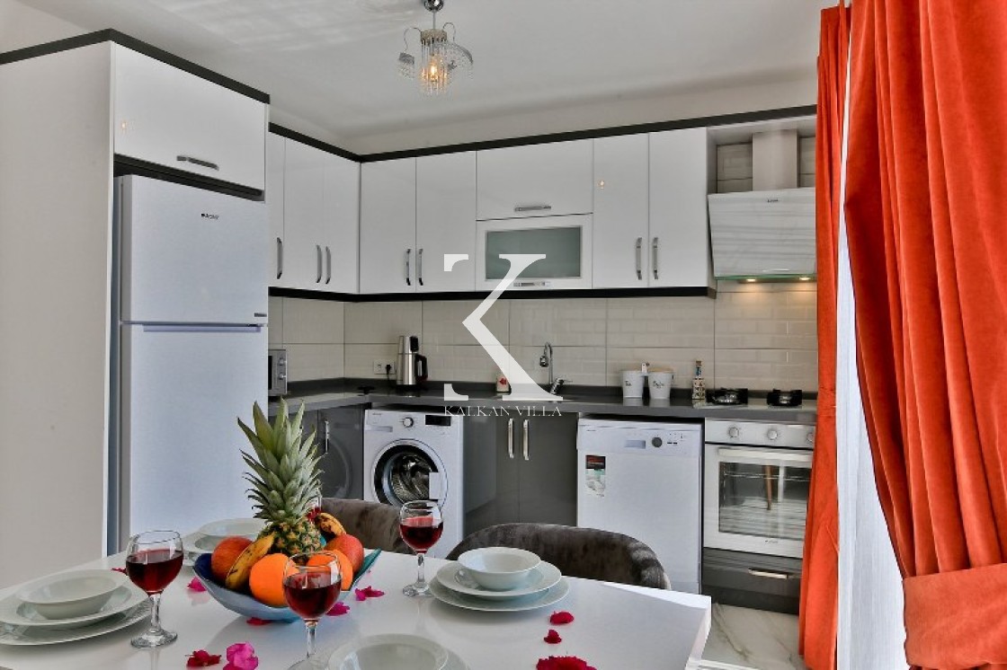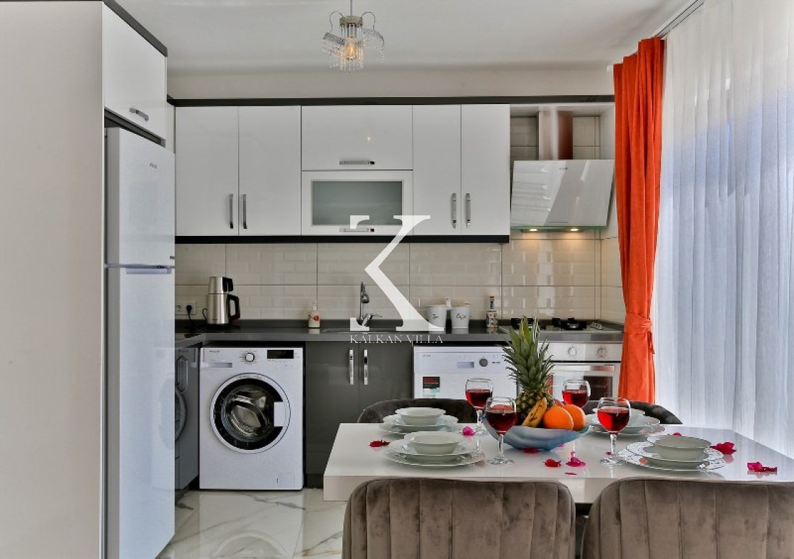 Mutfak (Amerikan): Bulaşık makinesi, buzdolabı, ocak, fırın, su ısıtıcısı, yemek masası, yemek takımı ve pişirme gereçleri.