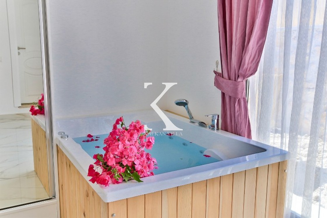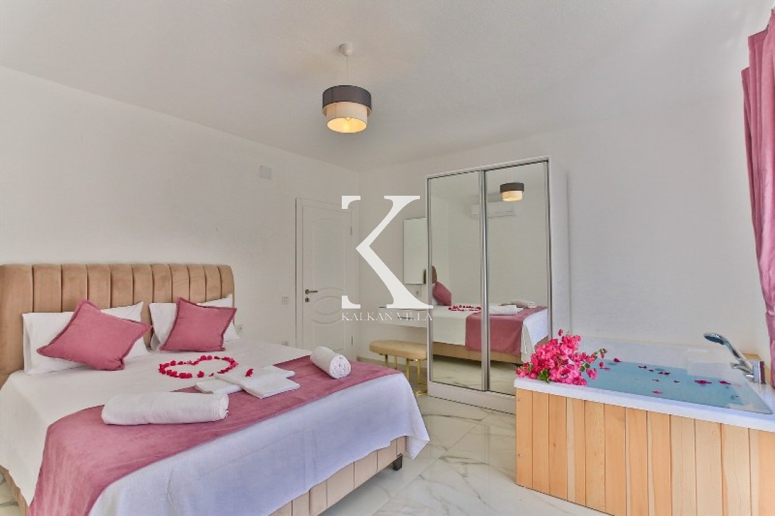 Çift kişilik yatak, elbise dolabı, komodin, klima, jakuzi, banyo & WC.