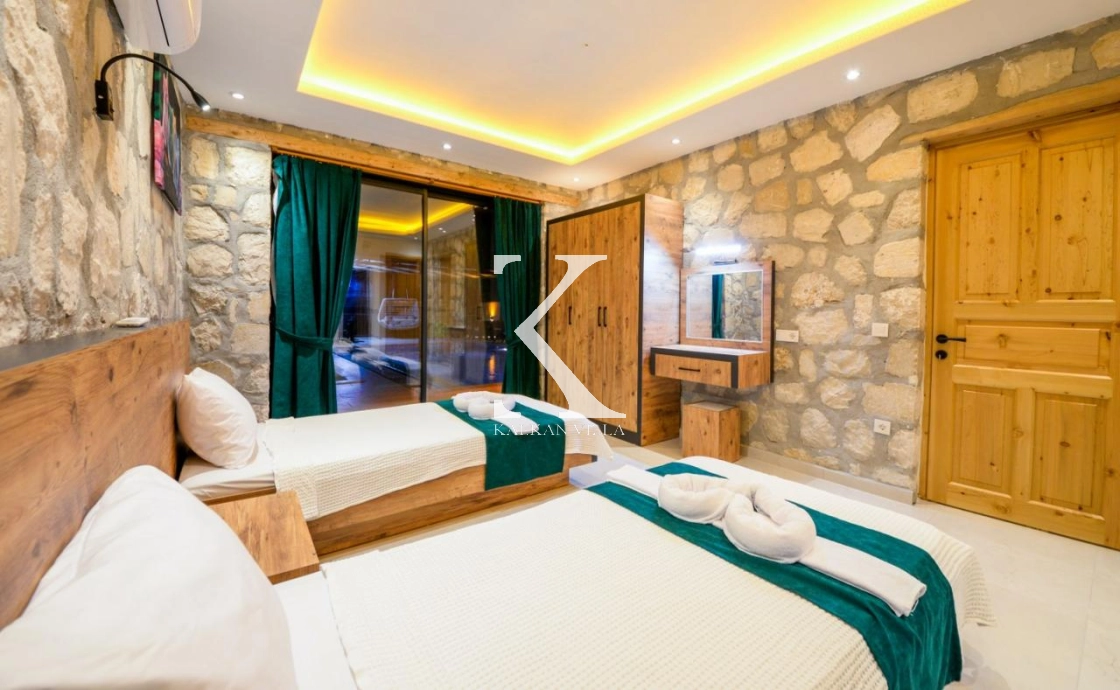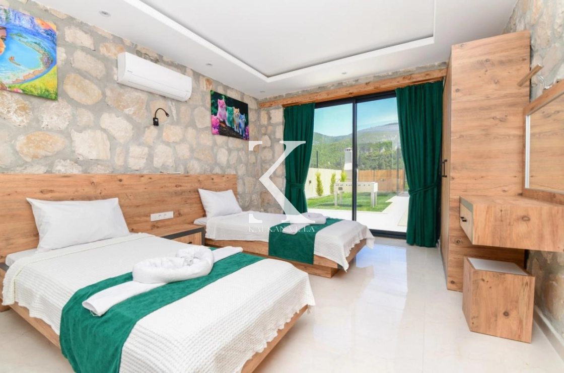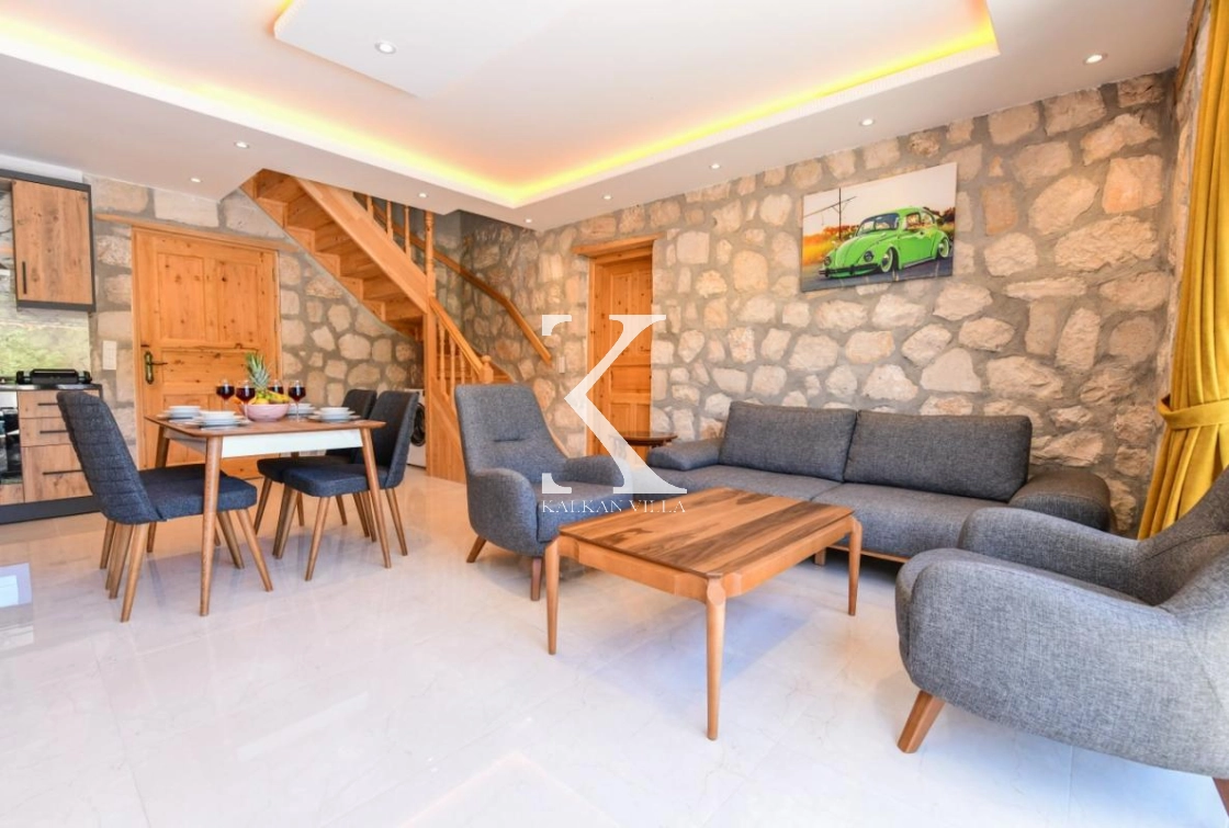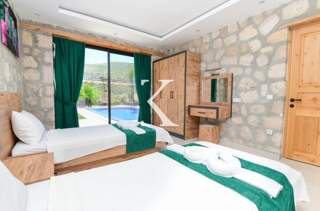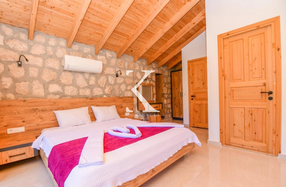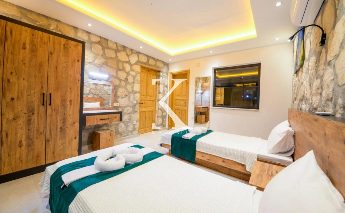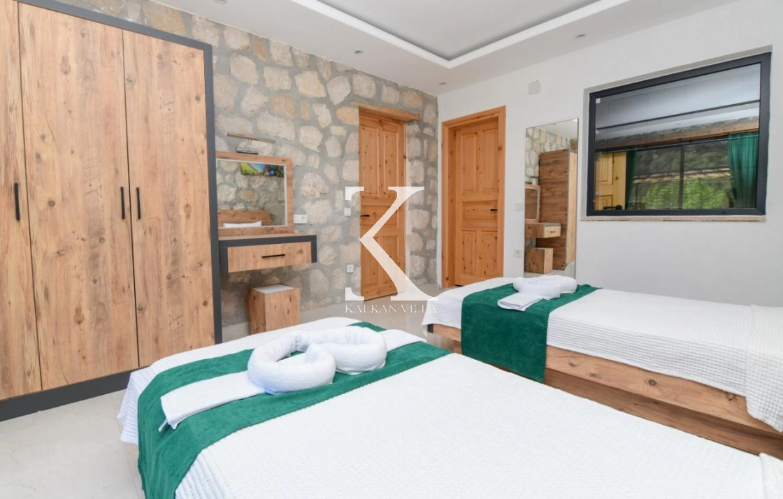 Doğal taş ve ahşap detaylarla dekore edilen villa, doğanın sıcak atmosferini modern konforla birleştirir. Bir yatak odasında çift kişilik yatak, diğer yatak odasında ise iki adet tek kişilik yatak bulunmaktadır. Ferah salon ve kullanışlı Amerikan mutfak alanı sayesinde misafirler ev konforunda bir konaklama deneyimi yaşayabilir.