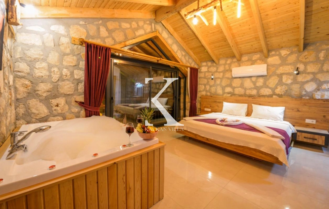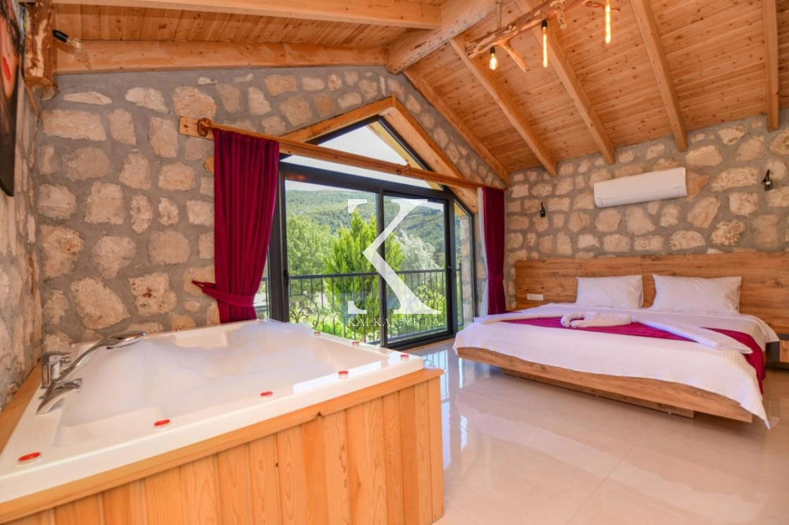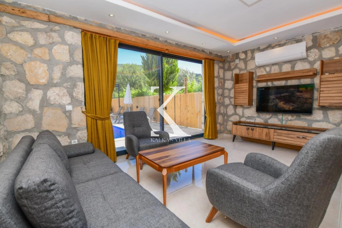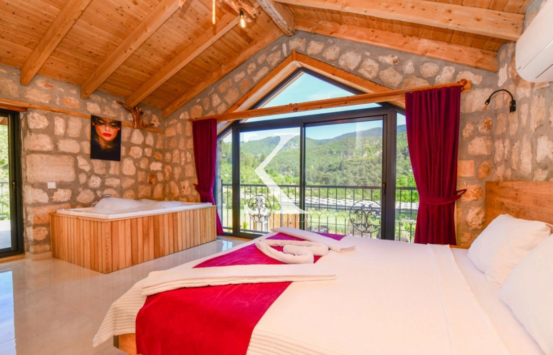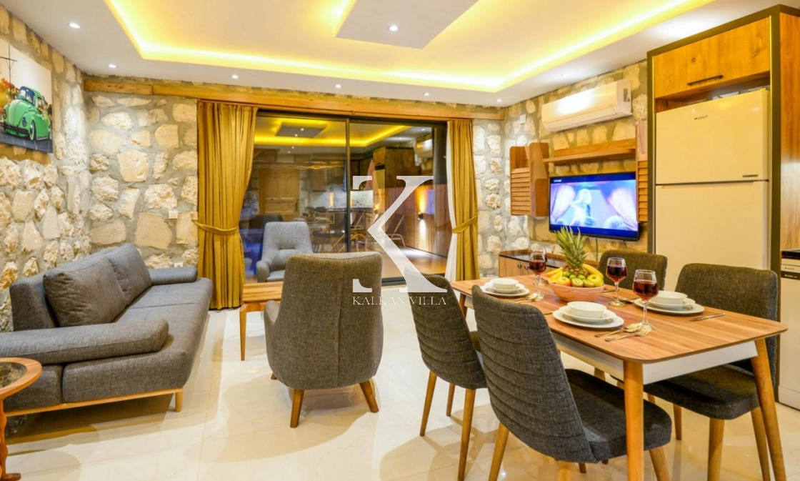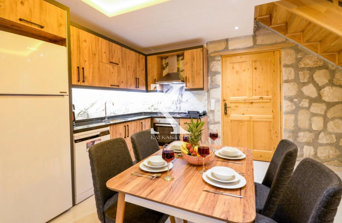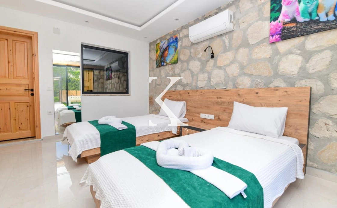 Doğal taş ve ahşap detaylarla dekore edilen villa, doğanın sıcak atmosferini modern konforla birleştirir. Bir yatak odasında çift kişilik yatak, diğer yatak odasında ise iki adet tek kişilik yatak bulunmaktadır. Ferah salon ve kullanışlı Amerikan mutfak alanı sayesinde misafirler ev konforunda bir konaklama deneyimi yaşayabilir.