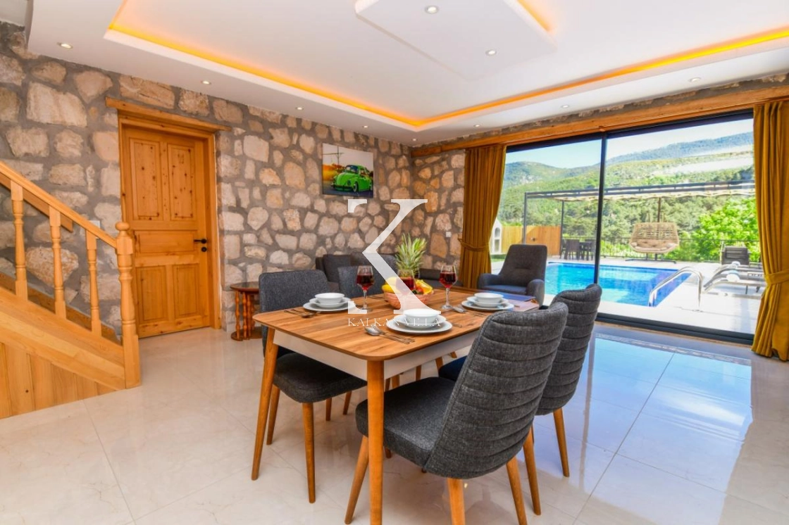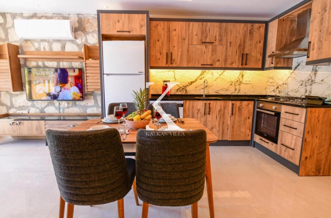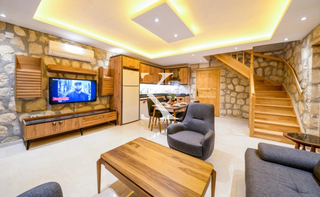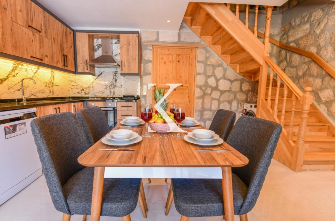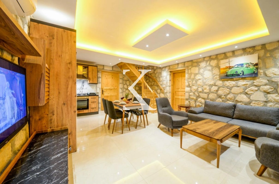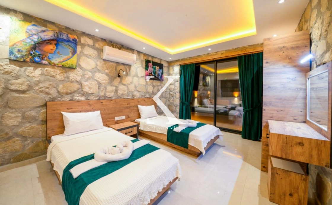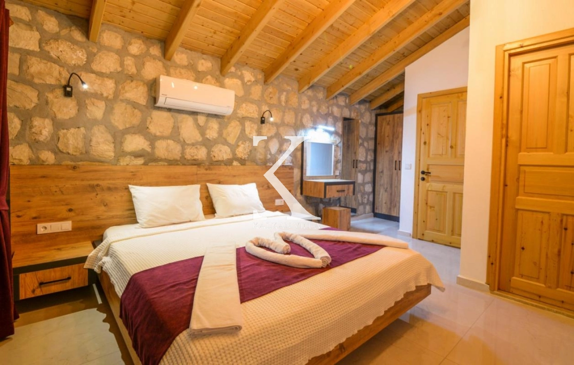 Doğal taş ve ahşap detaylarla dekore edilen villa, doğanın sıcak atmosferini modern konforla birleştirir. Bir yatak odasında çift kişilik yatak, diğer yatak odasında ise iki adet tek kişilik yatak bulunmaktadır. Ferah salon ve kullanışlı Amerikan mutfak alanı sayesinde misafirler ev konforunda bir konaklama deneyimi yaşayabilir.