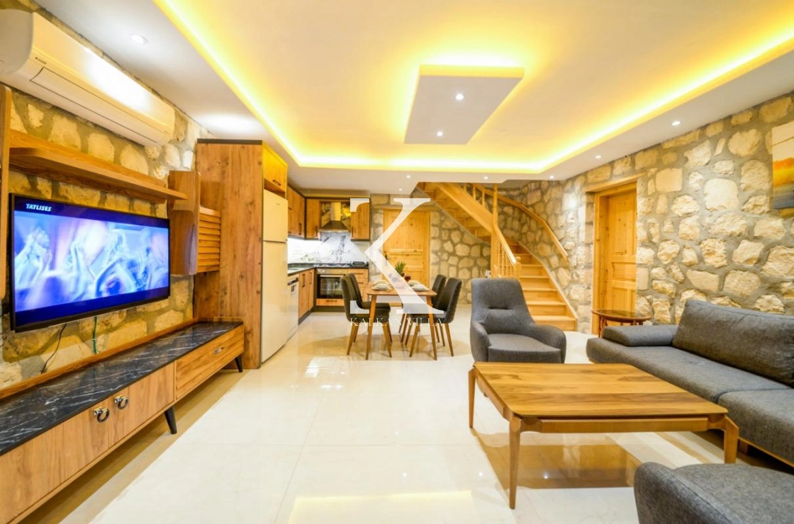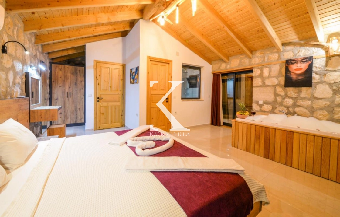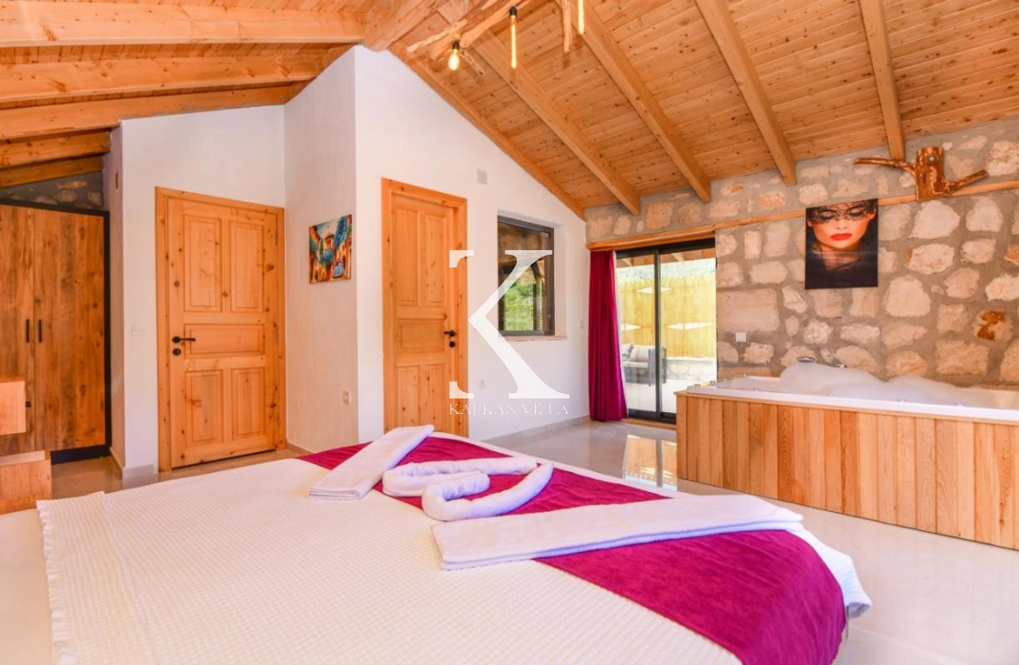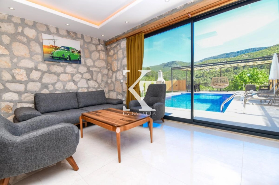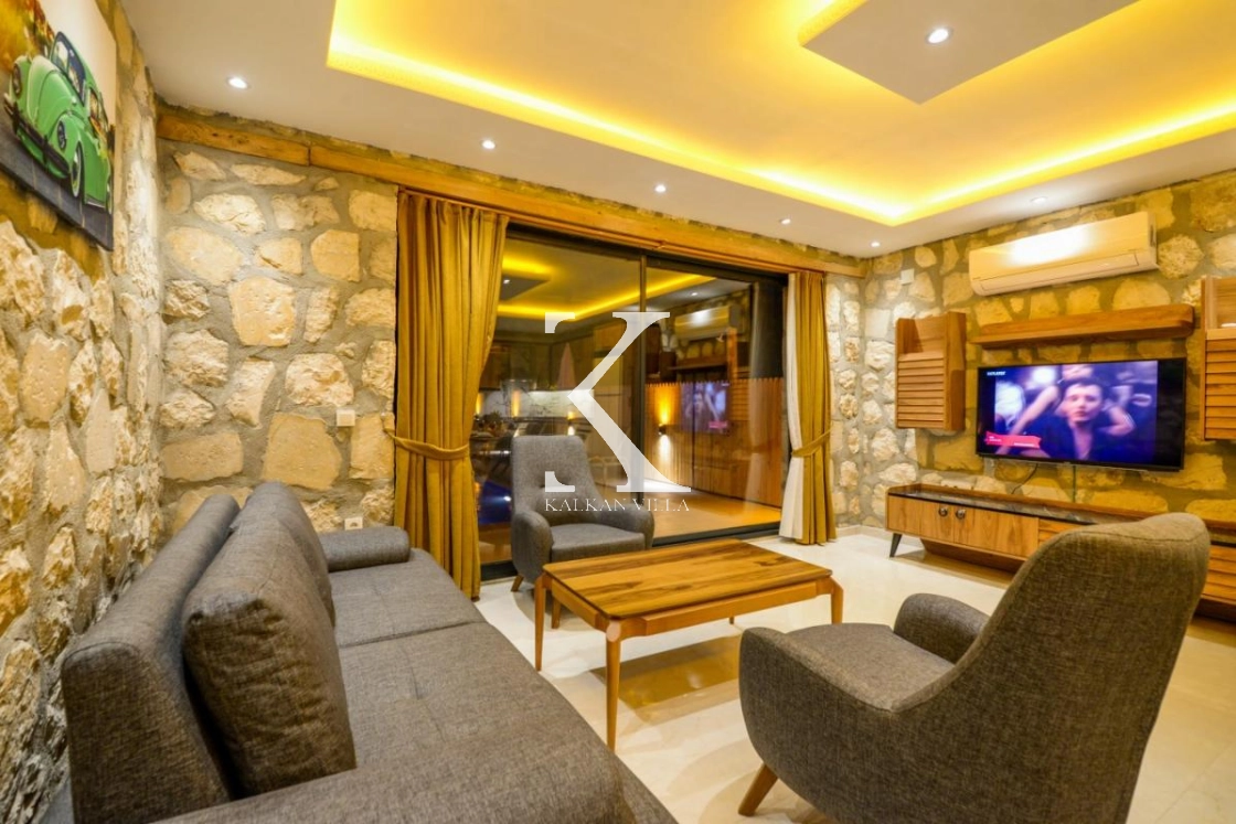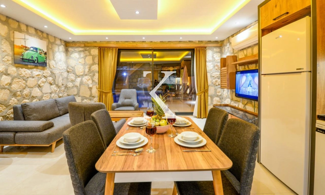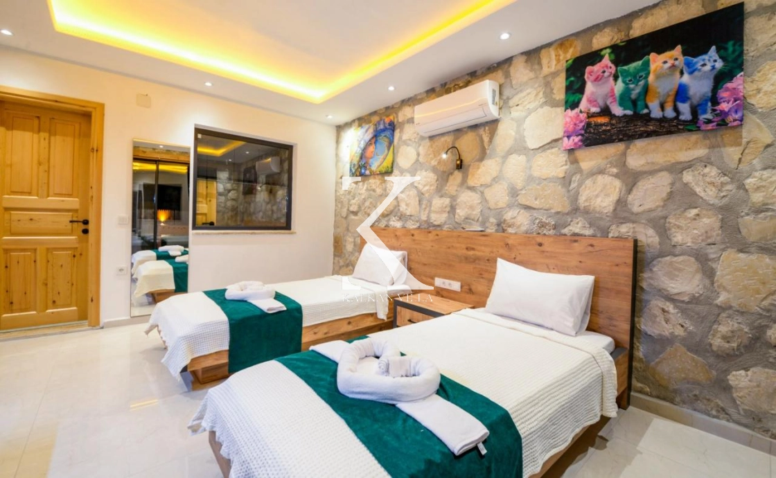 Doğal taş ve ahşap detaylarla dekore edilen villa, doğanın sıcak atmosferini modern konforla birleştirir. Bir yatak odasında çift kişilik yatak, diğer yatak odasında ise iki adet tek kişilik yatak bulunmaktadır. Ferah salon ve kullanışlı Amerikan mutfak alanı sayesinde misafirler ev konforunda bir konaklama deneyimi yaşayabilir.