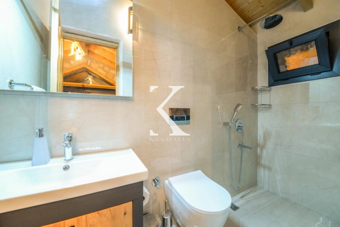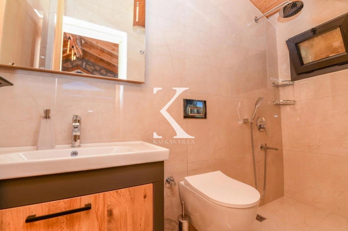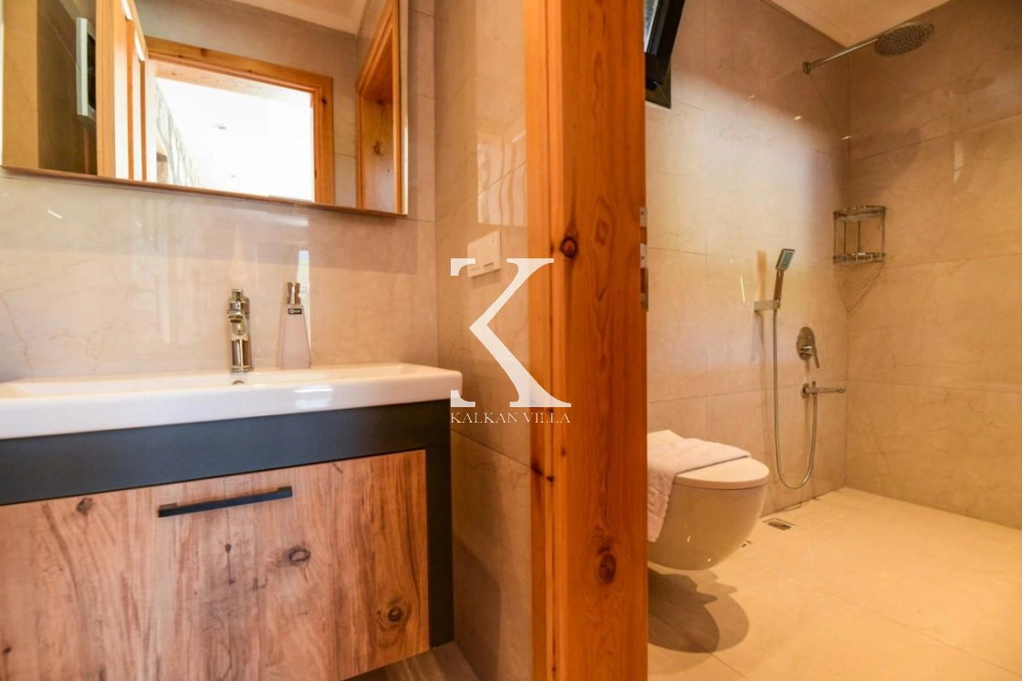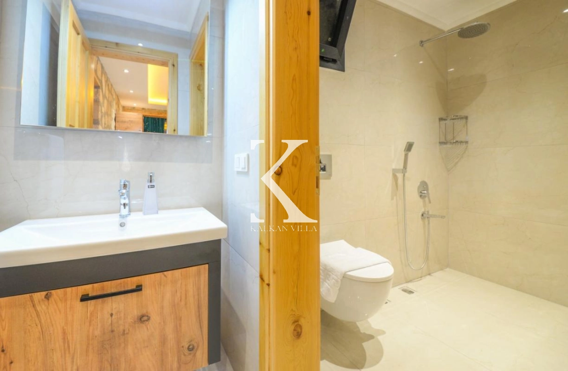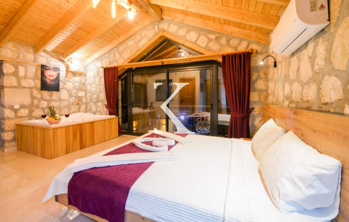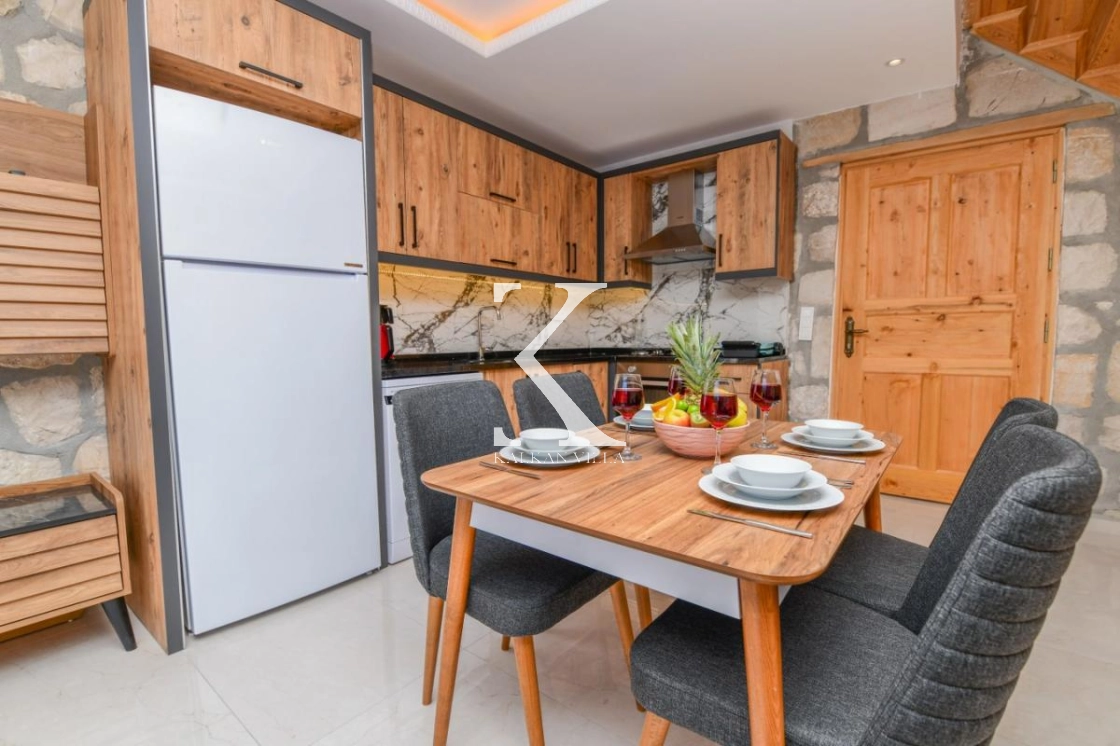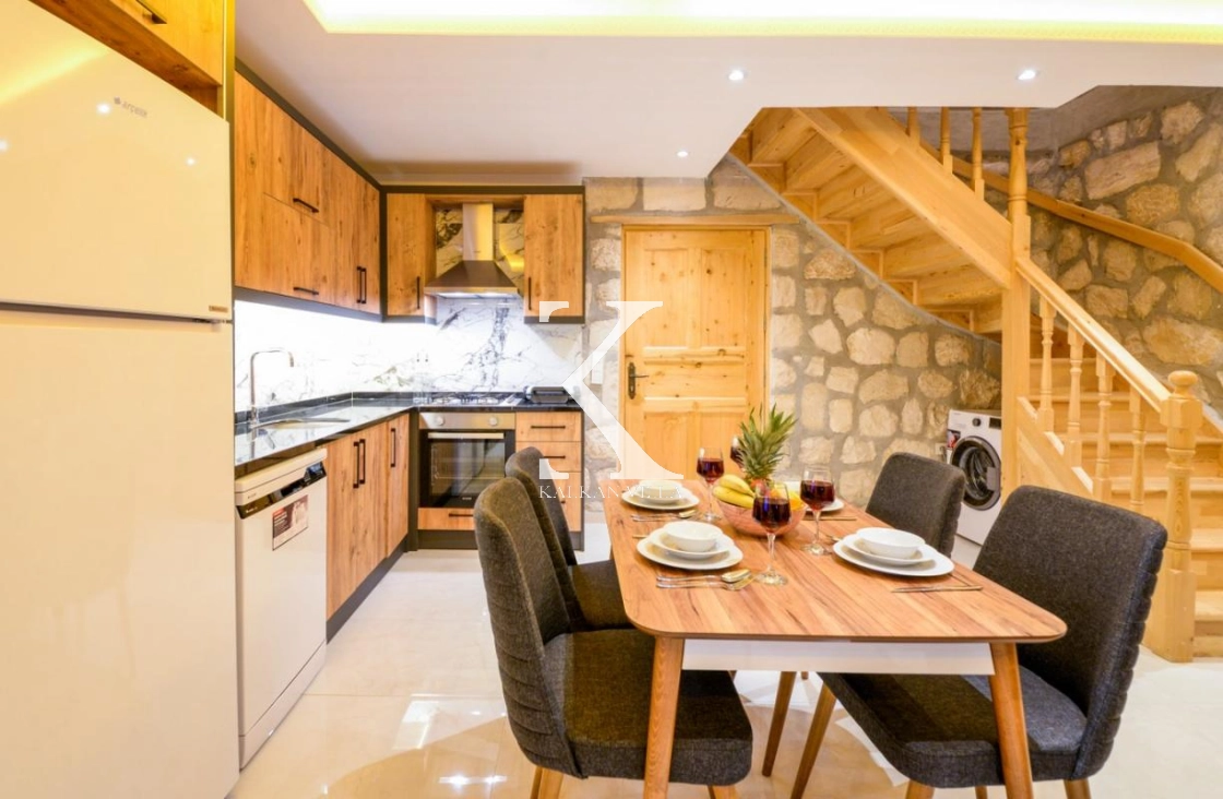 Doğal taş ve ahşap detaylarla dekore edilen villa, doğanın sıcak atmosferini modern konforla birleştirir. Bir yatak odasında çift kişilik yatak, diğer yatak odasında ise iki adet tek kişilik yatak bulunmaktadır. Ferah salon ve kullanışlı Amerikan mutfak alanı sayesinde misafirler ev konforunda bir konaklama deneyimi yaşayabilir.