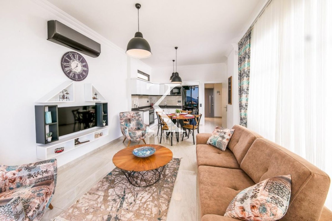 Salon: Konforlu oturma grubu, orta sehpa, TV, klima ve havuz terasına doğrudan çıkış.