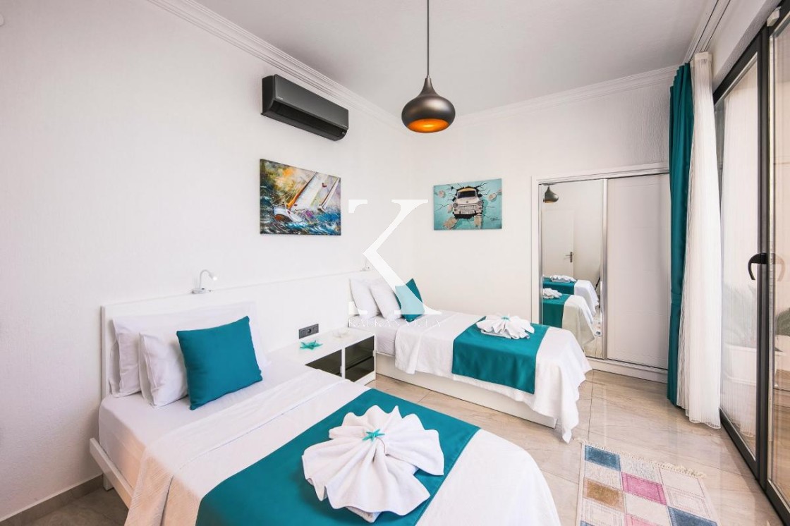 2. Yatak Odası: İki tek kişilik yatak, özel banyo & tuvalet, doğrudan havuz terasına çıkış.