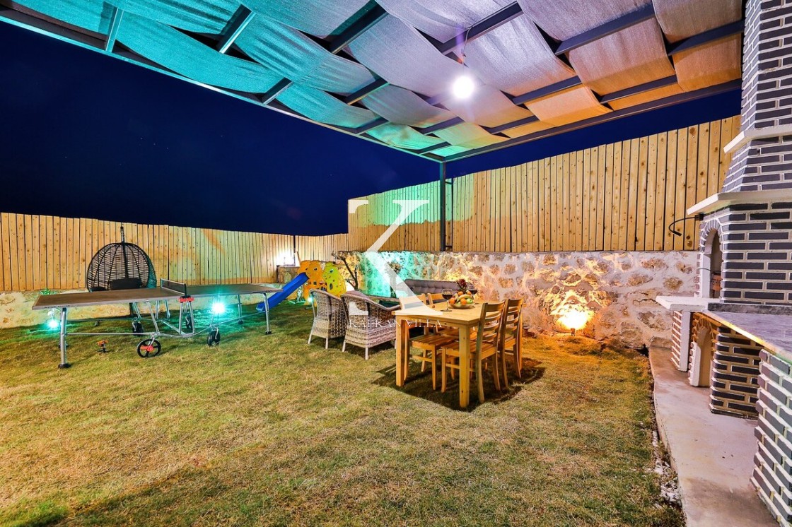 Şezlonglar, güneş şemsiyeleri, yemek masası, barbekü alanı ve bahçe oturma grubu mevcuttur.