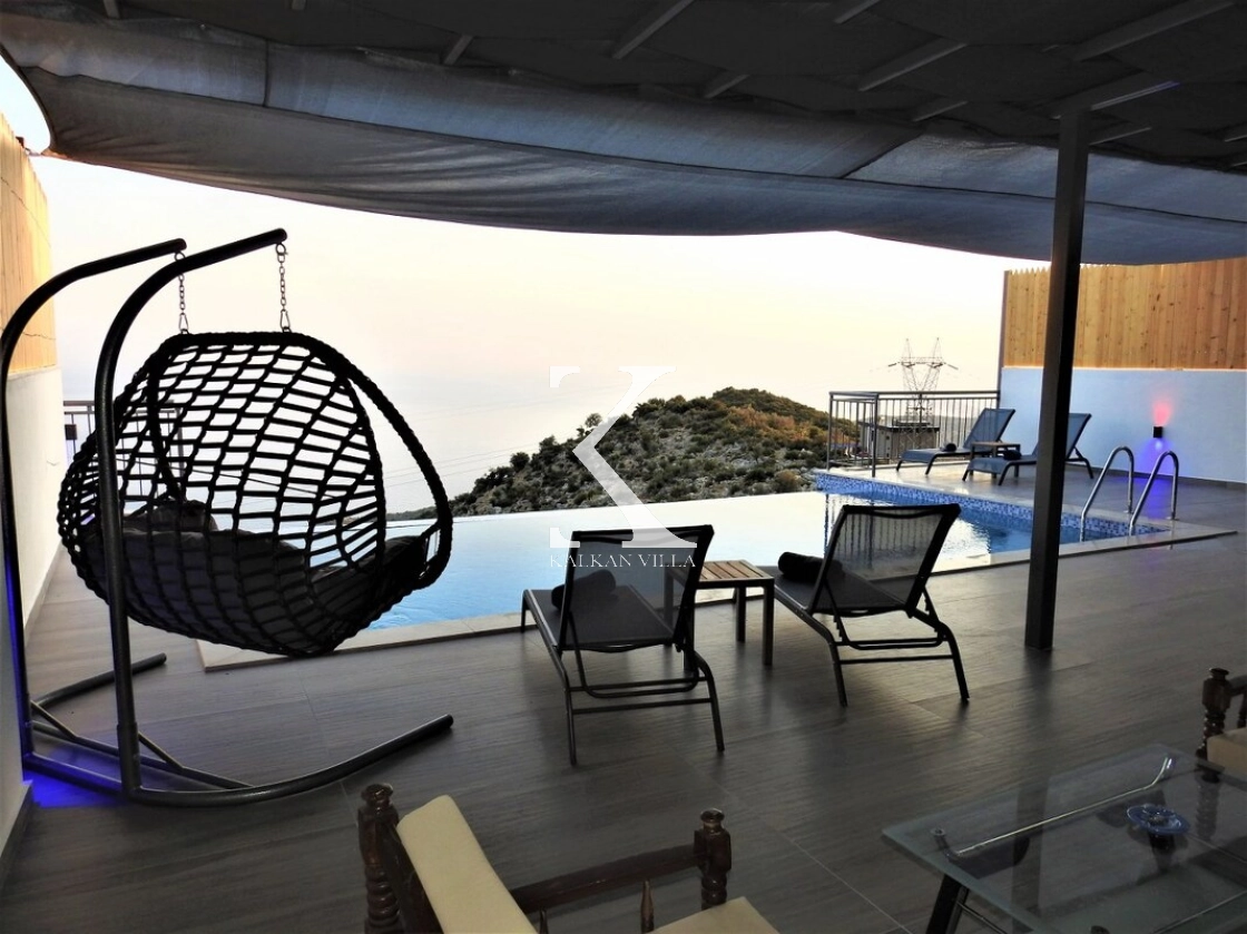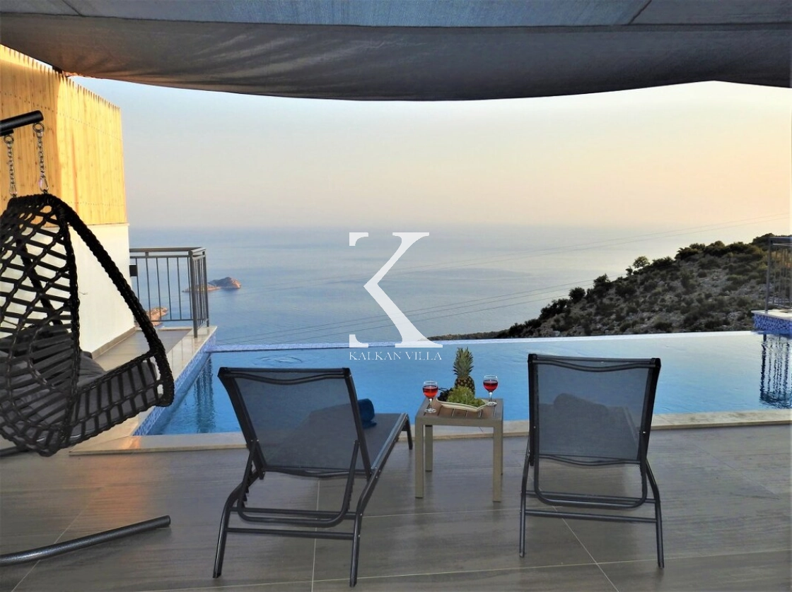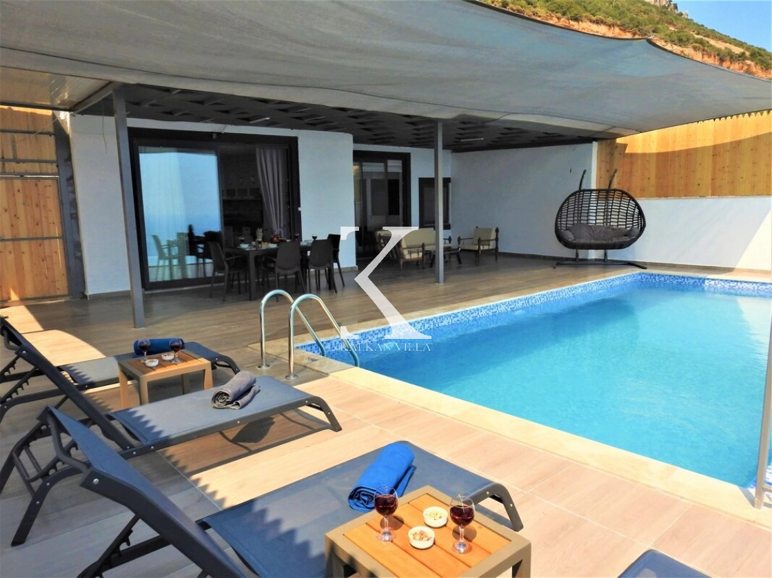 Villanın geniş havuz terasında sonsuzluk havuzu, şezlonglar, salıncak, oturma alanı ve yemek masası bulunmaktadır.
