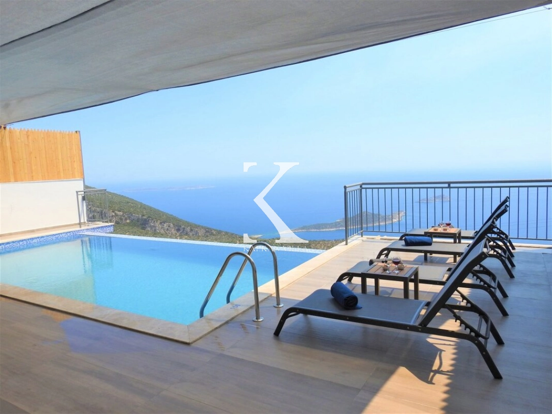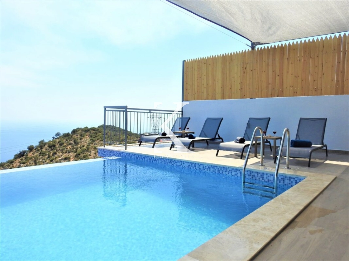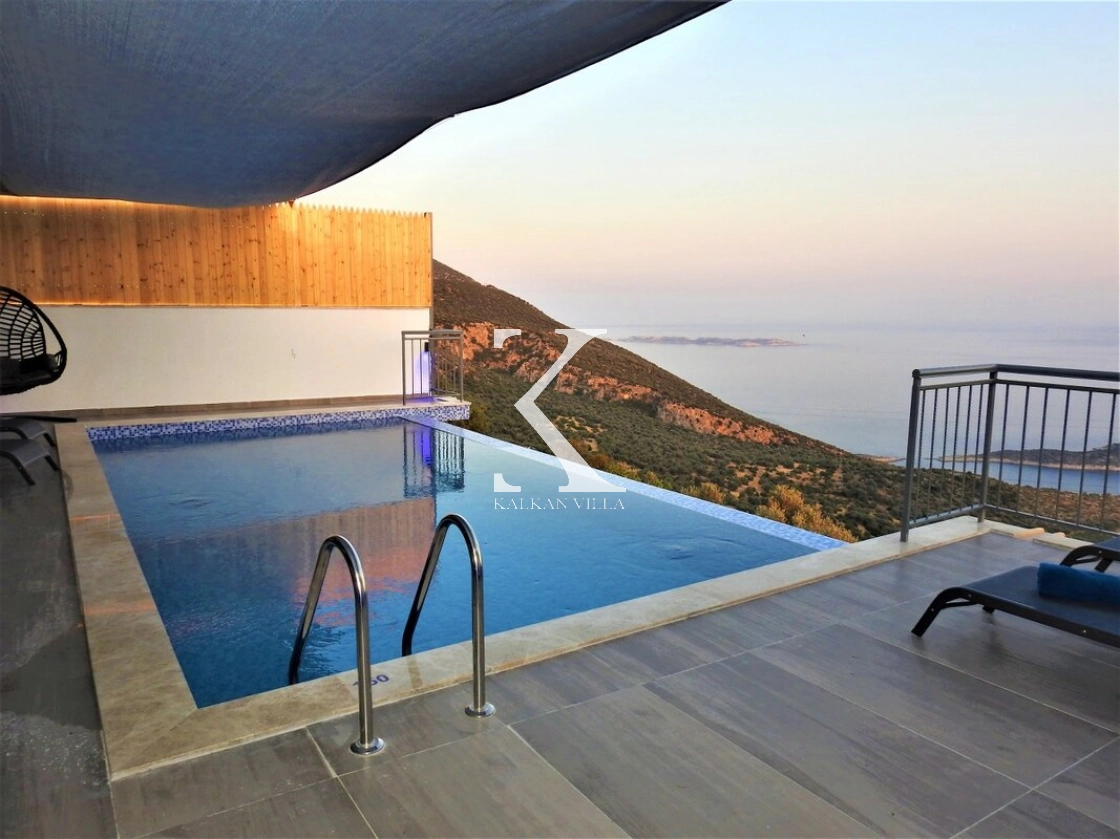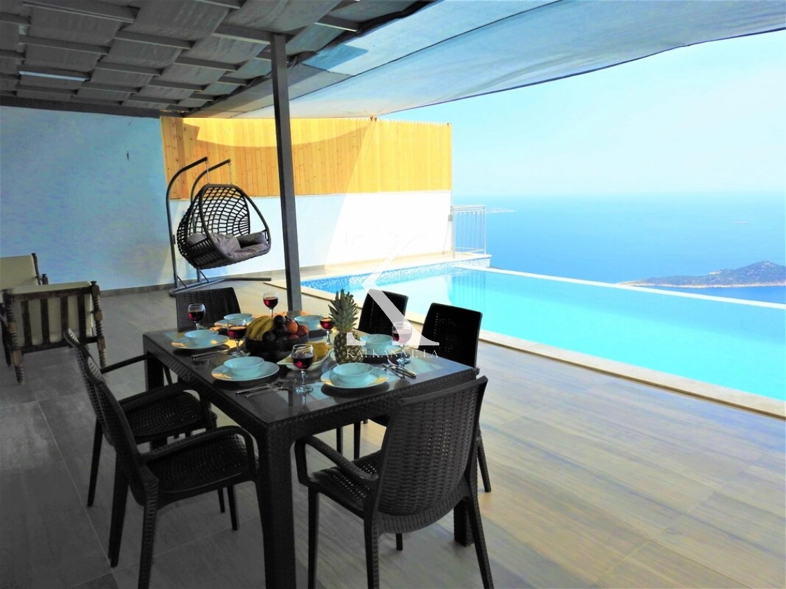 Villanın geniş havuz terasında sonsuzluk havuzu, şezlonglar, salıncak, oturma alanı ve yemek masası bulunmaktadır.