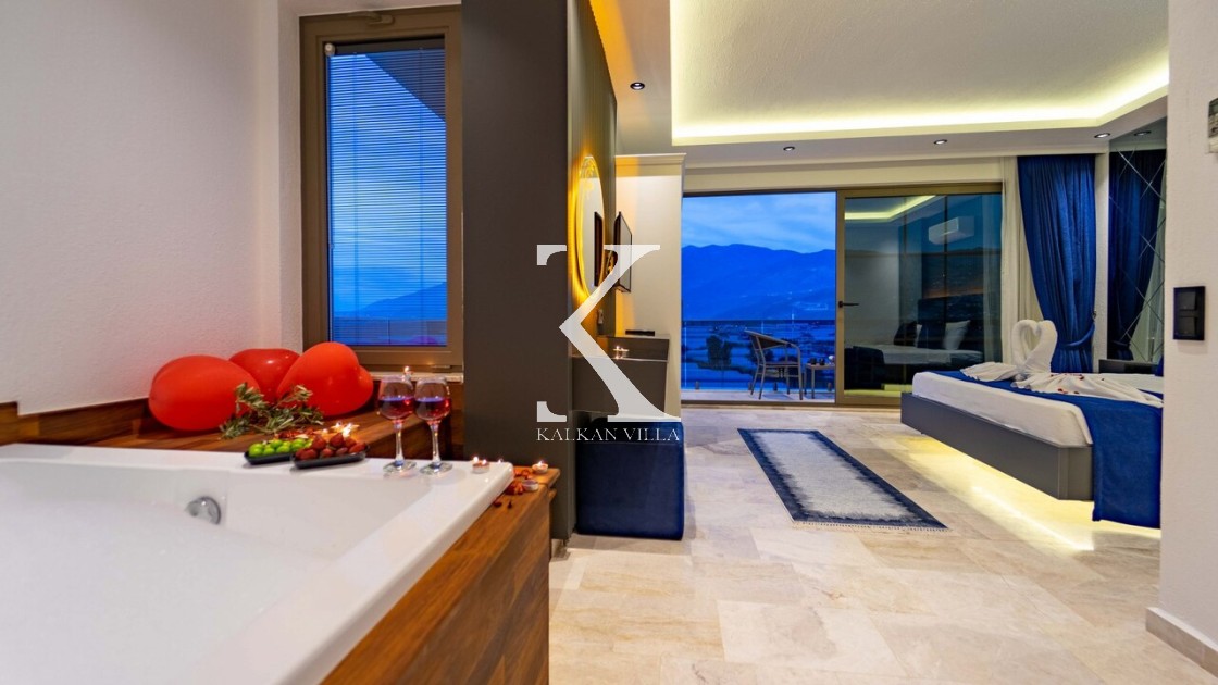 Bir adet çift kişilik yatak, komodin, elbise dolabı, makyaj masası, jakuzi, klima, banyo ve tuvalet.