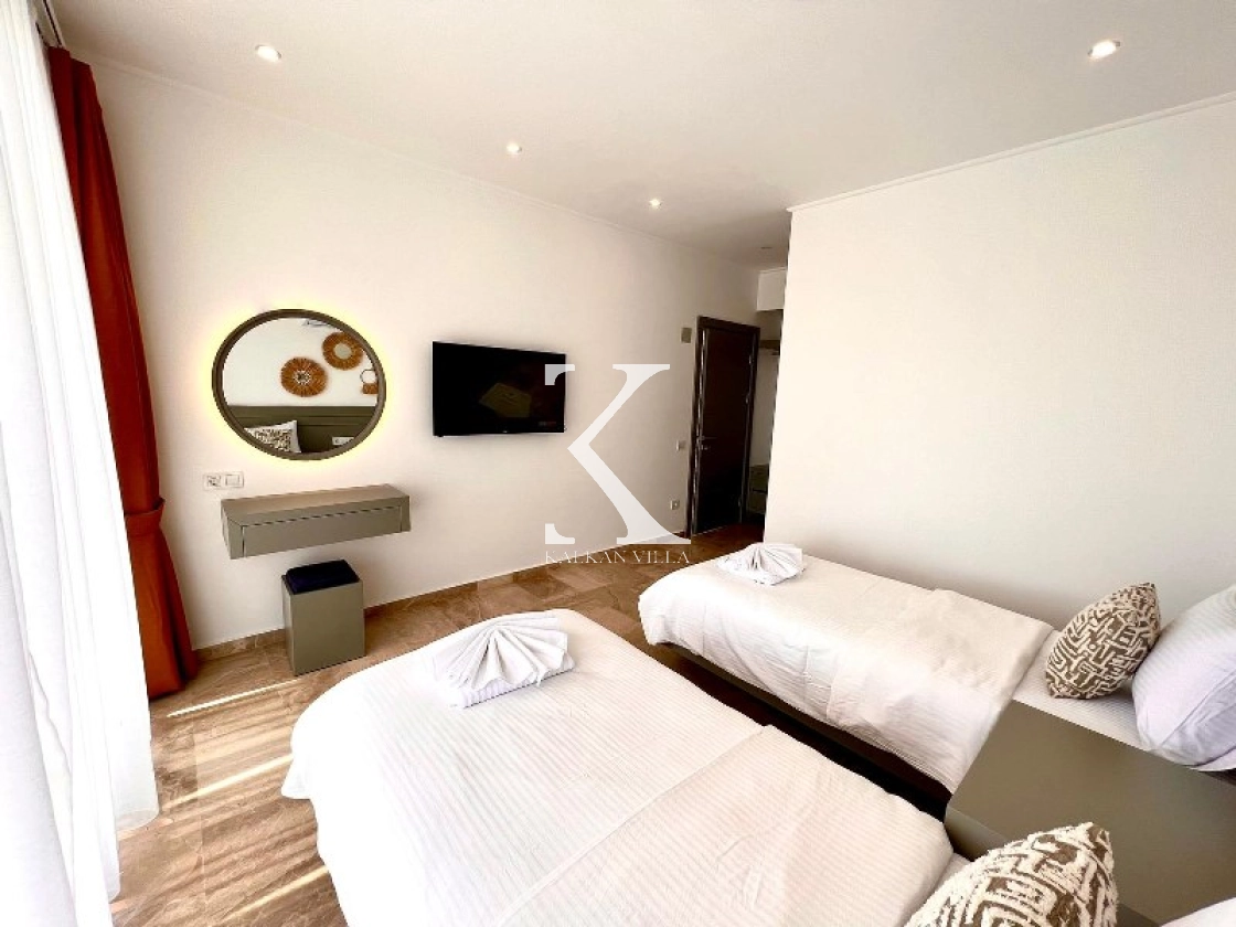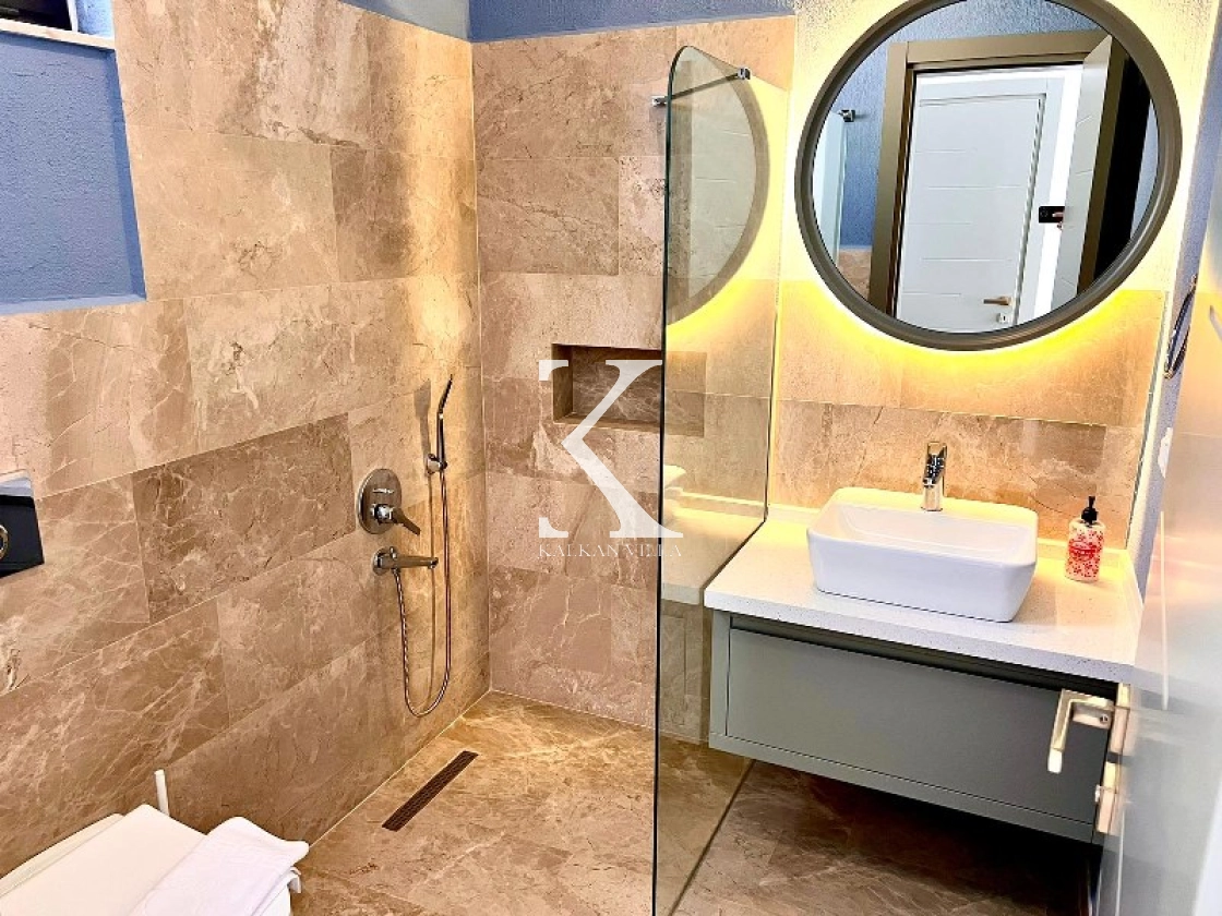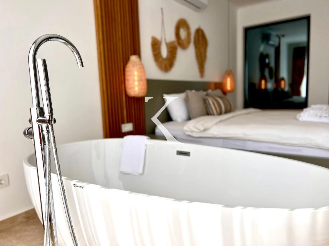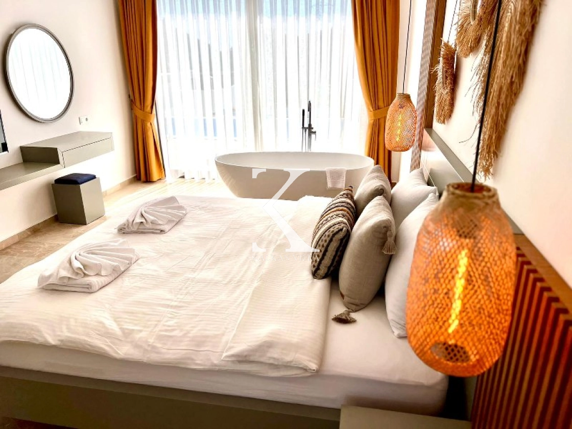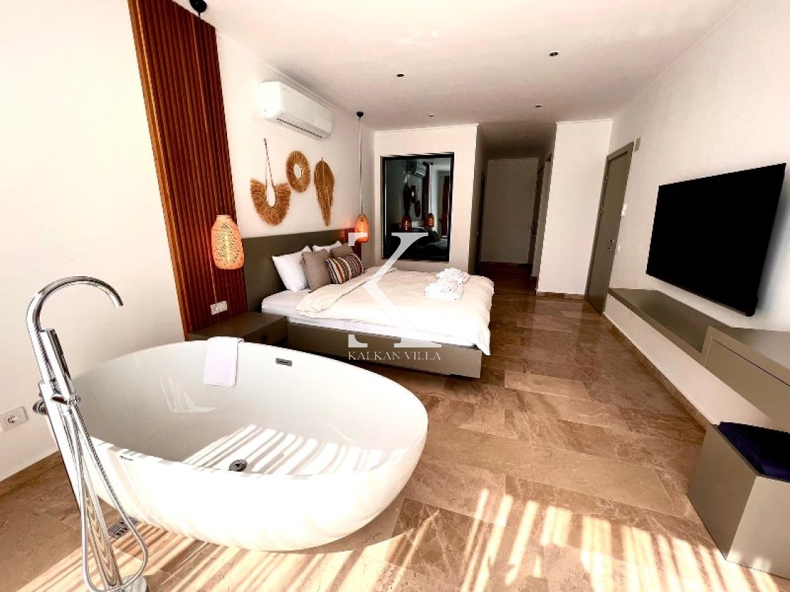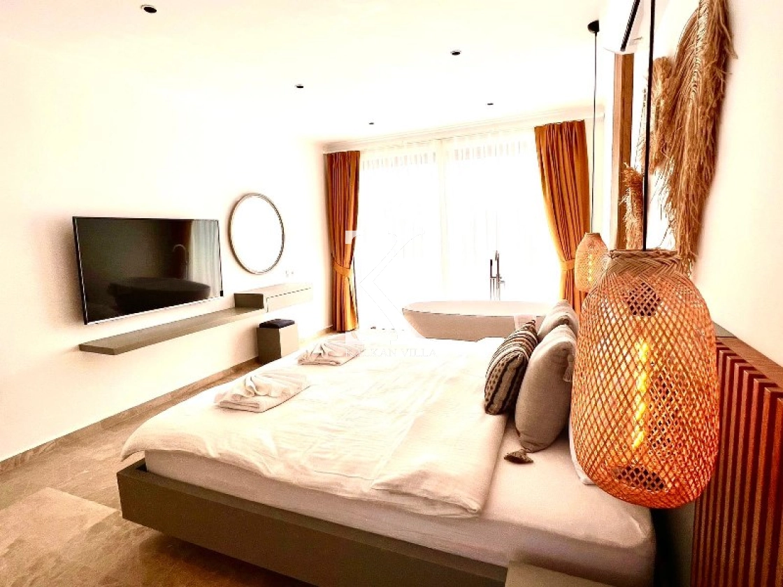 Ana yatak odasında bulunan jakuzili küvet, tatilinize romantik bir dokunuş katarken, doğa manzaralı geniş camlar sayesinde ferah bir atmosfer sunar.