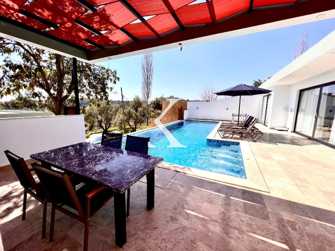 Bahçe alanında özel yüzme havuzu, şezlonglar, oturma köşesi, barbekü ve yemek masası yer alır.