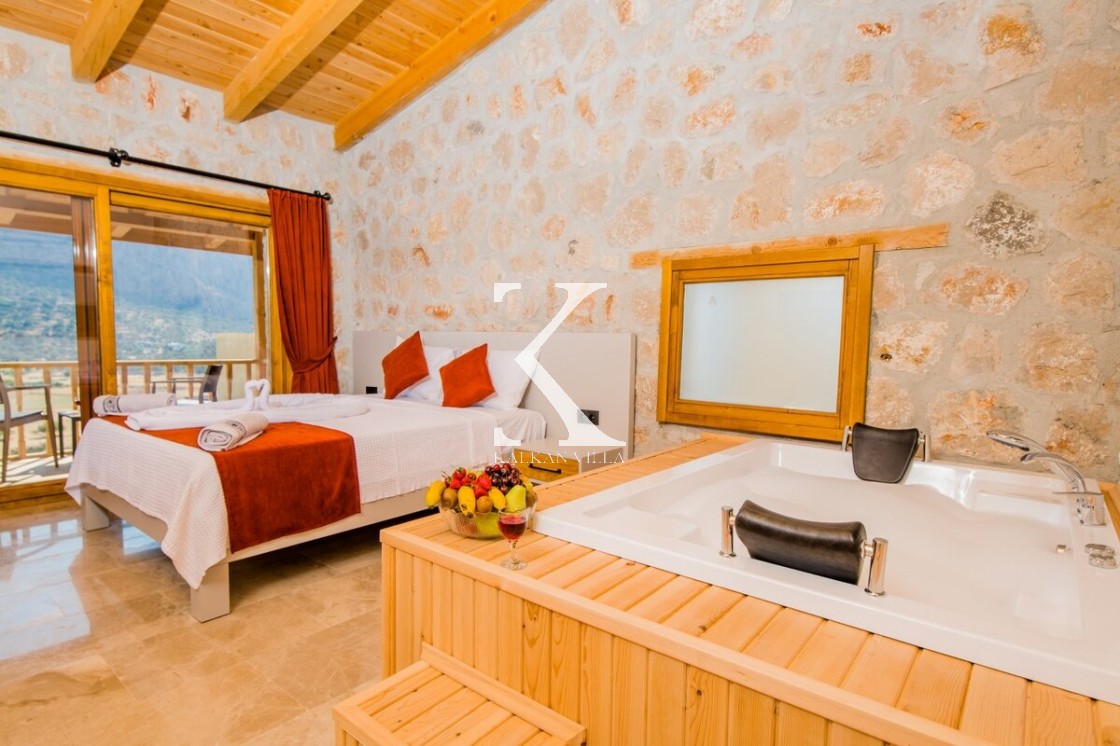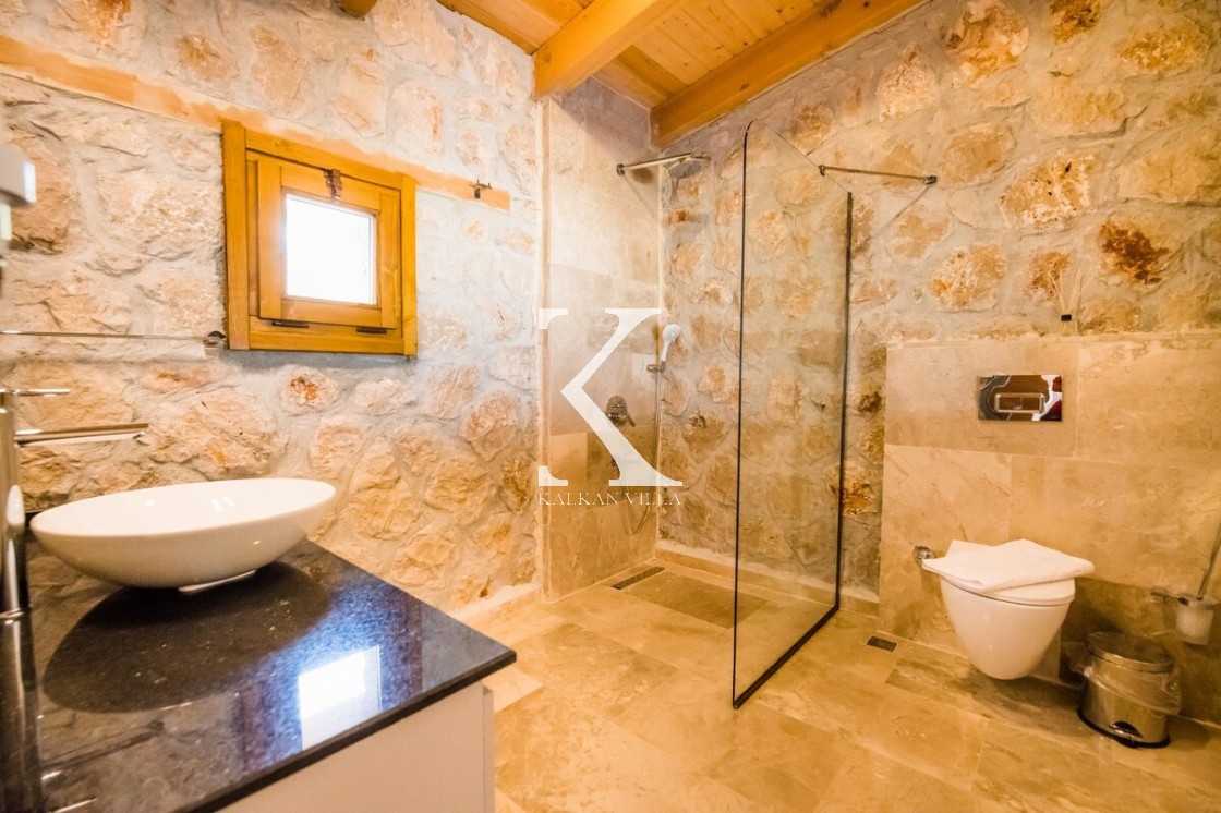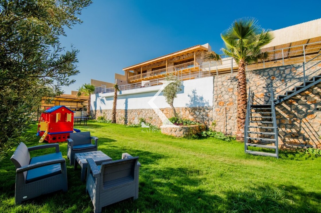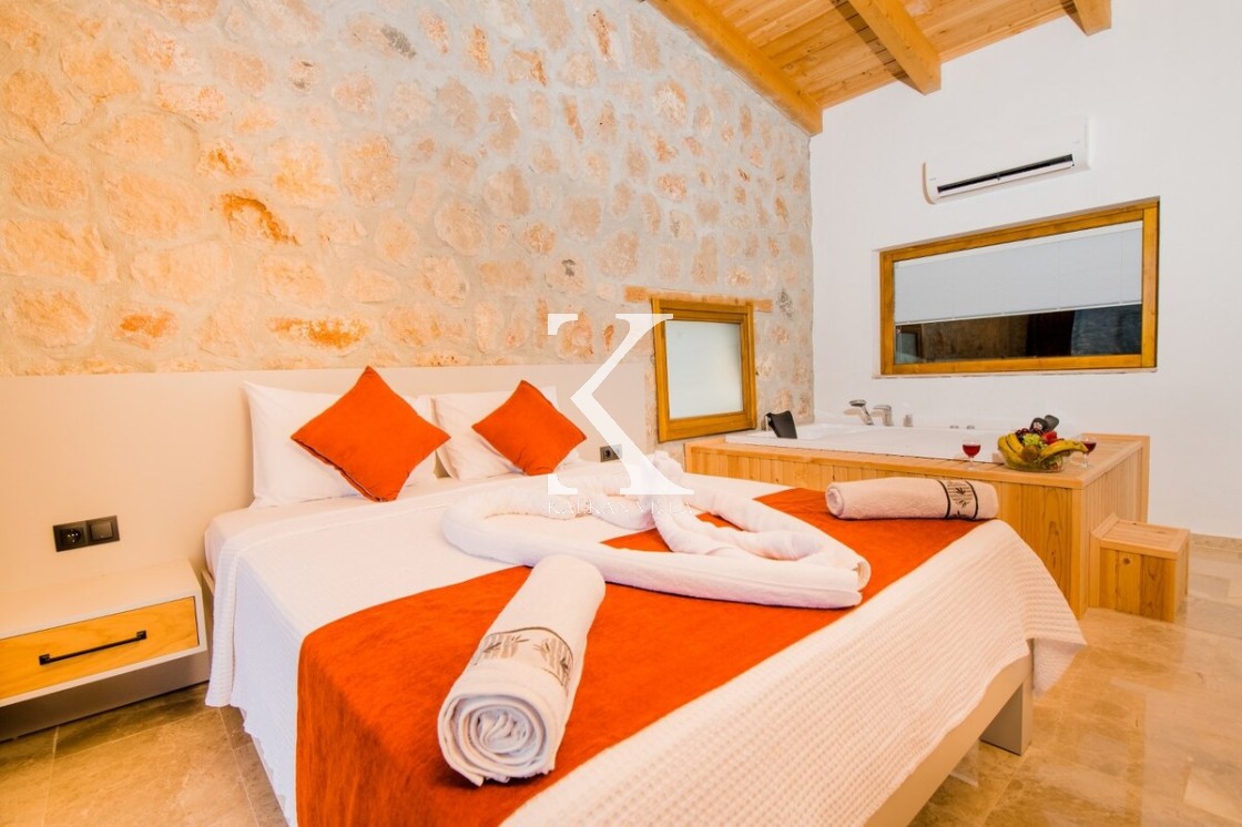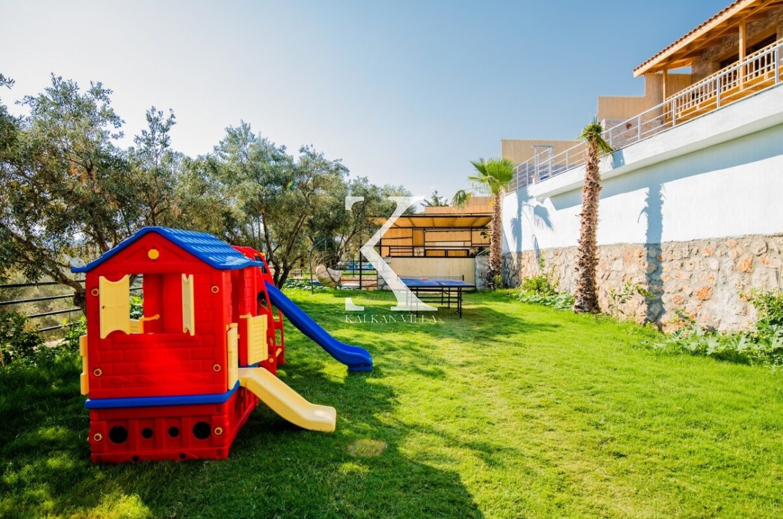 İç mekân, taş ve ahşap dokusuna uyumlu şık mobilyalarla dekore edilmiştir. Bahçe bölümünde salıncak, masa tenisi ve çocuk oyun alanı gibi eğlenceli detaylar bulunmakta olup, misafirlerimizin tatilleri boyunca rahat ve keyifli zaman geçirebilmeleri için her şey düşünülmüştür. Villamızın 3 yatak odasından 2 tanesinde jakuzi yer almaktadır.