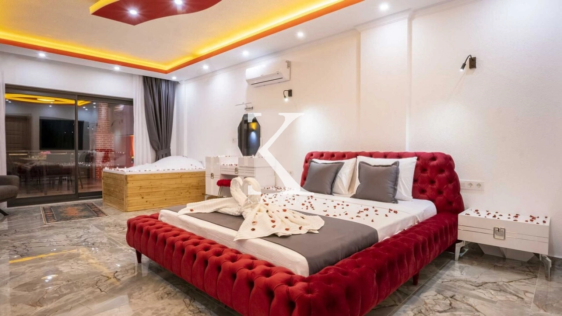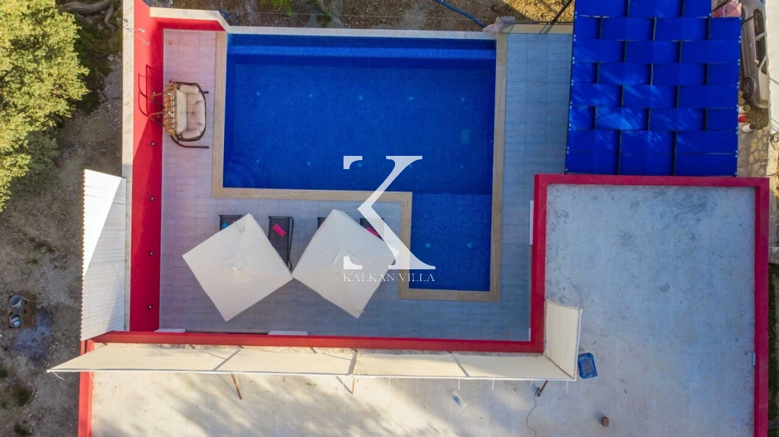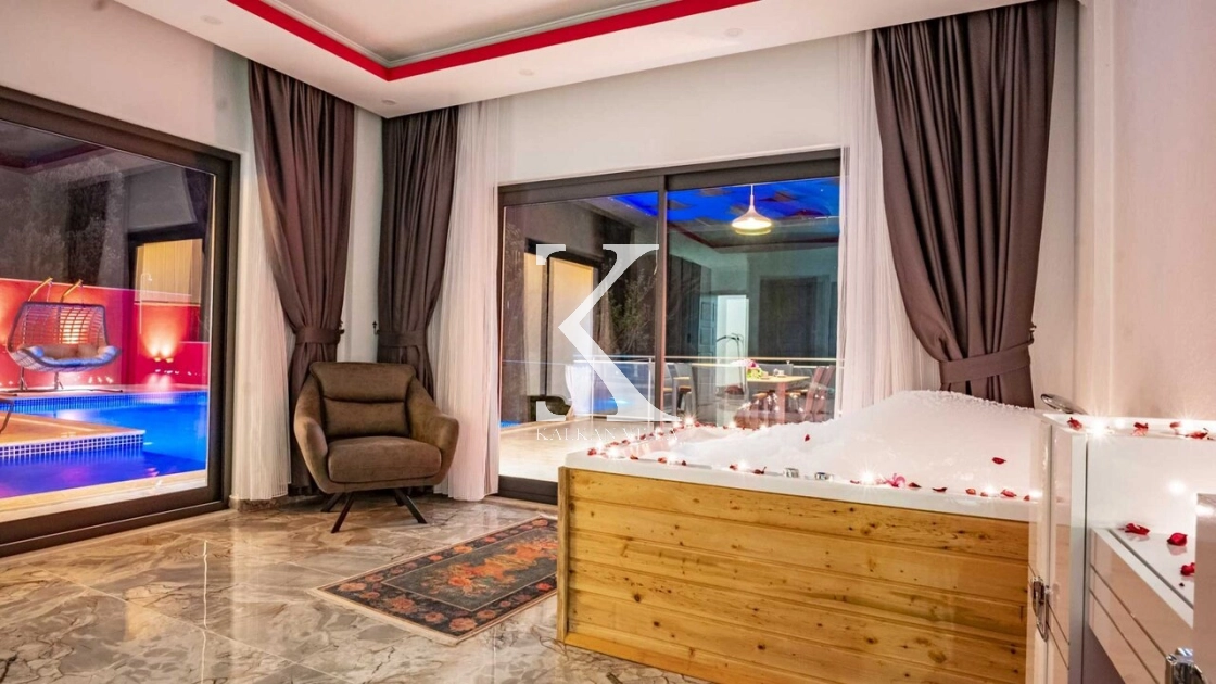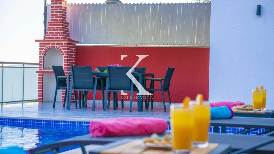 Çitlerle çevrili korunaklı bahçesi, dış gözlerden uzak, rahat ve özgür bir tatil imkânı sunmaktadır. Bahçede yer alan özel yüzme havuzu, şezlonglar, oturma alanı, yemek masası ve barbekü ile doğa manzarası eşliğinde keyifli vakit geçirebilirsiniz. Ebeveyn yatak odasında bulunan jakuzi, tatilinize konfor ve romantik bir atmosfer katmaktadır.