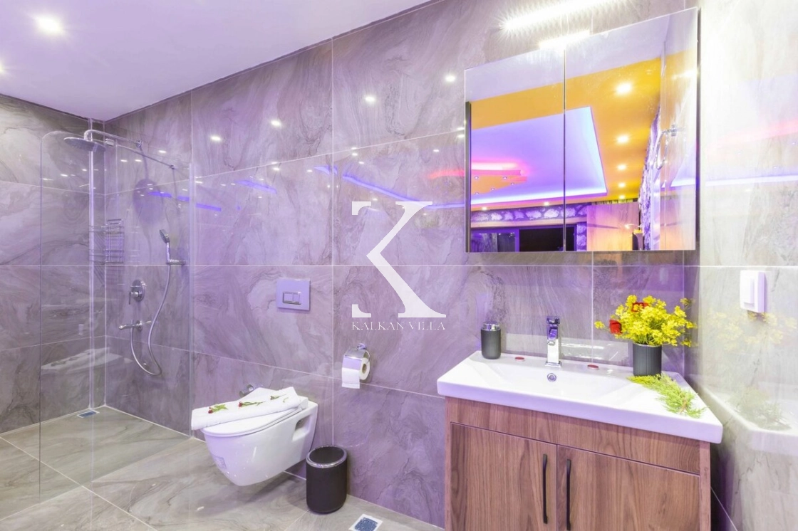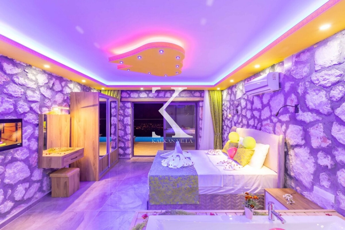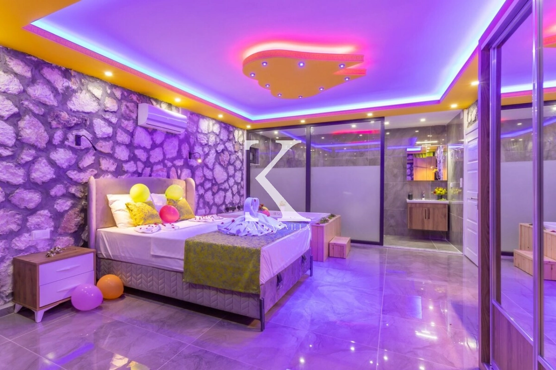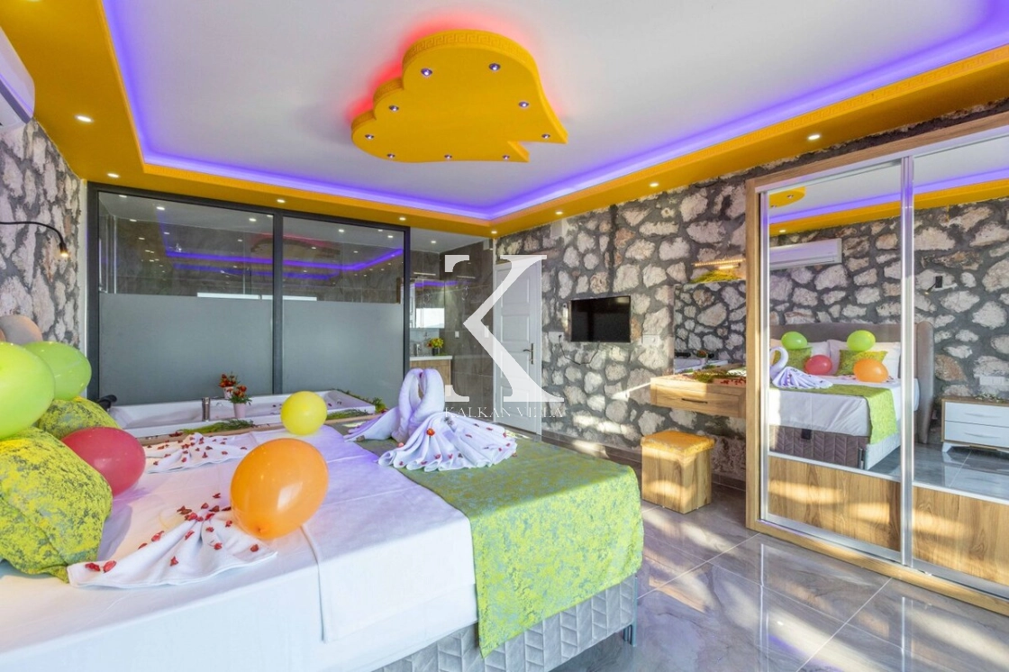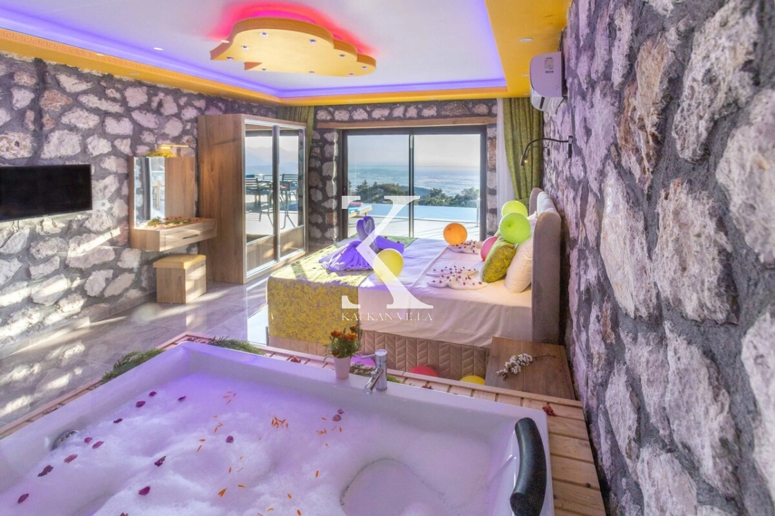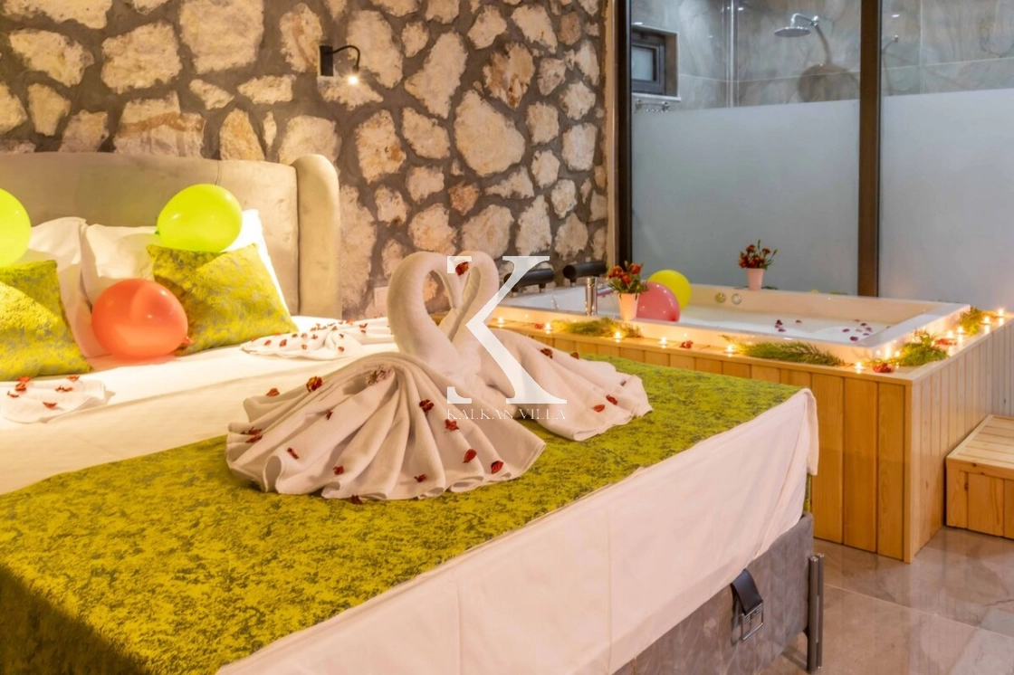 Villanın özel bahçesinde; özel yüzme havuzu, şezlonglar, oturma alanı, salıncak, yemek masası ve barbekü alanı yer almaktadır. Sade ve şık renk tonlarıyla dekore edilmiş yatak odasında bulunan jakuzi, balayı çiftlerine özel konforlu ve romantik bir atmosfer oluşturur.
