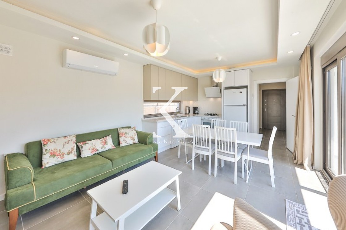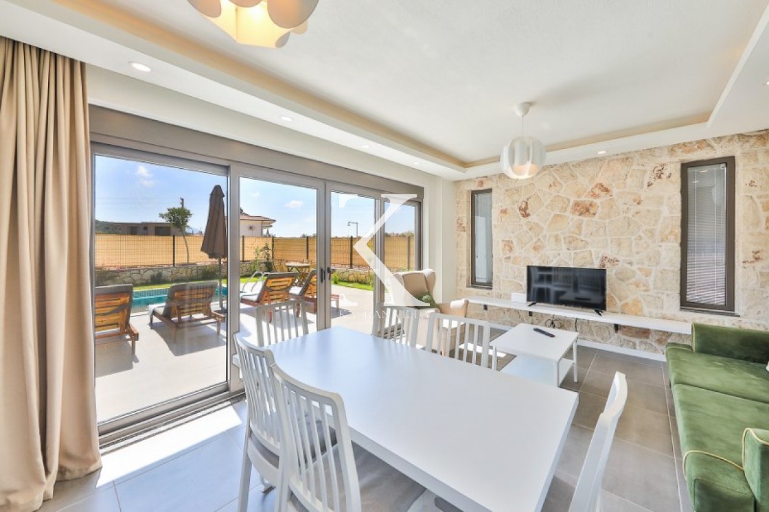 Aydınlık ve ferah salonda konforlu oturma grubu, TV, DVD oynatıcı, uydu alıcısı ve klima yer almaktadır. Salondan havuz terasına direkt geçiş mevcuttur.
