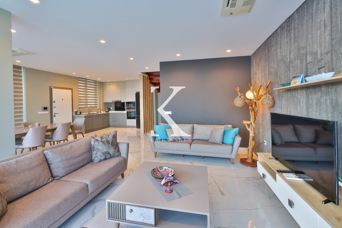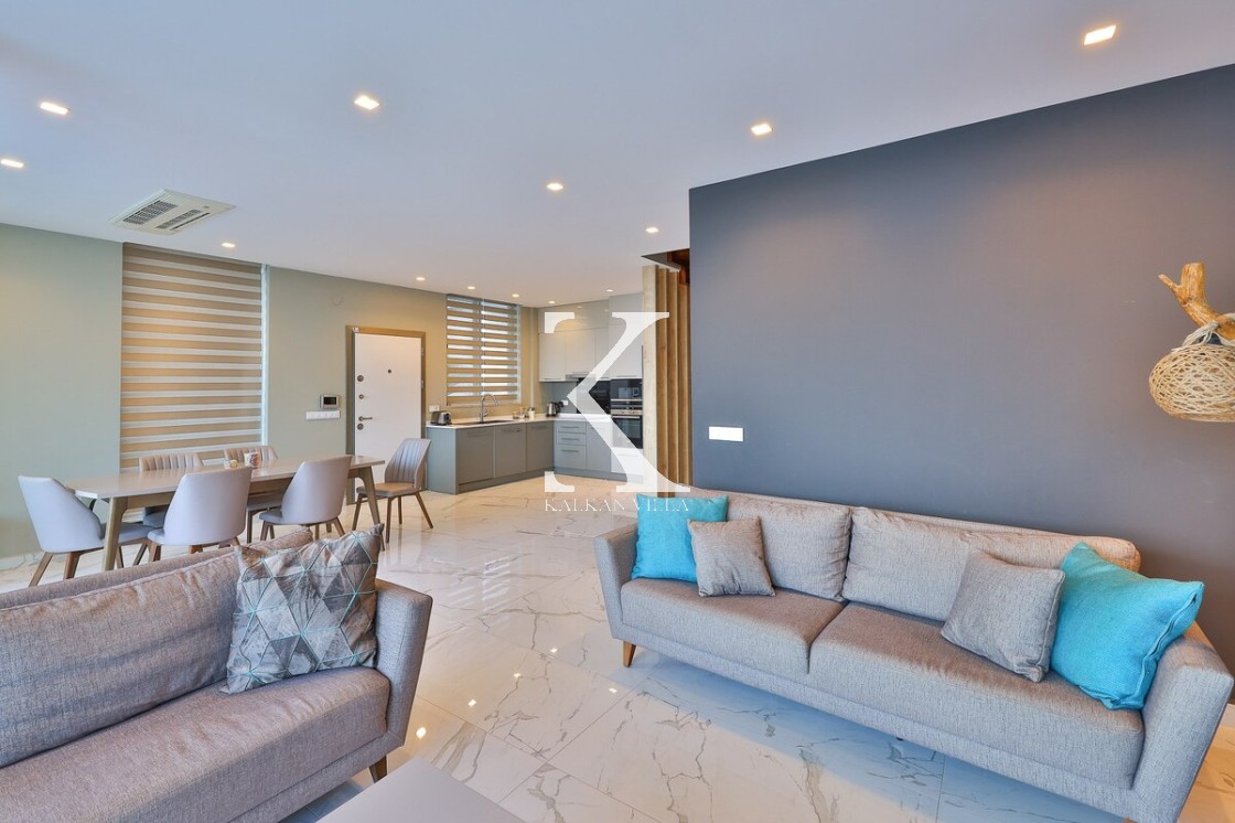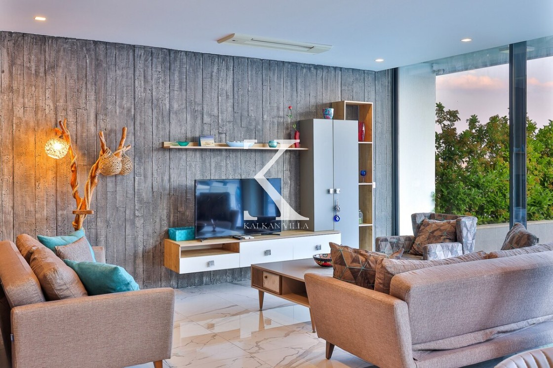 Geniş ve ferah salonunda modern mobilyalar, klima, TV, Wi-Fi ve konforlu oturma grubu yer alır.