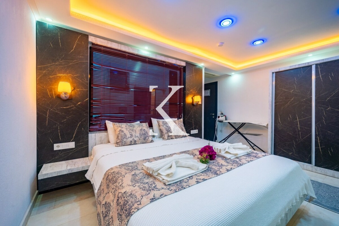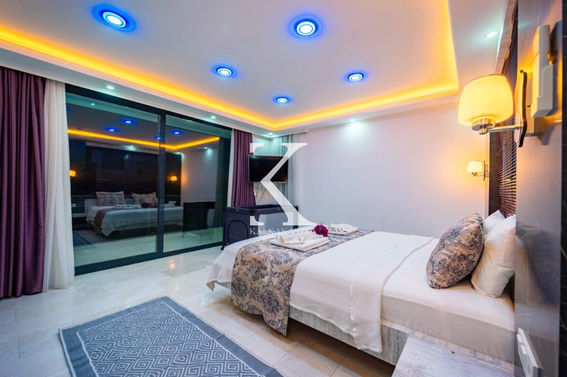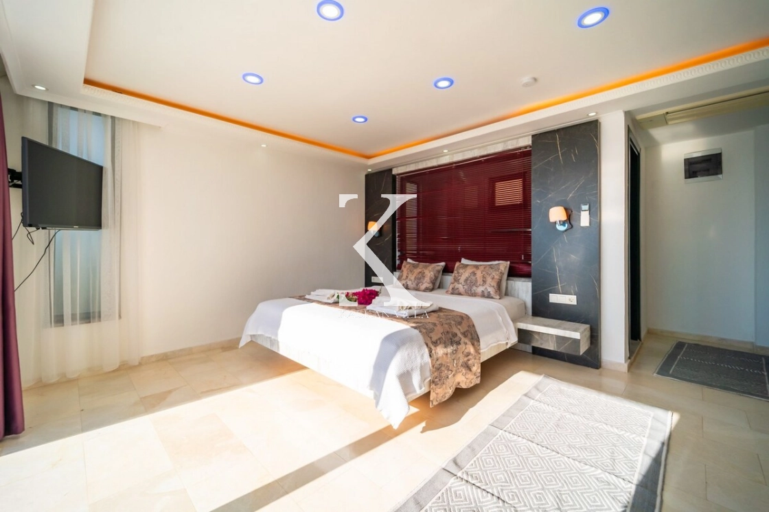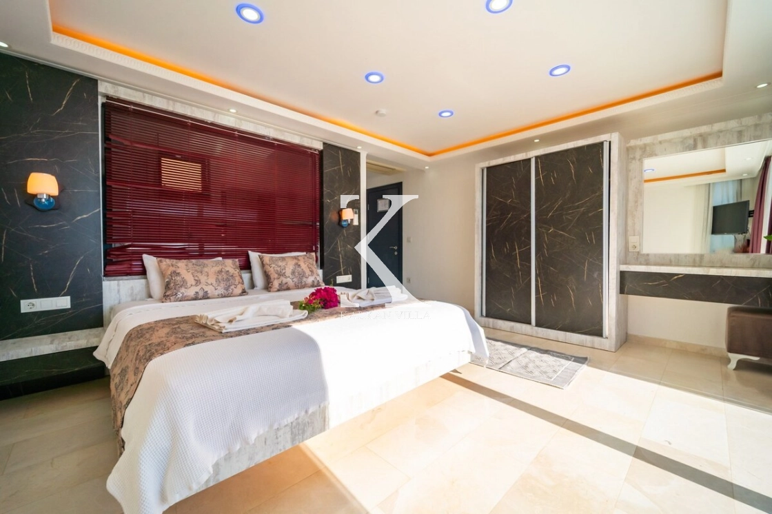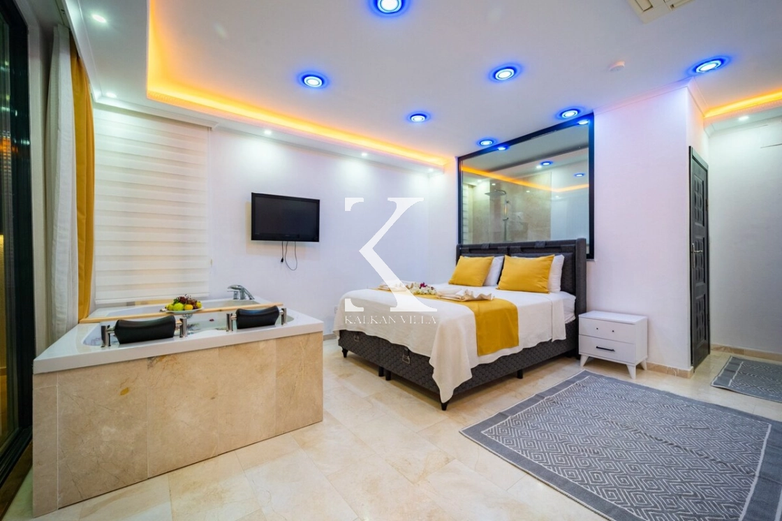 Çift kişilik yatak, komodin, elbise dolabı, klima, jakuzi, banyo ve tuvalet.