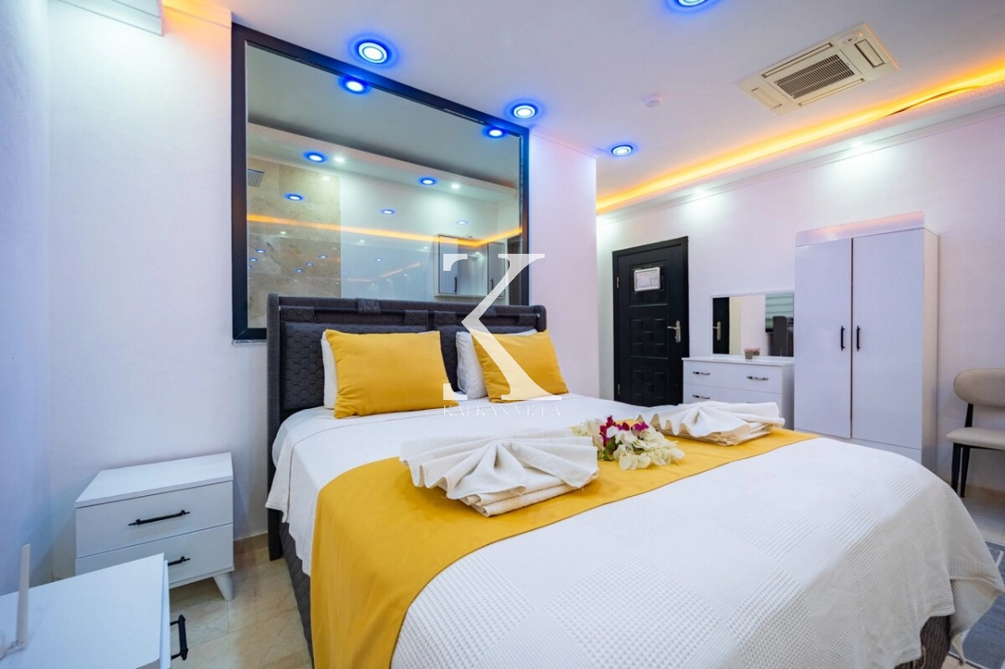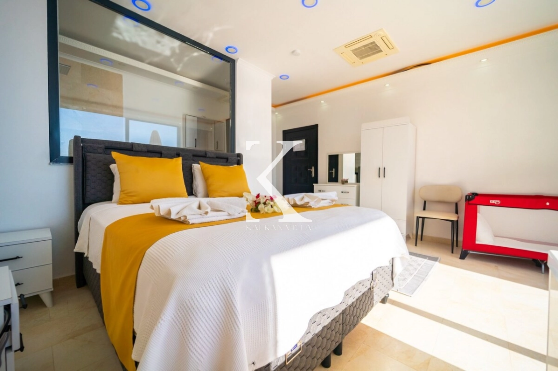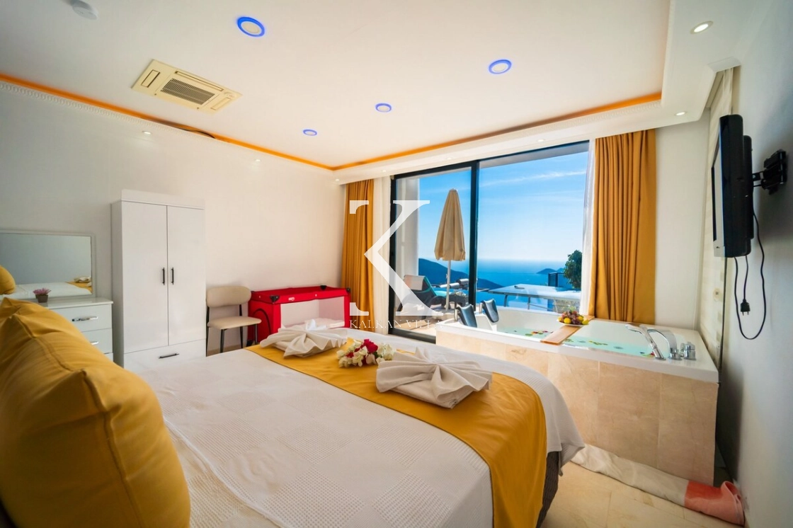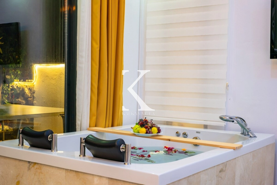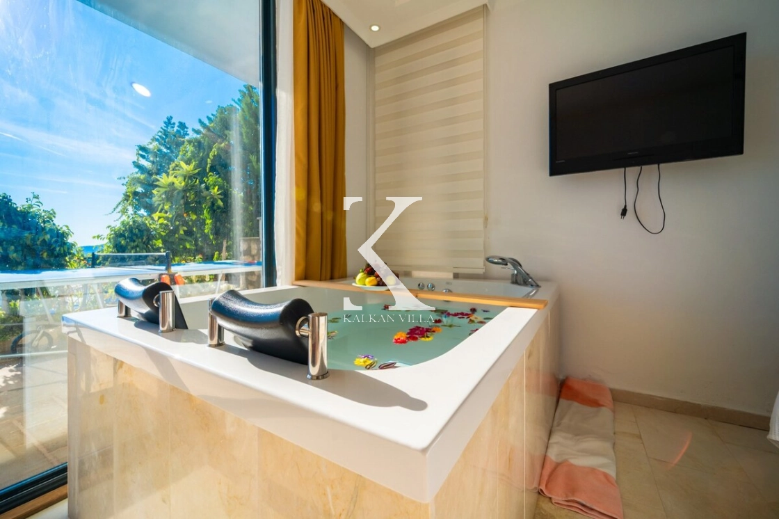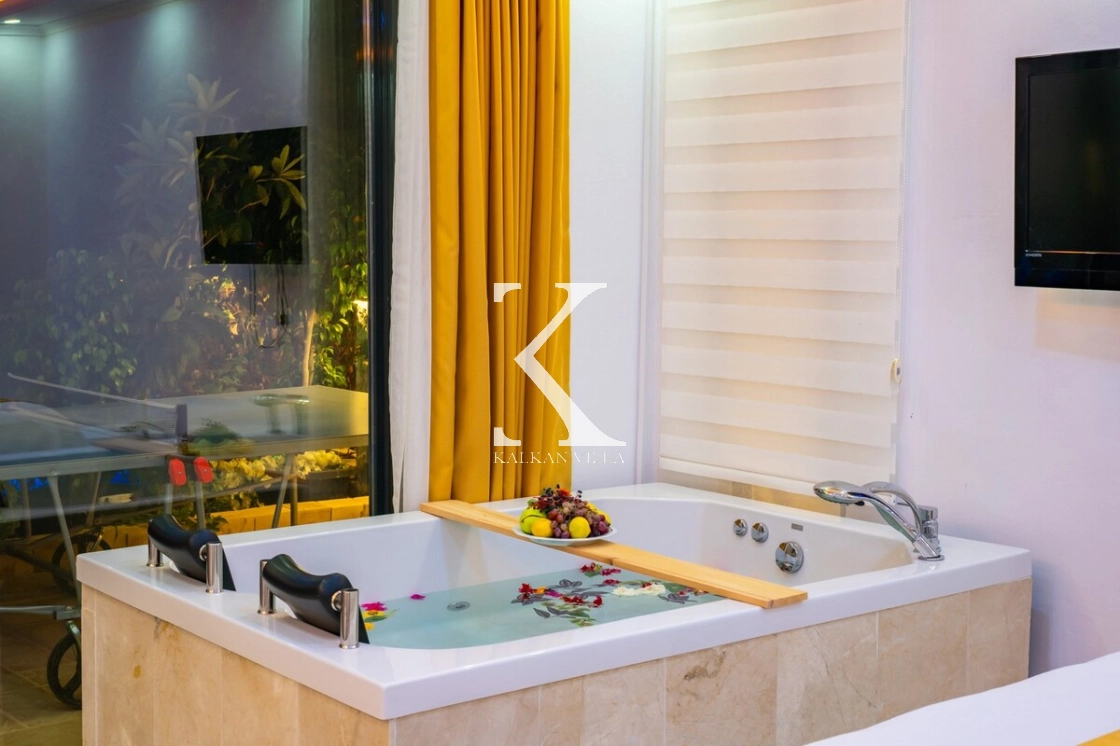 Çift kişilik yatak, komodin, elbise dolabı, klima, jakuzi, banyo ve tuvalet.
