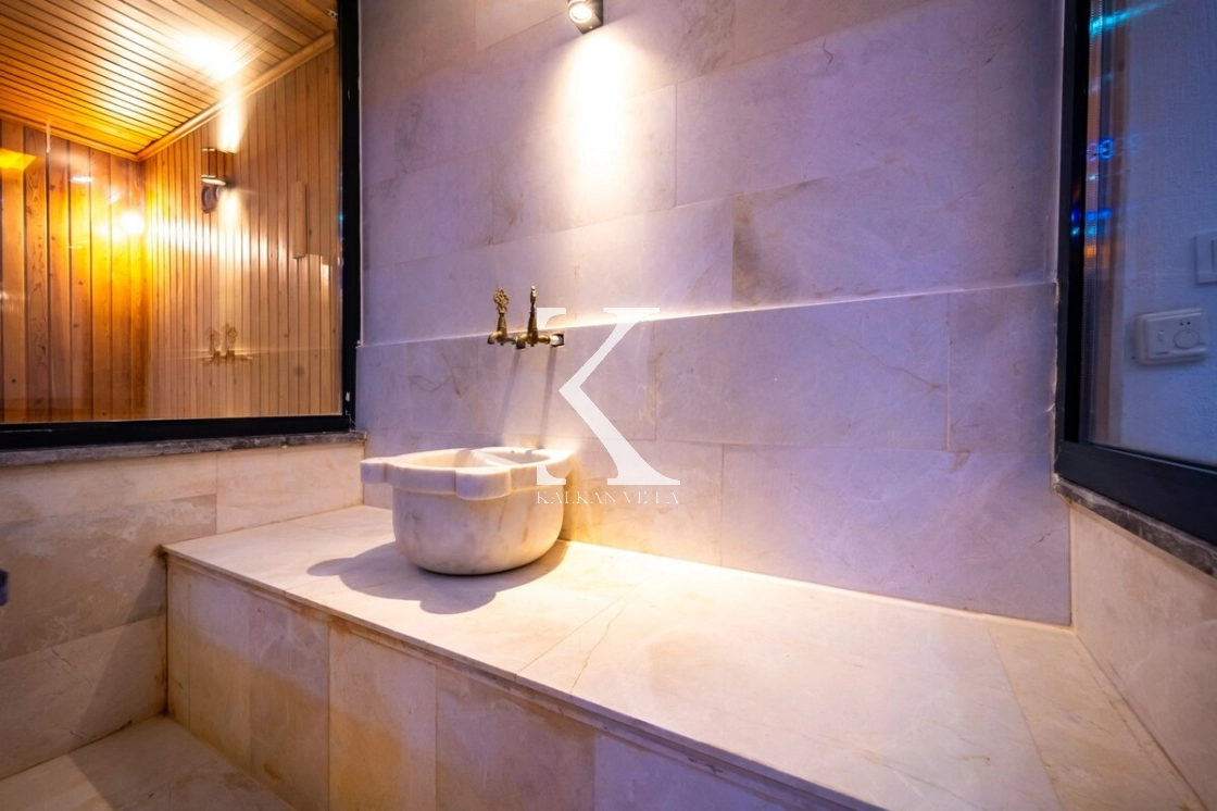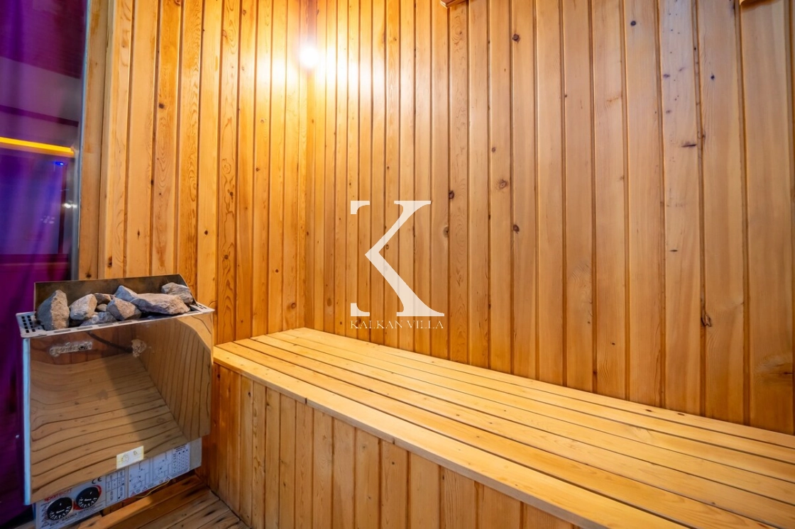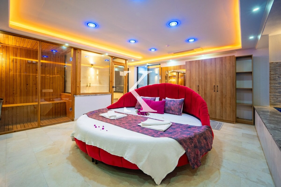 Çift kişilik yatak, komodin, elbise dolabı, klima, sauna, Türk hamamı, jakuzi, banyo ve tuvalet.
