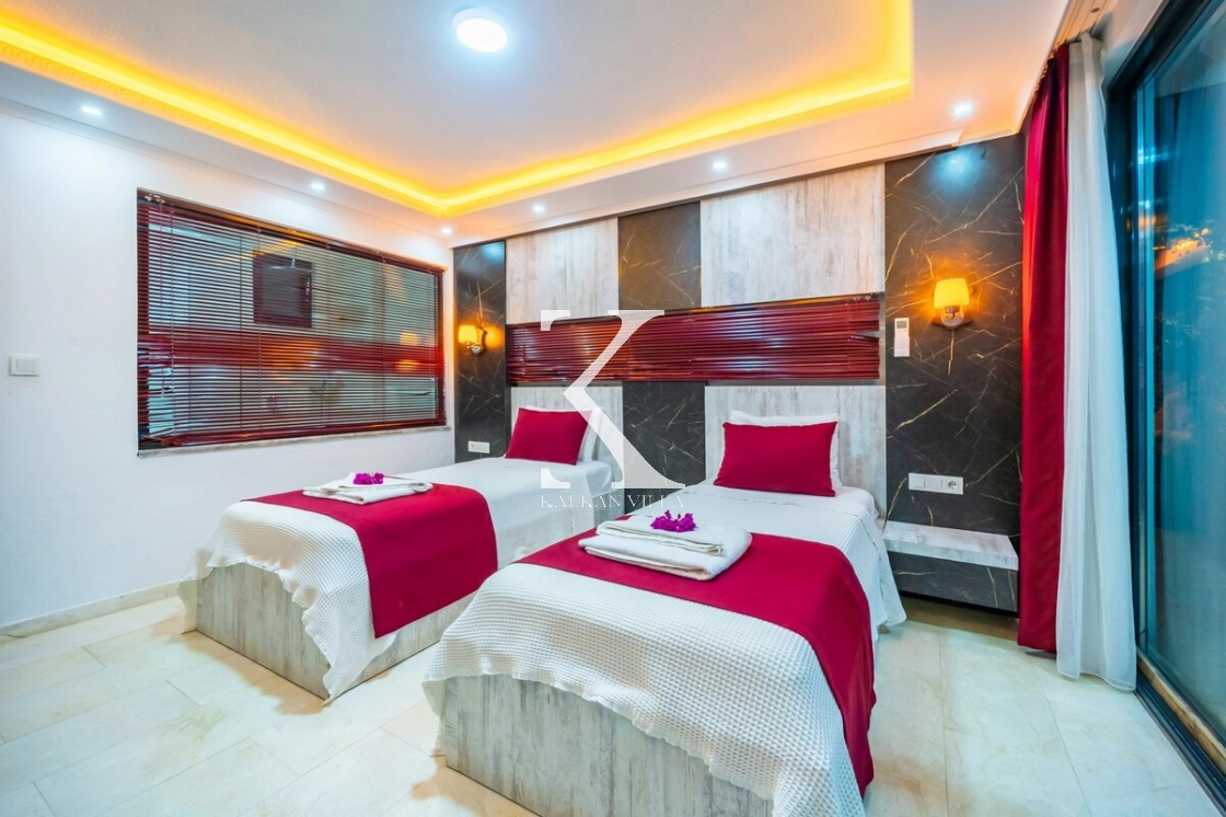 İki adet tek kişilik yatak, komodin, elbise dolabı, klima, banyo ve tuvalet.