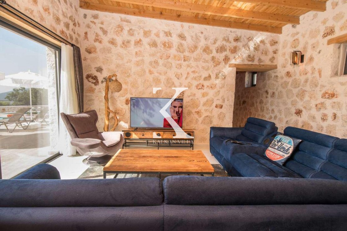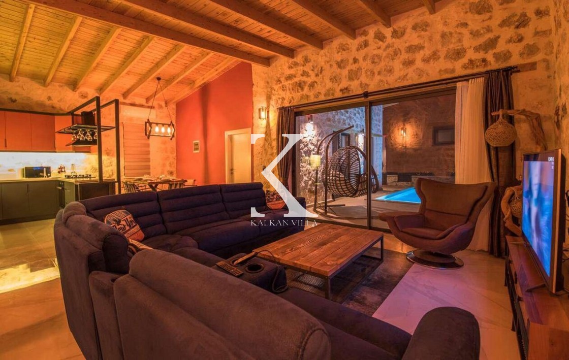 Salon: Aydınlık ve ferah; konforlu oturma grubu, TV, DVD oynatıcı, uydu alıcısı, klima. Havuz terasına direkt çıkış.