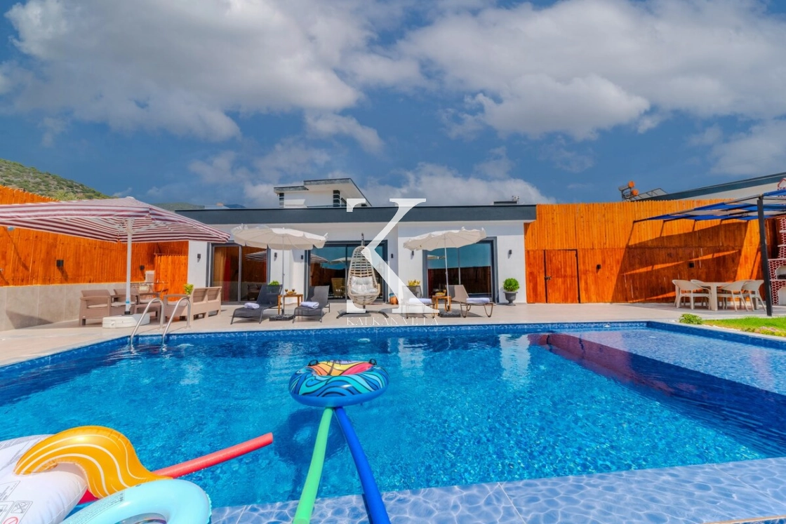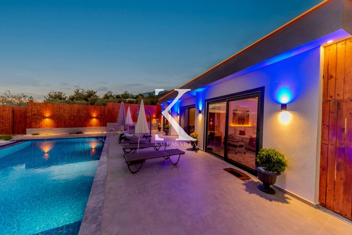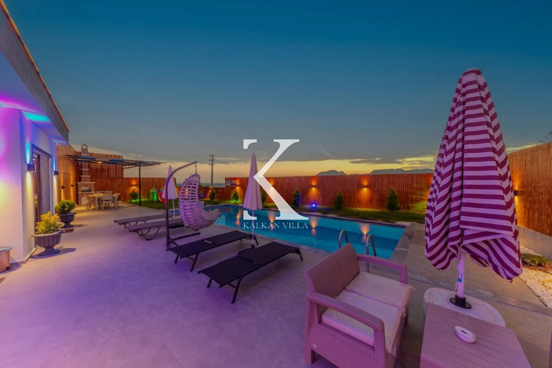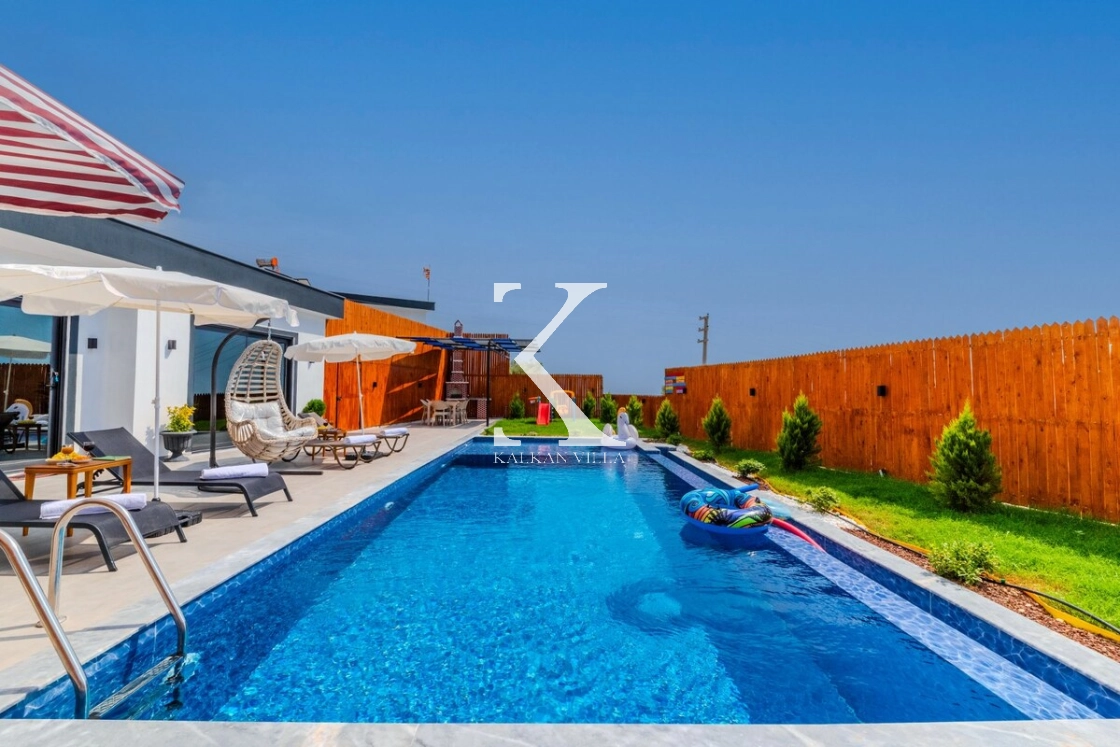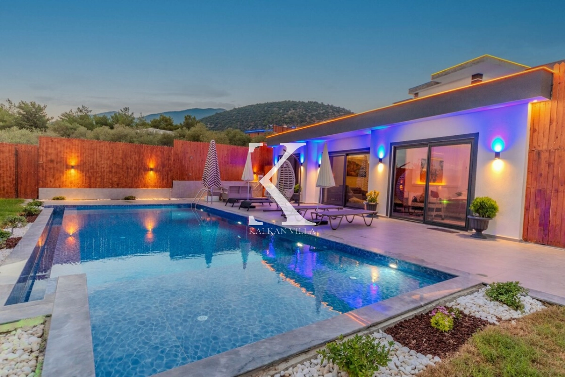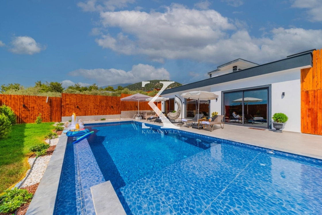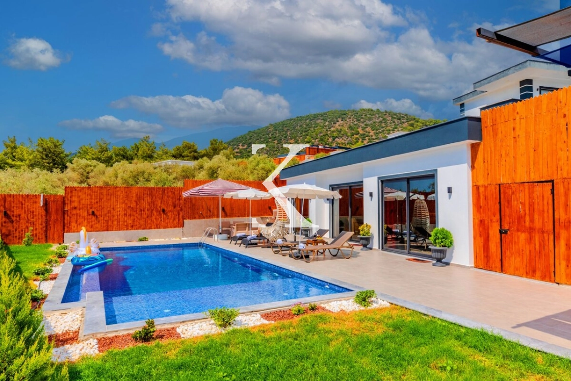 Villa İnziva’nın havuz terası ve bahçe alanı ahşap çitlerle tamamen korunaklı hale getirilmiştir. Dışarıdan görünmeyen özel yüzme havuzu sayesinde misafirler gözlerden uzak, rahat ve güvenli bir tatil deneyimi yaşayabilir.