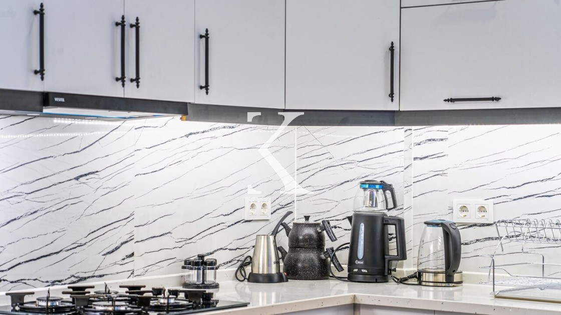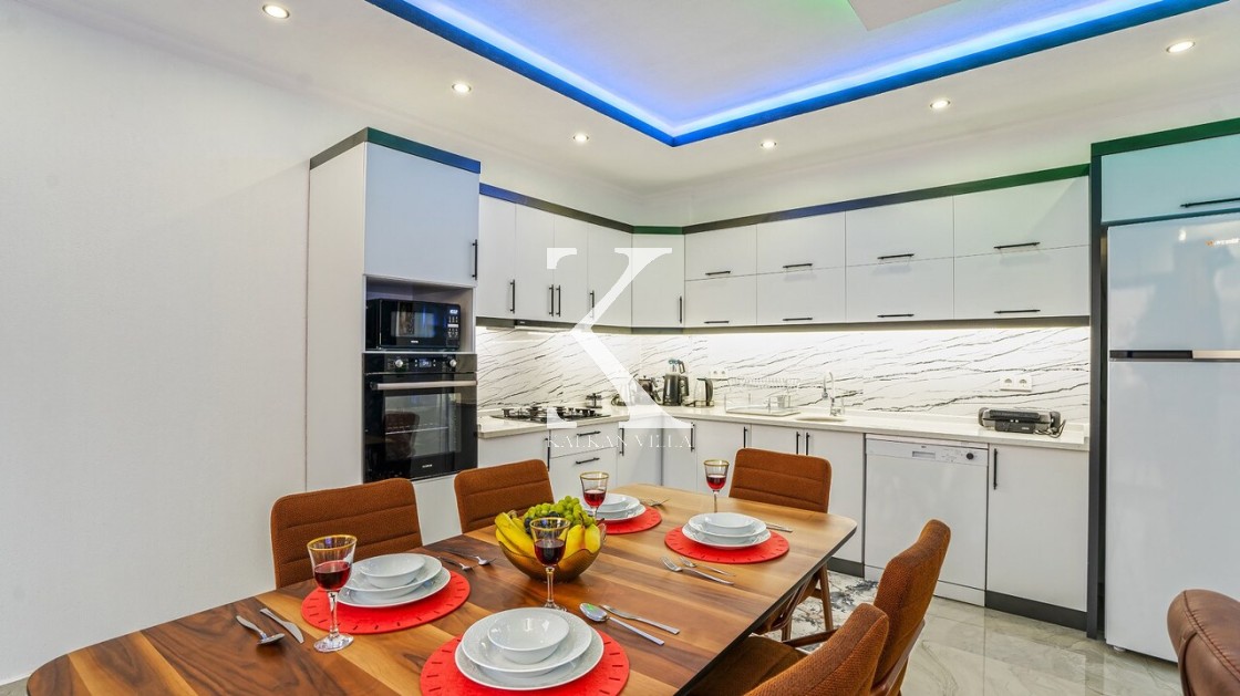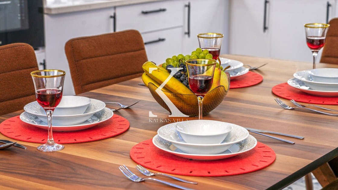 Mutfakta buzdolabı, bulaşık makinesi, çamaşır makinesi, ocak, fırın, tost makinesi, su ısıtıcısı, yemek masası ve tüm mutfak gereçleri yer almaktadır.