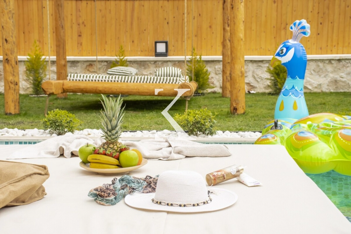 Korunaklı havuz terası, çocuklar için oyun alanı, bahçe açık hava sineması, masa tenisi, langırt, sauna, hamam ve salıncak gibi detaylarla zenginleştirilmiş olup, her yaştan misafire hitap eden eğlence ve rahatlama imkanlarıyla doludur. Özel yüzme havuzu, jakuzi ve alttan ısıtma sistemi sayesinde kış aylarında da konforlu bir tatil yapabilirsiniz.