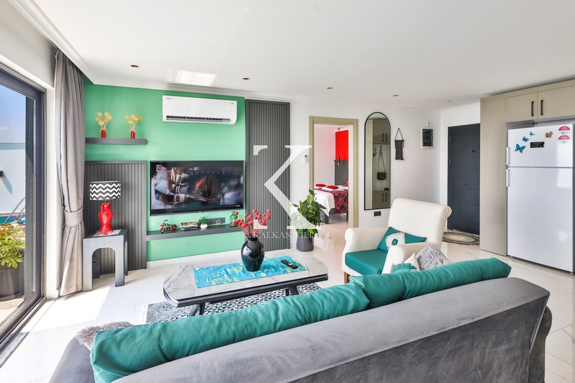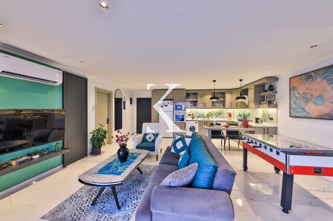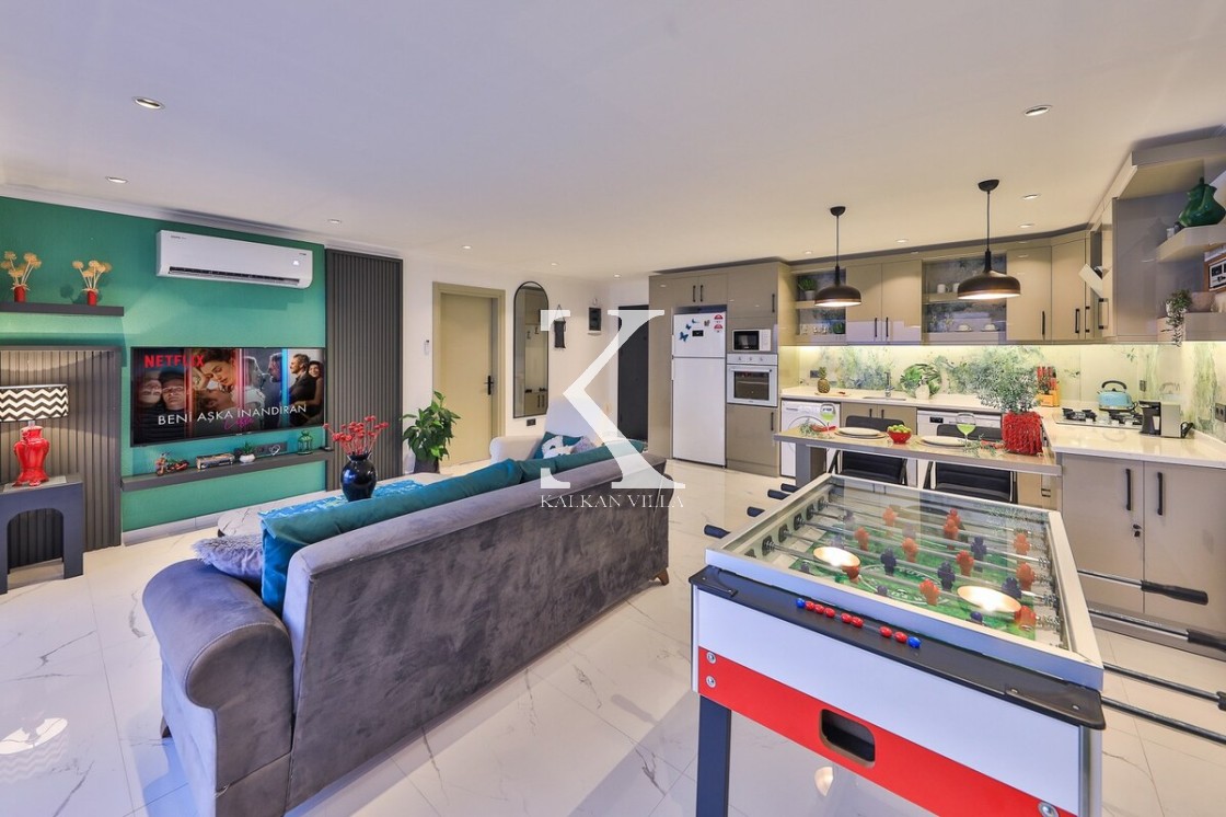 Aydınlık ve ferah salonda konforlu oturma grubu, TV, DVD oynatıcı ve klima bulunmaktadır. Salondan havuz terasına direkt geçiş vardır.