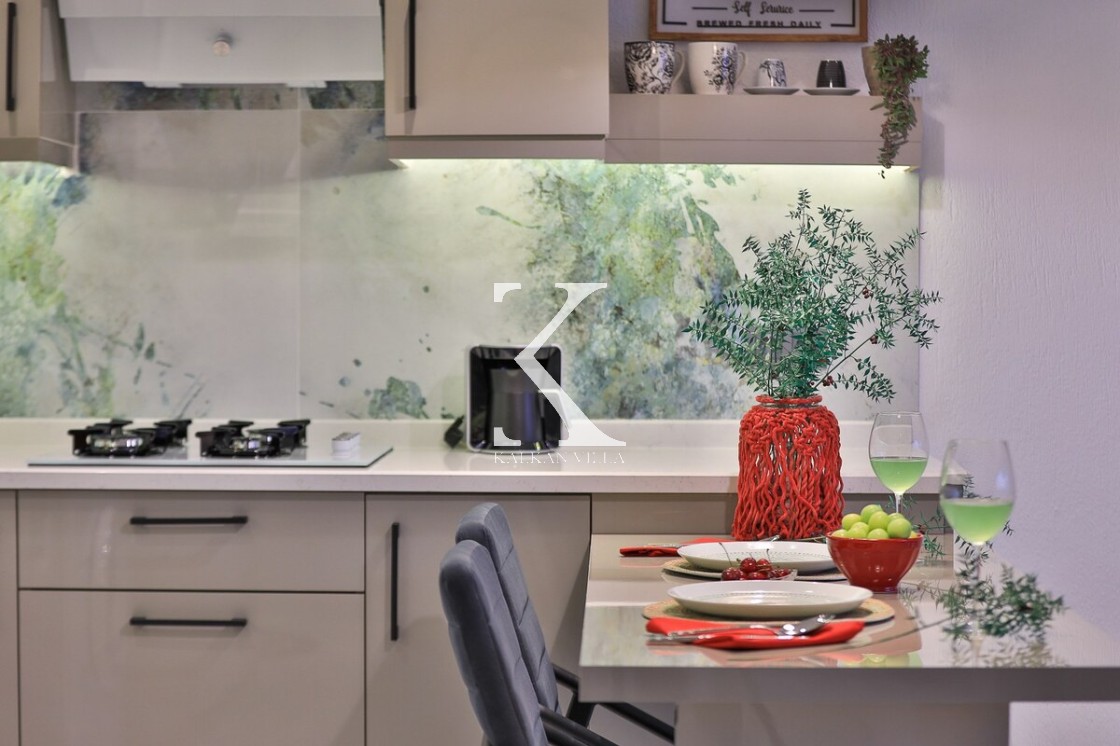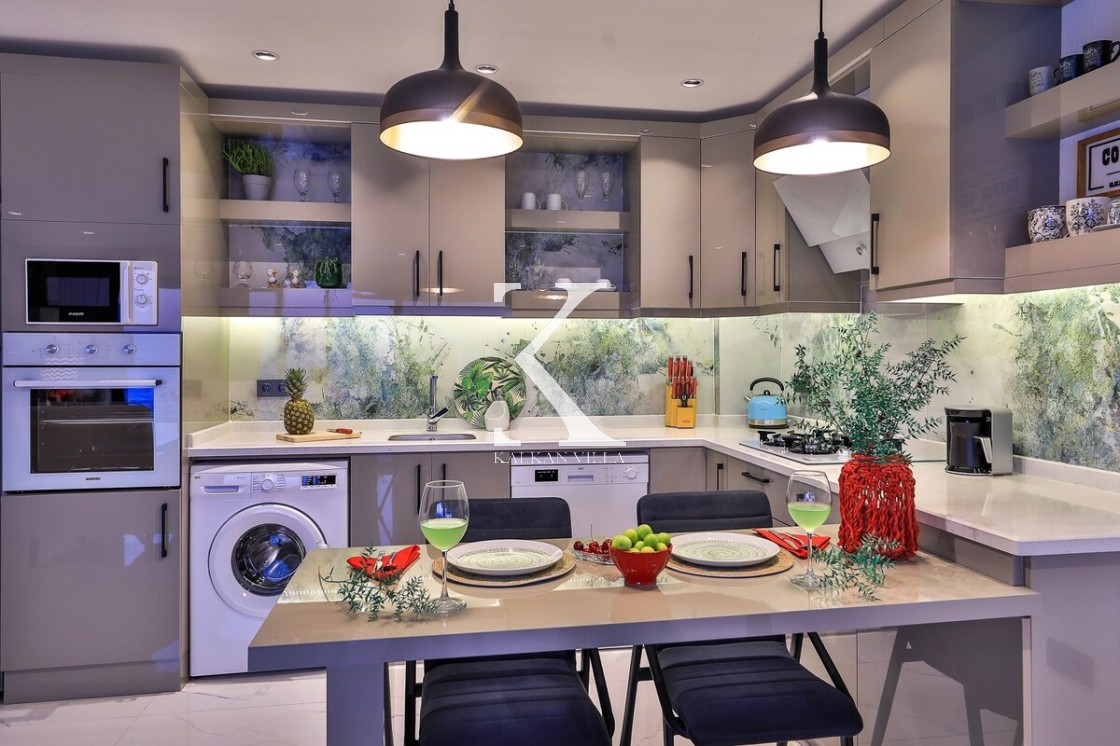 Modern dizayn edilmiş Amerikan mutfakta; buzdolabı, bulaşık makinesi, ocak, fırın, mikrodalga fırın, tost makinesi, su ısıtıcısı, yemek masası, yemek takımı ve yemek pişirme araç gereçleri yer almaktadır.
