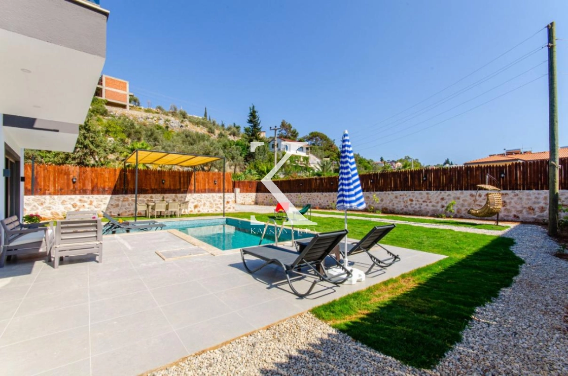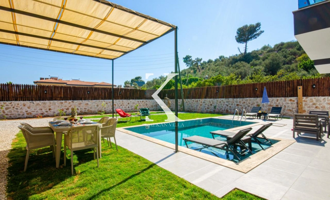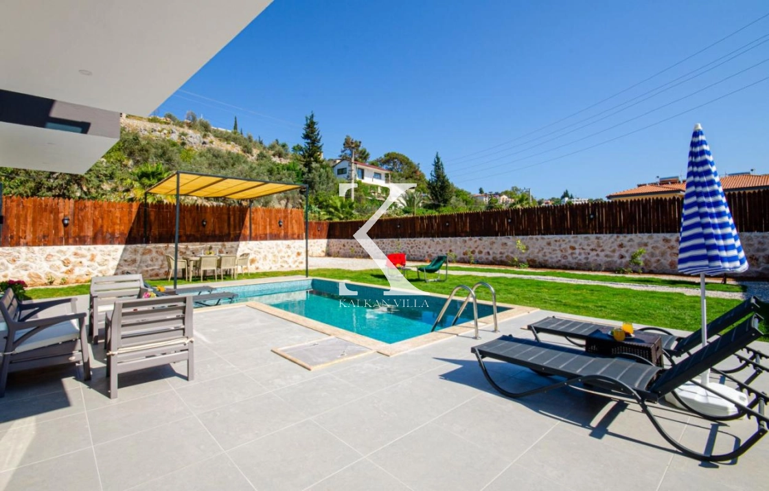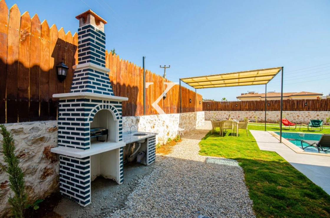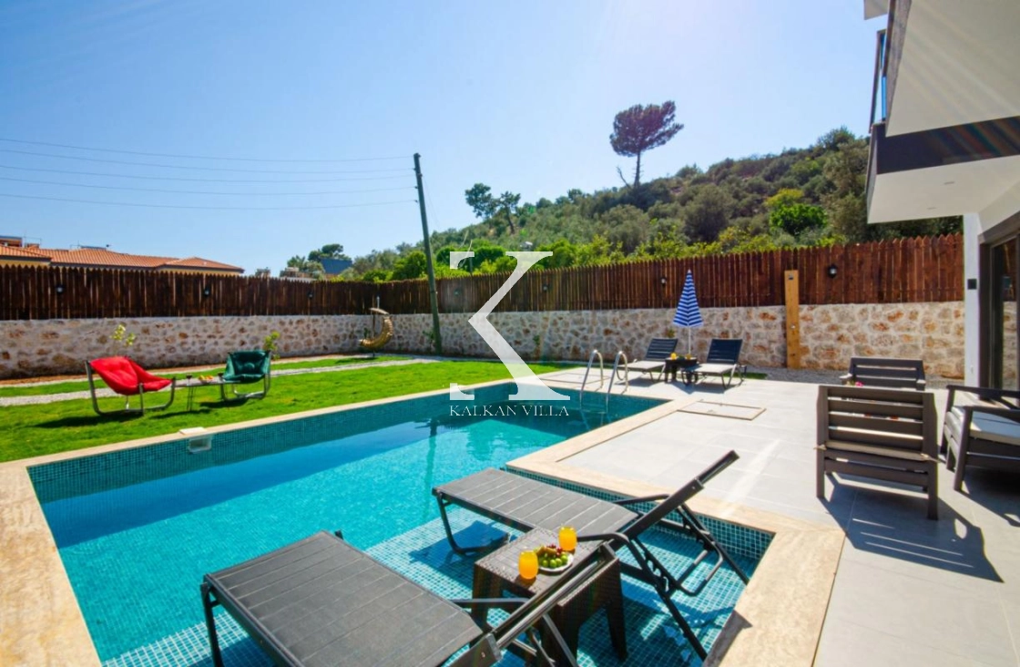 Özel yüzme havuzu, şezlonglar, şemsiye, salıncak, bahçe yemek masası, oturma grubu, mangal ve langırt bulunmaktadır.