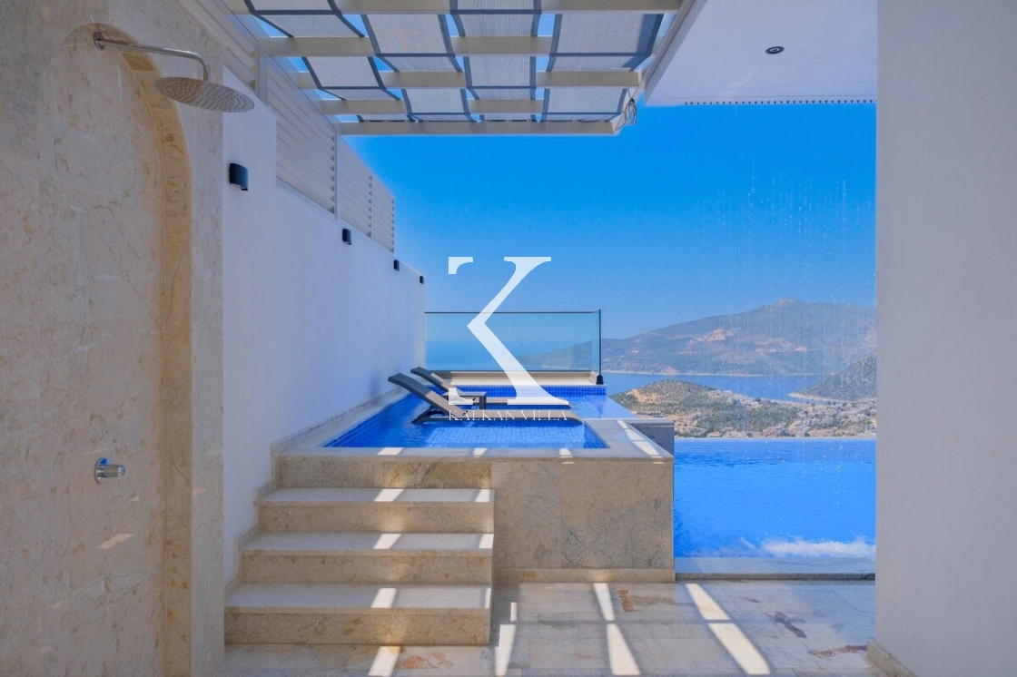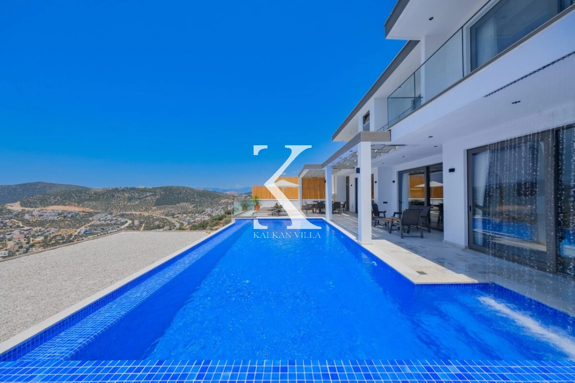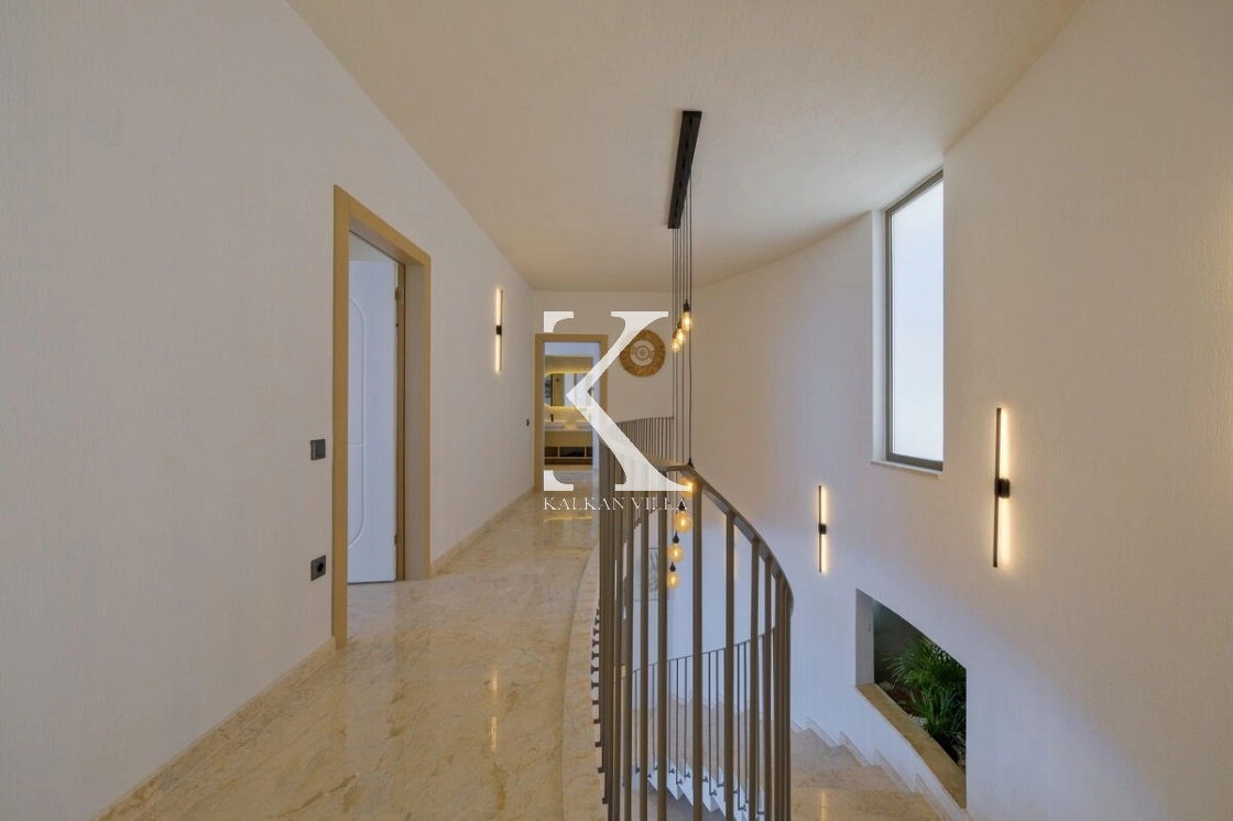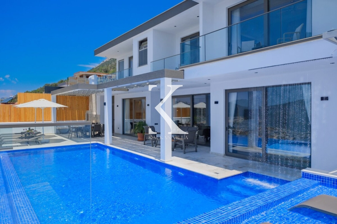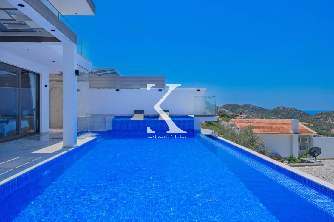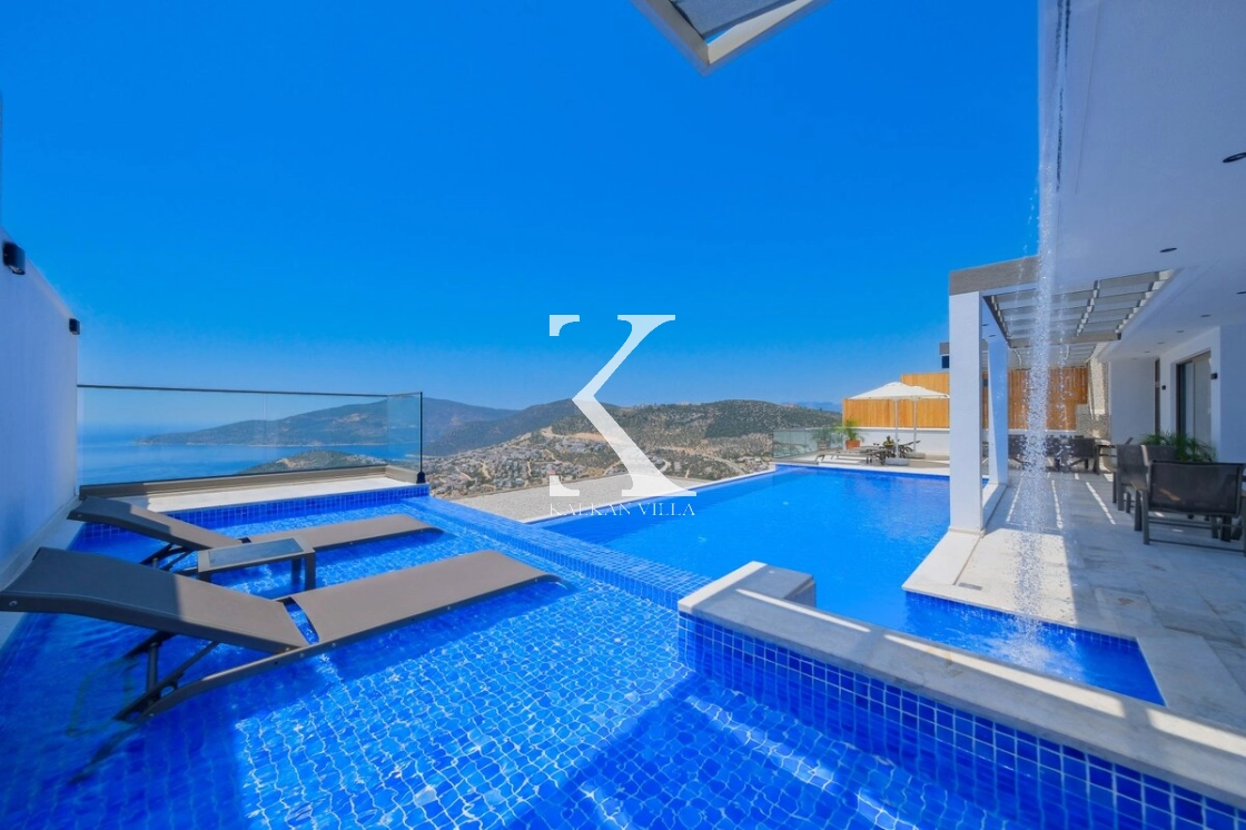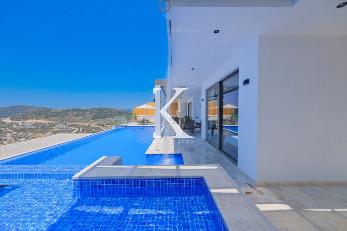 Villanın büyüleyici deniz ve şehir manzarası, özel havuzu, jakuzili havuzu, şelale detayı ve sauna imkânı, konuklarına benzersiz bir tatil deneyimi yaşatır.