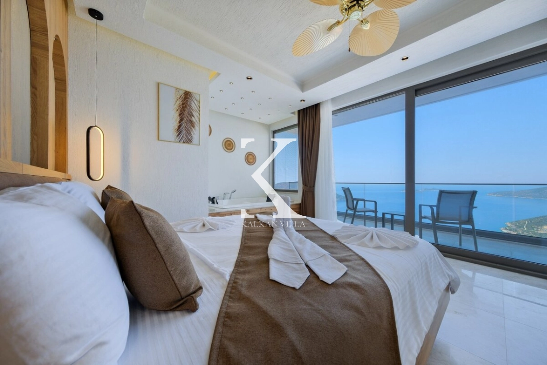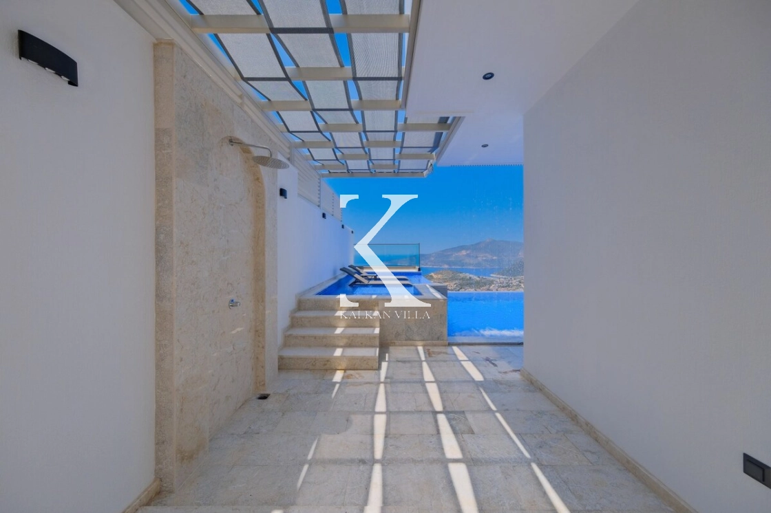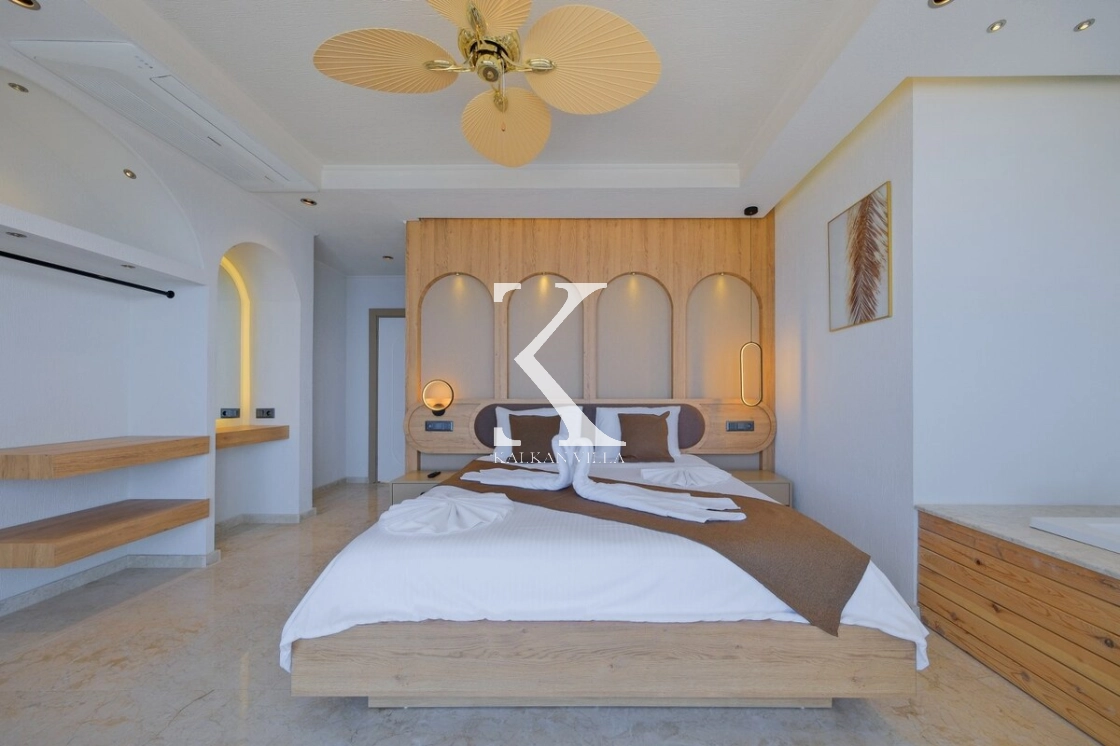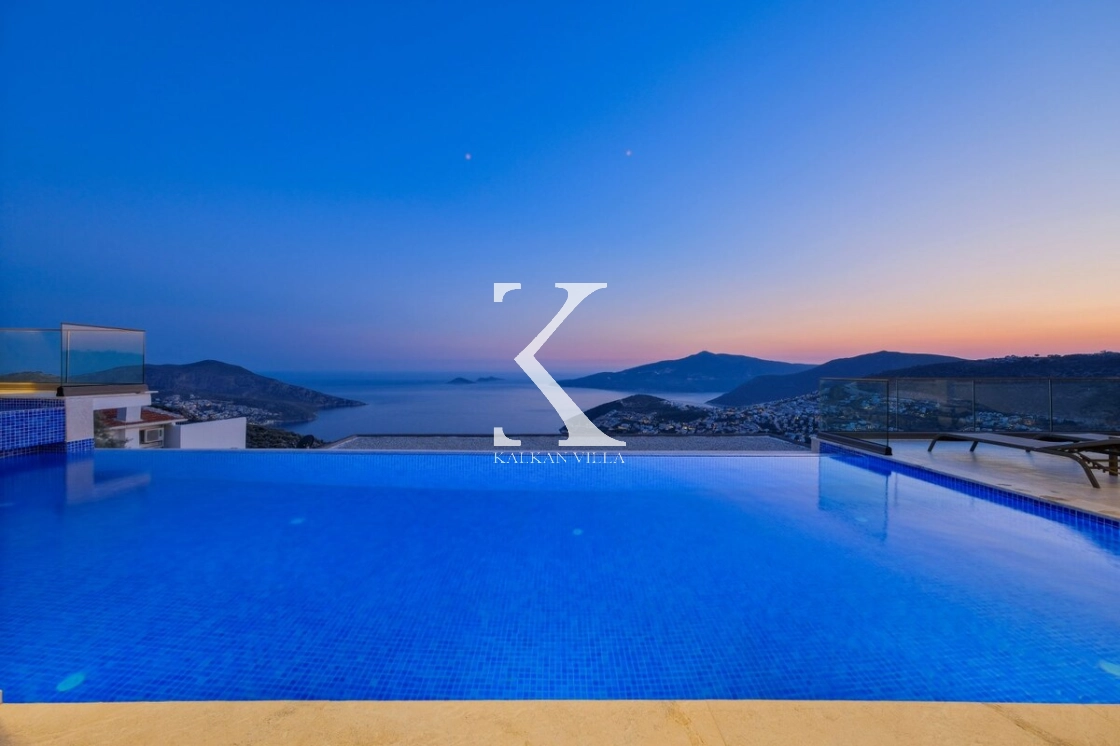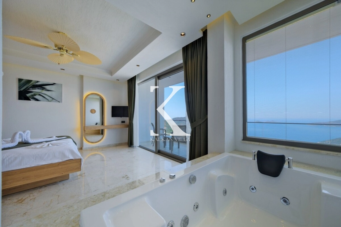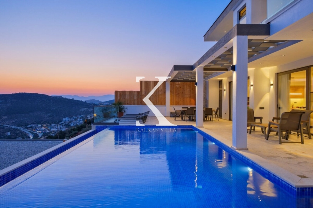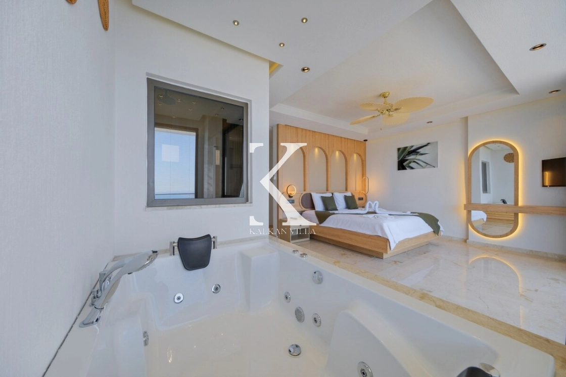 Villanın büyüleyici deniz ve şehir manzarası, özel havuzu, jakuzili havuzu, şelale detayı ve sauna imkânı, konuklarına benzersiz bir tatil deneyimi yaşatır.