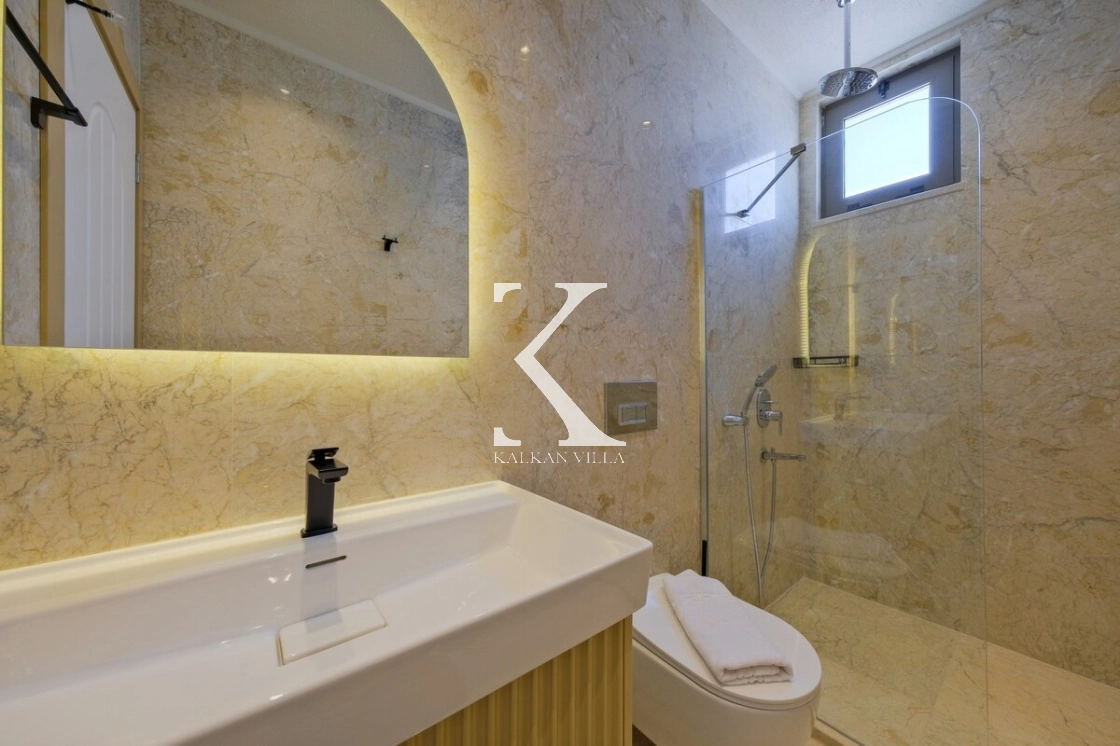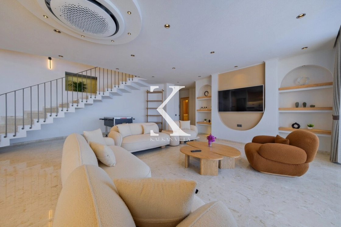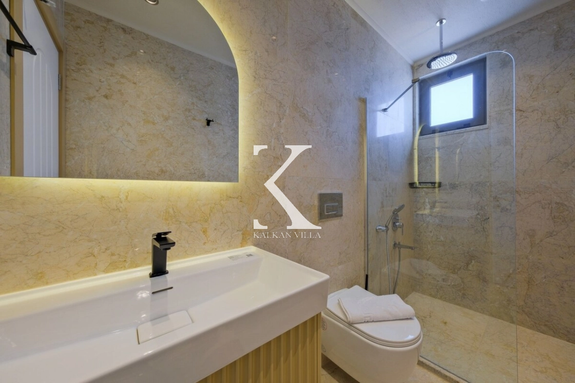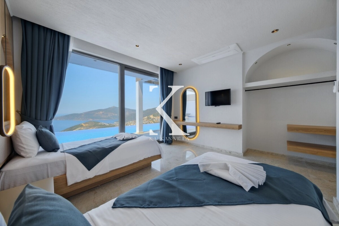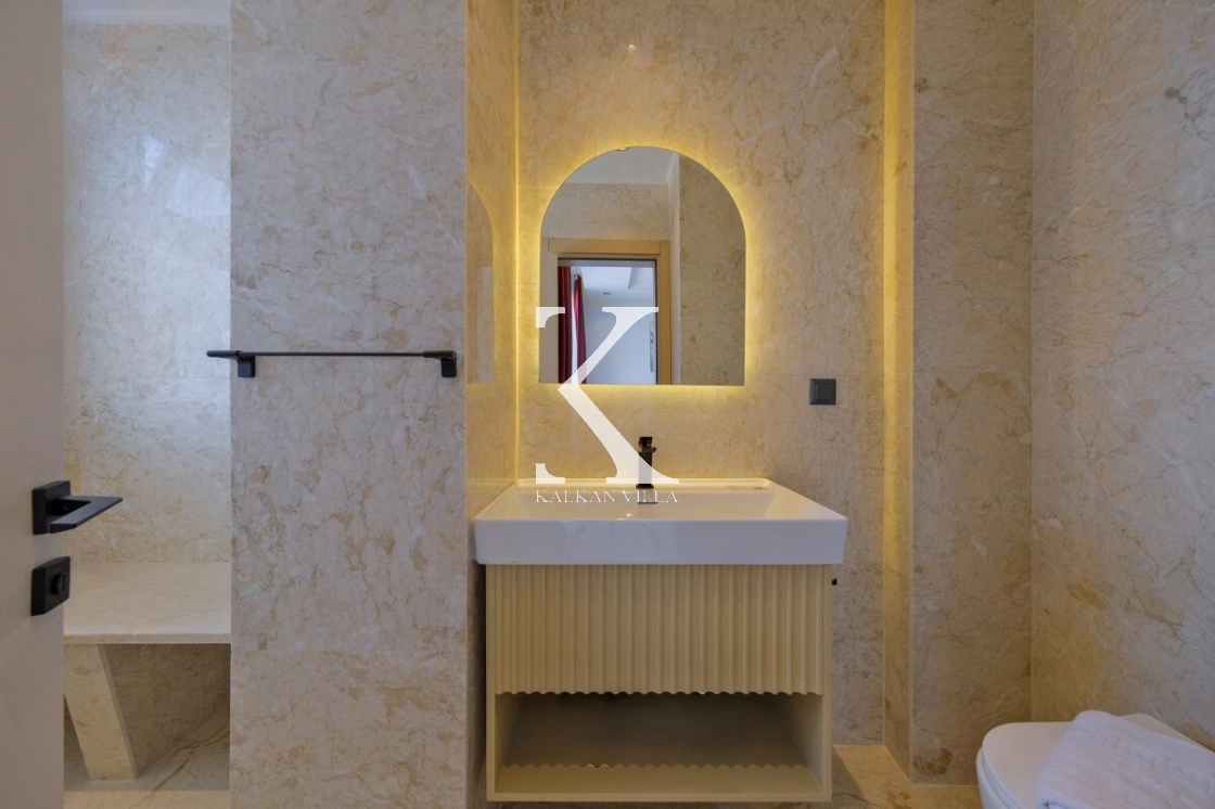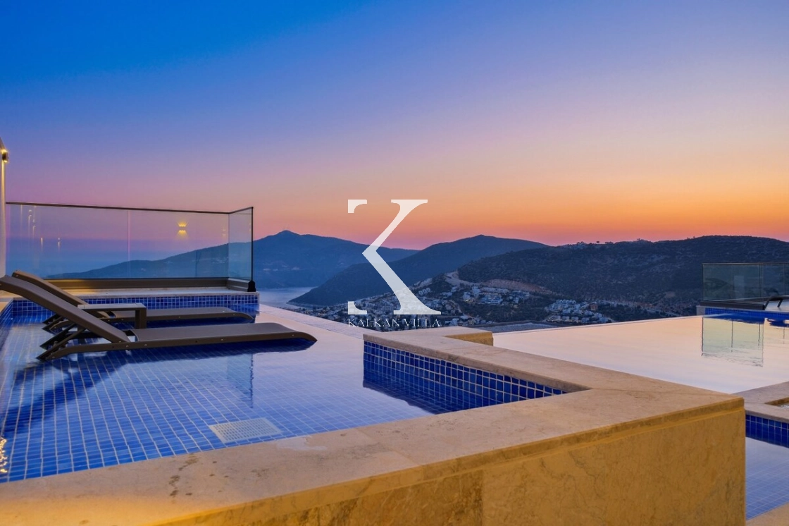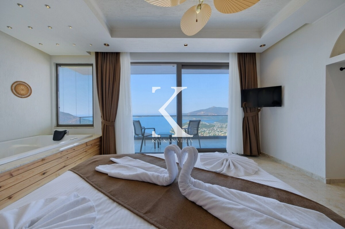 Villanın büyüleyici deniz ve şehir manzarası, özel havuzu, jakuzili havuzu, şelale detayı ve sauna imkânı, konuklarına benzersiz bir tatil deneyimi yaşatır.