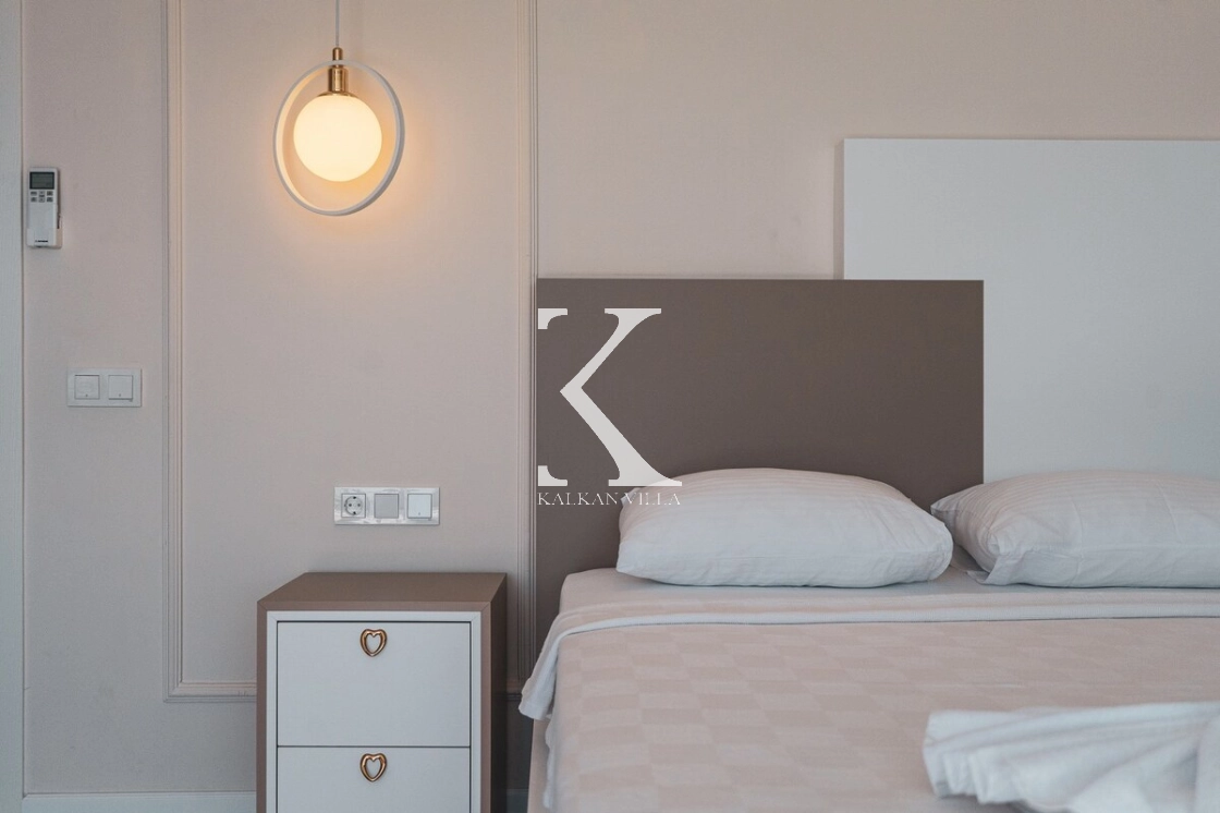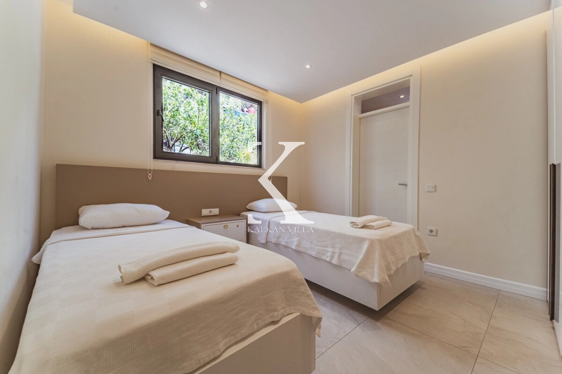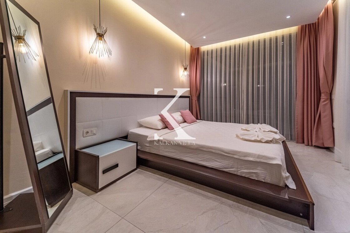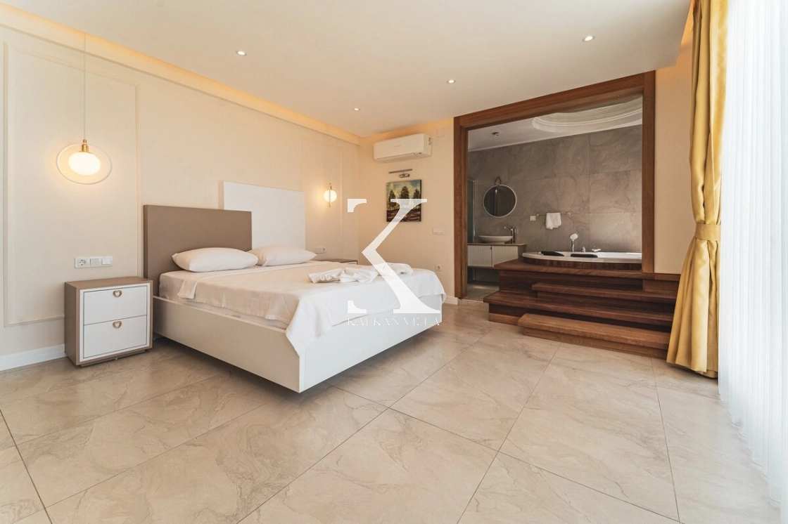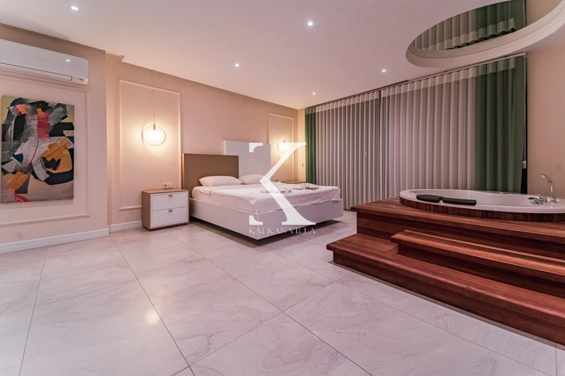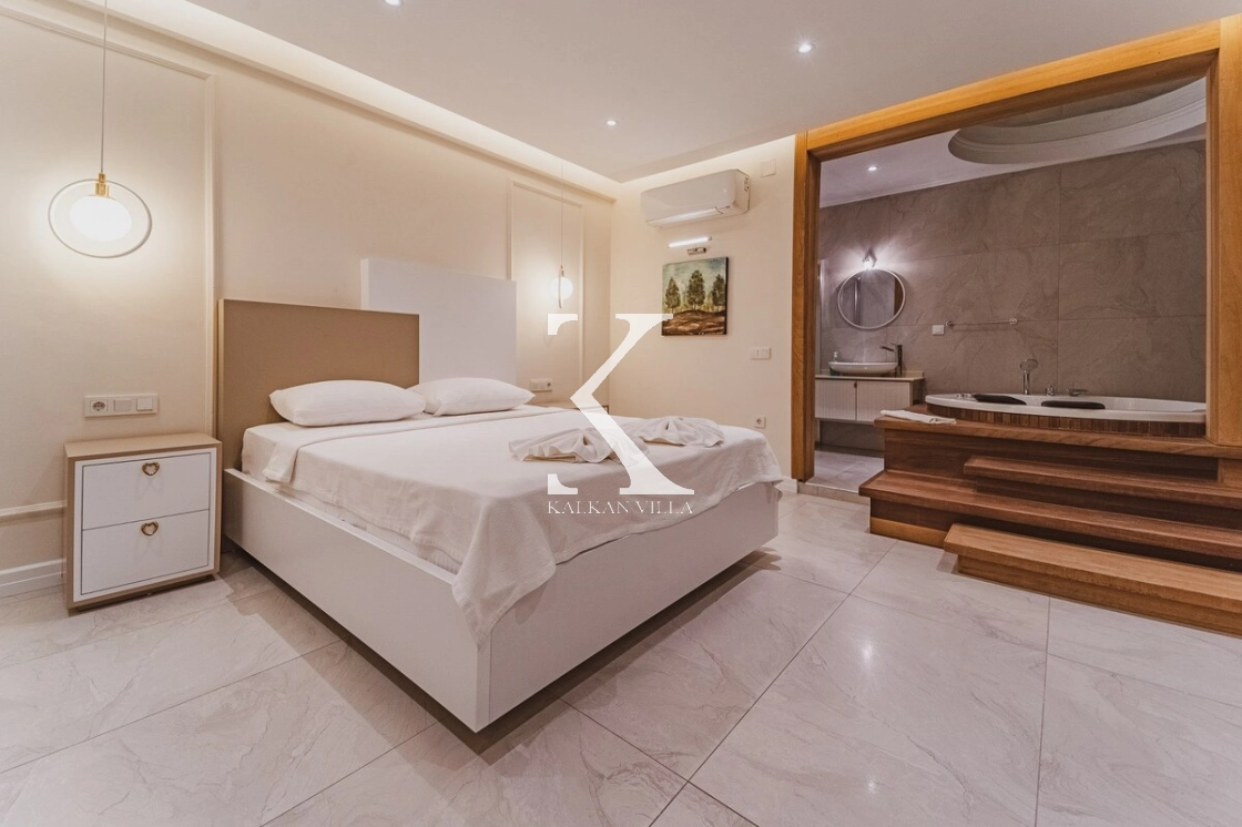 Modern mobilyalarla döşenmiş iç mekânın iki yatak odasında özel jakuzi yer almakta olup, konforlu bir tatil deneyimi yaşatmak için özenle tasarlanmıştır.