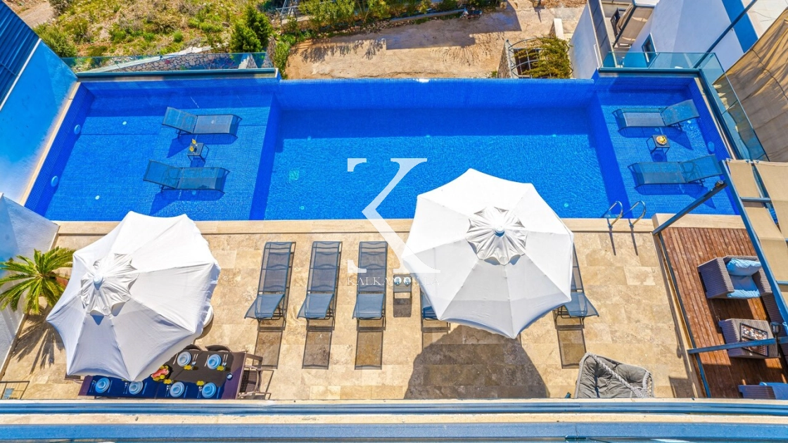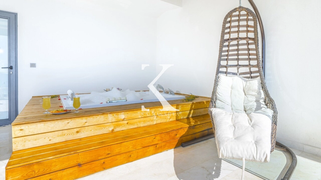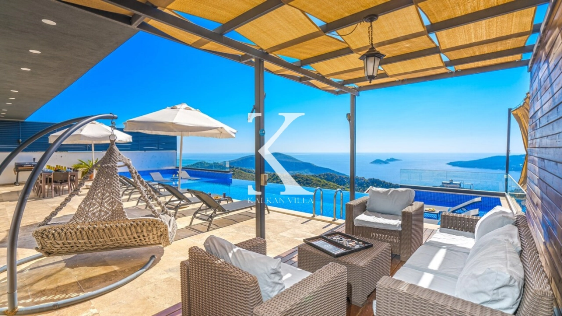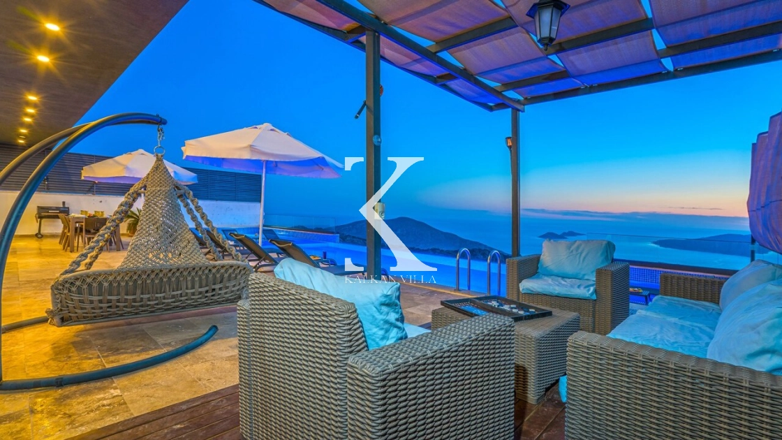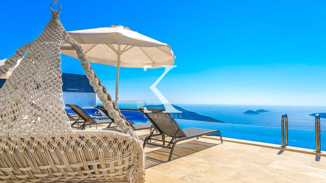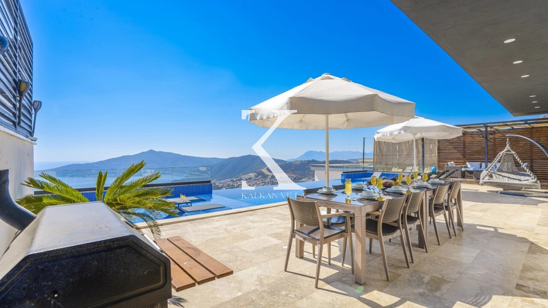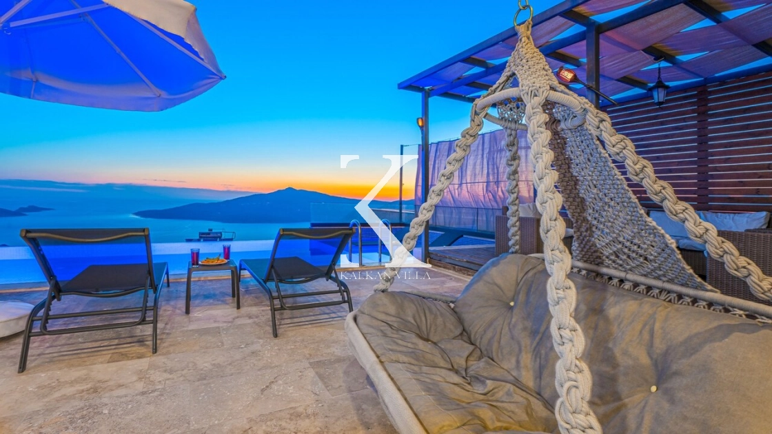 Villanın dış alanında sonsuzluk havuzu, şezlonglar, salıncak, barbekü alanı ve manzara eşliğinde yemek masası bulunmaktadır.