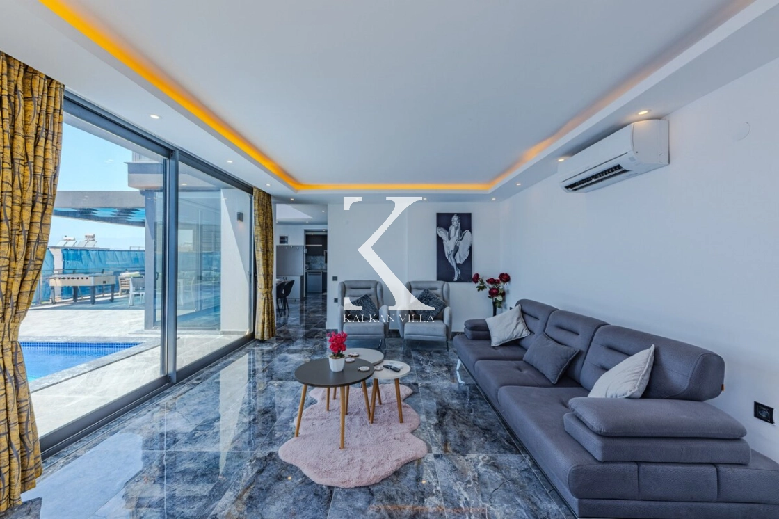 Salondan havuz terasına direkt çıkış bulunmakta olup, iç ve dış yaşam alanları keyifli bir şekilde birleşmektedir.